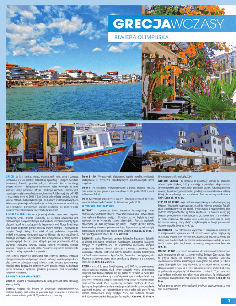 grecJaWCZASY riwiera olimpijsKa GRECJA to kraj słońca, morza, starożytnych ruin, wina i zabawy. uznawana jest za kolebkę zachodniej cywilizacji i miejsce narodzin demokracji, filozofii, sportów, polityki i dramatu. Grecja ma długą, bogatą historię i dziedzictwo kulturowe, które wpłynęło na inne kultury europy, północnej afryki i Bliskiego Wschodu. obecnie jest rozwijającym się krajem będącym członkiem unii europejskiej od 1981 r. oraz strefy euro od 2002 r. dziś Grecję odwiedzają turyści z całego świata, zarówno na kontynencie jak i na licznych wspaniałych wyspach. Wiele pięknych miejsc oferuje Grecja za dnia, ale zarówno sami Grecy jak i przybysze prawdziwych uroków doszukują się dopiero nocą w niezliczonych knajpkach, tawernach, dyskotekach... RIWIERA oLIMPIJSKA jest najczęściej odwiedzanym przez turystów regionem Grecji. riwiera olimpijska od zachodu oddzielona jest malowniczym masywem olimpu, a od wschodu szerokimi piaszczystymi plażami łagodnie schodzącymi do lazurowych wód morza egejskiego. nad całym regionem góruje potężny masyw olimpu - najwyższego szczytu Grecji. Każdy, kto miał okazję podziwiać wspaniałe widoki otoczonego chmurami szczytu olimpu nie ma wątpliwości, dlaczego starożytni Grecy właśnie tam umiejscawiali siedzibę swoich najważniejszych bóstw. tym, których pociąga podziwianie dzikiej przyrody, polecamy również wąwóz tempe. Wspaniałe, skaliste urwiska i wijąca się na dole rzeka pinios tworzą razem niesamowity krajobraz, który zapiera dech w piersiach. istnieje tutaj możliwość uprawiania różnorodnych sportów, przeżycia niezapomnianych chwil pełnych radości i zabawy, a na złotych piaskach plaż nawet orzeźwiający napój nabiera smaku nektaru spożywanego niegdyś przez bogów. po pełnych wrażeń dniach czekają na państwa liczne tawerny z pysznymi greckimi potrawami oraz wspaniałym miejscowym winem. RAMoWY PRoGRAM IMPREZY: dzień 1: Wyjazd z polski wg rozkładu jazdy, przejazd przez słowację, Węgry, serbię. dzień 2: przejazd do hotelu w godzinach przedpołudniowych, złożenie bagaży, czas wolny na pierwsze kąpiele morskie i słoneczne, zakwaterowanie ok. godz. 15.00, obiadokolacja i nocleg. dzień 3 – 10: Wypoczynek, plażowanie, kąpiele morskie, możliwość skorzystania z wycieczek fakultatywnych proponowanych przez rezydenta. dzień 11: po śniadaniu wykwaterowanie z pokoi, złożenie bagażu, czas wolny na pożegnanie z greckim słońcem. ok. godz. 18.00 wyjazd w kierunku polski. dzień 12: przejazd przez serbię, Węgry i słowację, przejazd do polski w godzinach nocnych. przyjazd do Katowic ok. godz. 21.00. WYCIECZKI fAKuLtAtYWnE: MEtEoRY - tajemniczy świat imperium bizantyjskiego oraz zachwycające widoki klasztorów „zawieszonych na niebie”. odwiedzając dwa wybrane klasztory (wstęp 3 €/ jeden klasztor) będziemy mogli zapoznać się ze wspaniałą sztuką bizantyjską. podczas wycieczki zobaczymy jak dziś wytwarza się ikony – święte greckie obrazy, które według wierzeń są oknem do Boga. zapoznamy się też z religią ortodoksyjną pielęgnowaną z czcią przez Greków. Cena ok. 30 €/ os. + bilety wstępu do klasztoru, ok. 3 €/ klasztor. SALonIKI - stolica macedonii, centrum kulturalne Bizancjum. saloniki są dzisiaj kwitnącym ośrodkiem handlowym, umiejętnie łączącym tradycje ze współczesnością. to współczesna metropolia miejska, przeplatana śladami historii, zabytkami z okresu rzymskiego: łuk Galeriusza, rotunda, teatr oraz zabytki sakralne: kościoły bizantyjskie, z których najważniejsze to: agia sophia, demetriusz. Wstępujemy do muzeum archeologicznego, gdzie znajdują się eksponat y z macedonii, tracji, tesali. Cena ok. 25 €/ os. AtEnY - wyjazd do serca Grecji bijącego od 3 000 lat, do pierwszego miasta-państwa świata, skąd swoje początki wzięła demokracja. program zwiedzania zaczyna się od portu w pireusie, a następnie przejazd do centrum aten, by wspiąć się na akropol – perłę architektury światowej (wstęp na akropol jest dodatkowo płatny). następnie spacer przez urocze uliczki plaki, najstarszej ateńskiej dzielnicy, do placu syntagma, by podziwiać zmianę warty gwardzistów evzonów, w planie wycieczki znajdują się najważniejsze obiekty takie jak: port pireus, stadion Kalimarmaro, słupy świątyni zeusa, łuk hadriana, akropol. W drodze powrotnej krótki postój w termopilach. Cena ok. 50 €/ os. + bilet wstepu na akropol, ok. 12 €. WIECZóR GRECKI - ta impreza to doskonały sposób na poznanie radości życia Greków, którą wyrażają wspaniałym ekspresyjnym tańcem syrtraki, przy rytmicznych dźwiękach buzuki. to radość jedzenia smacznych potraw typowej kuchni greckiej oraz zakosztowania retsiny, której nie zabraknie przez cały wieczór. podczas zabawy nauka tańca zorby. Cena ok. 25 €/ os. REJS nA SKIAthoS - rejs statkiem wycieczkowym na bajkową wyspę skiathos. Wycieczkę rozpoczyna przejazd do jednego z portów tessalii, gdzie zaokrętujemy się na statek wycieczkowy i rozpoczniemy rejs, podczas którego odbędzie się taniec kapitański. po dotarciu na wyspę skiathos proponujemy krótki spacer na przylądek Bourtsi z widokiem na wieżę zegarową. na wyspie czas wolny następnie rejs na plażę Kukunaries zwaną „złotą plażą” - najładniejszą w Grecji, plażowanie i kąpiele morskie. cena ok. 40 €/ os. WAtERLAnd - to całodniowa wycieczka z przejazdem autokarem do miejscowości tagarades, ok. 20 km od salonik, gdzie znajduje się miasteczko wodne, które oferuje niezapomnianą zabawę zarówno dla dzieci, jak i dla dorosłych. na terenie parku wodnego znajduje się duża ilość basenów, zjeżdżalni, kafejek, restauracji, korty tenisowe. Cena ok. 40 €/ os. Mount AthoS - przejazd autokarem do miejscowości ouranopoli, gdzie rozpoczyna się rejs statkiem wzdłuż Świętej Góry athos. jest to jedyna okazja na zwiedzenie odrębnej republiki mnichów i zobacze