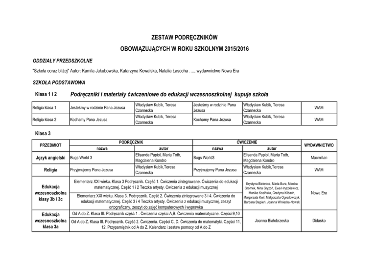 ZESTAW PODRĘCZNIKÓW OBOWIĄZUJĄCYCH W ROKU SZKOLNYM 2015/2016 ODDZIAŁY PRZEDSZKOLNE "Szkoła coraz bliżej" Autor: Kamila Jakubowska, Katarzyna Kowalska, Natalia Łasocha …., wydawnictwo Nowa Era SZKOŁA PODSTAWOWA Klasa 1 i 2 Podręczniki i materiały ćwiczeniowe do edukacji wczesnoszkolnej kupuje szkoła Religia klasa 1 Jesteśmy w rodzinie Pana Jezusa Religia klasa 2 Kochamy Pana Jezusa Władysław Kubik, Teresa Czarnecka Władysław Kubik, Teresa Czarnecka Jesteśmy w rodzinie Pana Jezusa Władysław Kubik, Teresa Czarnecka Władysław Kubik, Teresa Czarnecka Kochamy Pana Jezusa WAM WAM Klasa 3 PODRĘCZNIK PRZEDMIOT nazwa Język angielski Bugs World 3 Religia Edukacja wczesnoszkolna klasy 3b i 3c Przyjmujemy Pana Jezusa autor Elisanda Papiol, Maria Toth, Magdalena Kondro Władysław Kubik,Teresa Czarnecka ĆWICZENIE nazwa Bugs World3 Przyjmujemy Pana Jezusa Elementarz XXI wieku. Klasa 3 Podręcznik. Część 1. Ćwiczenia zintegrowane. Ćwiczenia do edukacji matematycznej. Część 1 i 2 Teczka artysty. Cwiczenia z edukacji muzycznej Elementarz XXI wieku. Klasa 3. Podręcznik. Część 2. Ćwiczenia zintegrowane 3 i 4. Ćwiczenia do edukacji matematycznej. Część 3 i 4 Teczka artysty. Ćwiczenia z edukacji muzycznej, zeszyt ortograficzny, zeszyt do zajęć komputerowych i wyprawka Od A do Z. Klasa III. Podręcznik część 1 . Ćwiczenia części A,B. Ćwiczenia matematyczne. Części 9,10 Edukacja wczesnoszkolna Od A do Z. Klasa III. Podręcznik. Część 2. Ćwiczenia. Części C, D. Ćwiczenia do matematyki. Części 11, klasa 3a 12. Przypamiętnik od A do Z. Kalendarz i zestaw pomocy od A do Z autor Elisanda Papiol, Maria Toth, Magdalena Kondro Władysław Kubik,Teresa Czarnecka WYDAWNICTWO Macmillan WAM Krystyna Bielenica, Maria Bura, Monika Gromek, Nina Gryzoń, Ewa Hryszkiewicz, Monika Kosińska, Grażyna Kilbach, Małgorzata Kwil, Małgorzata Ogrodowczyk, Barbara Stępień, Joanna Winiecka-Nowak Nowa Era Joanna Białobrzeska Didasko Klasa 4 Podręczniki i materiały ćwiczeniowe kupuje szkoła Religia Zaproszeni przez Boga z serii Drogi Przymierza Zbigniew Marek Zaproszeni przez Boga Zbigniew marek WAM Klasa 5 PODRĘCZNIK PRZEDMIOT nazwa ĆWICZENIE autor Historia i społeczeństwo My i historia Bogumiła Olszewska, Wiesława Surdyk-Fertsch Język angielski New Hot Spot 2 Colin Granger Język polski Między nami 5 Matematyka Matematyka 5 nazwa My i historia Bogumiła Olszewska, Wiesława Surdyk-Fertsch New Hot Spot 2 Colin Granger Między nami. Zeszyt ćwiczeń Agnieszka Łuczak i Anna Murdzek. cz. 1 i 2 Agnieszka Łuczak, Anna Murdzek Między nami. Ortografia. Anna Halasz i Piotr Borys Zasady i ćwiczenia Małgorzata Dobrowolska, Marta Jucewicz, Piotr Zarzycki Liczby całkowite i ułamki cz. 1 Małgorzata Dobrowolska, Piotr i 2. Geometria, zbiór zadań Zarzycki Przyroda Tajemnice przyrody 5 Janina Ślosarczyk, Ryszard Kozik, Tajemnice przyrody 5 Feliks Szlajfer ćwiczenia cz. 1 i 2 Religia Obdarowani przez Boga Zbigniew Marek Muzyka Kontynuacja podręcznika z kl. IV Plastyka Kontynuacja podręcznika z kl. IV Zajęcia techniczne Kontynuacja podręcznika z kl. IV Zajęcia komputerowe Kontynuacja podręcznika z kl. IV autor Obdarowani przez Boga – zeszyt ucznia cz. 1: Golonko Jolanta, Marszał Dominik, Moździerz Urszula. cz. 2: Marszał Dominik, Paczkowska Teresa, Stawarz Joanna Zbigniew Marek WYDAWNICTWO PWN Macmillan Gdańskie Wydawnictwo Oświatowe Gdańskie Wydawnictwo Oświatowe Nowa Era WAM Klasa 6 PODRĘCZNIK PRZEDMIOT nazwa ĆWICZENIE autor nazwa Historia i społeczeństwo My i historia Bogumiła Olszewska, Wiesława Surdyk-Fertsch Język angielski „New Hot Spot” 3 Colin Granger, Catherine Stannett „New Hot Spot” 3 Język polski Między nami 6 My i historia Między nami. Zeszyt ćwiczeń cz. 1 i 2 Agnieszka Łuczak, Anna Murdzek Między nami. Ortografia. Zasady i cwiczenia. Liczby i wyrażenia Małgorzata Dobrowolska, Marta algebraiczne cz. 1 i 2. Jucewicz, Piotr Zarzycki Geometria. Zbiór zadań autor Bogumiła Olszewska, Wiesława Surdyk-Fertsch Colin Granger, Catherine Stannett Agnieszka Łuczak i Anna Murdzek. Anna Halasz i Piotr Borys PWN Macmillan Gdańskie Wydawnictwo Oświatowe Małgorzata Dobrowolska, Piotr Zarzycki Gdańskie Wydawnictwo Oświatowe Nowa Era Matematyka Matematyka 6 Przyroda Tajemnice przyrody 6 Joanna Stawarz, Feliks Szlajfer, Hanna Kowalczyk Tajemnice przyrody Joanna Stawarz, Feliks Szlajfer, Hanna Kowalczyk Religia Przemienieni przez Boga Zbigniew Marek Przemienieni przez Boga Zbigniew Marek Zajęcia techniczne Kontynuacja podręcznika z kl. IV Plastyka Kontynuacja podręcznika z kl. IV Zajęcia komputerowe Kontynuacja podręcznika z kl. IV WYDAWNICTWO WAM GIMNAZJUM KLASA I PRZEDMIOT Religia Podręczniki i materiały ćwiczeniowe do kupuje szkoła PODRĘCZNIK nazwa „Jezus Chrystus drogą, prawdą i życiem” ĆWICZENIE autor Herran Pedro de la nazwa autor --- WYDAWNICTWO --- Apostolicum KLASA II PRZEDMIOT PODRĘCZNIK ĆWICZENIE nazwa autor nazwa autor Biologia Bliżej biologii cz. 2 Ewa Pyłka-Gutowska, Ewa Jastrzębska Bliżej biologii cz. 2 Praca zbiorowa Chemia Chemia Nowej Ery. Część 1. Podręcznik dla gimnazjum Jan Kulawik, Teresa Kulawik, Maria Litwin Fizyka Spotkania z fizyką cz 2 i 3 Geografia Grażyna Francuz-Ornat, Teresa Spotkania z fizyką cz. 2 i 3 Kulawik, Maria Nowotny-Różańska Planeta Nowa. Podręcznik do geografii Dawid Szczypiński, Mirosław Planeta 2 Nowa, atlas z dla klasy drugiej gimnazjum, cz. 2 Wójtowicz poprzednich lat. Historia Historia. Podręcznik dla gimnazjum. Klasa II. Wydanie zmienione Jacek Chachaj, Janusz Drob, Leszek Wojciechowski Język angielski Voices 3. Student's Book Catherine McBeth Język niemiecki Magnet 2 Słowa na czasie. Podręcznik do kształcenia literackiego i kulturowego dla klasy drugiej gimnazjum Giorgio Motta Język polski Matematyka Matematyka Europejczyka Zajęcia techniczne Zajęcia artystyczne Bez podręcznika ------- WSiP Grażyna Francuz-Ornat, Teresa Now