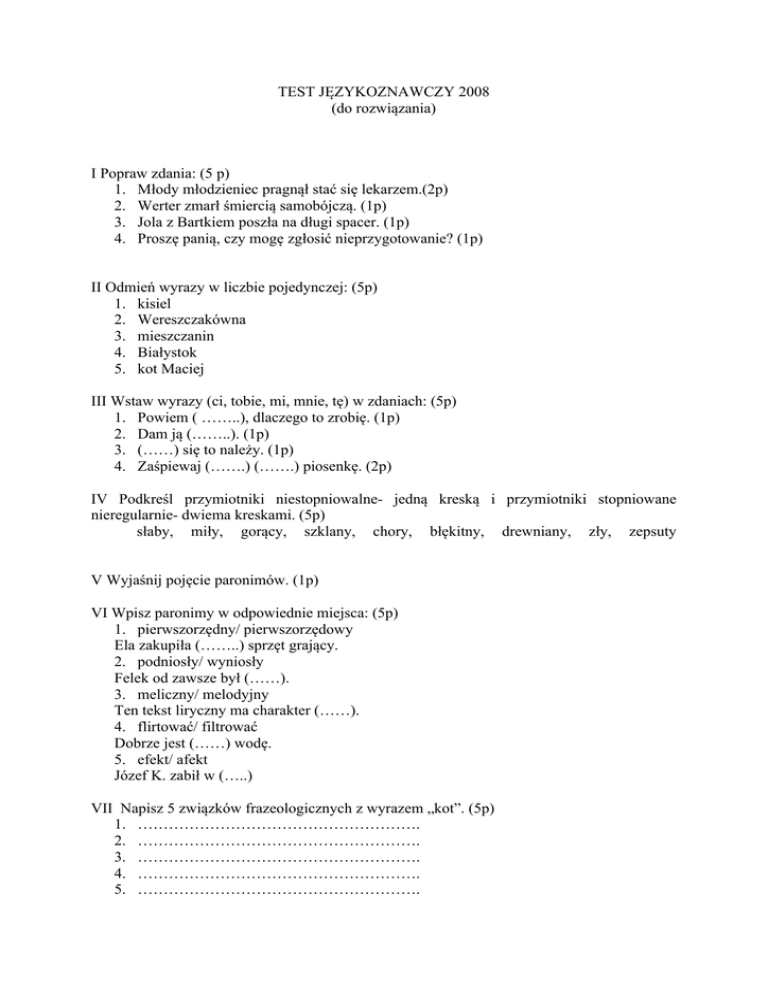 TEST JĘZYKOZNAWCZY 2008 (do rozwiązania) I Popraw zdania: (5 p) 1. Młody młodzieniec pragnął stać się lekarzem.(2p) 2. Werter zmarł śmiercią samobójczą. (1p) 3. Jola z Bartkiem poszła na długi spacer. (1p) 4. Proszę panią, czy mogę zgłosić nieprzygotowanie? (1p) II Odmień wyrazy w liczbie pojedynczej: (5p) 1. kisiel 2. Wereszczakówna 3. mieszczanin 4. Białystok 5. kot Maciej III Wstaw wyrazy (ci, tobie, mi, mnie, tę) w zdaniach: (5p) 1. Powiem ( ……..), dlaczego to zrobię. (1p) 2. Dam ją (……..). (1p) 3. (……) się to należy. (1p) 4. Zaśpiewaj (…….) (…….) piosenkę. (2p) IV Podkreśl przymiotniki niestopniowalne- jedną kreską i przymiotniki stopniowane nieregularnie- dwiema kreskami. (5p) słaby, miły, gorący, szklany, chory, błękitny, drewniany, zły, zepsuty V Wyjaśnij pojęcie paronimów. (1p) VI Wpisz paronimy w odpowiednie miejsca: (5p) 1. pierwszorzędny/ pierwszorzędowy Ela zakupiła (……..) sprzęt grający. 2. podniosły/ wyniosły Felek od zawsze był (……). 3. meliczny/ melodyjny Ten tekst liryczny ma charakter (……). 4. flirtować/ filtrować Dobrze jest (……) wodę. 5. efekt/ afekt Józef K. zabił w (…..) VII Napisz 5 związków frazeologicznych z wyrazem „kot”. (5p) 1. ………………………………………………. 2. ………………………………………………. 3. ………………………………………………. 4. ………………………………………………. 5. ………………………………………………. VIII Jak powiesz zamiast sformułowania „widzę dziecko”: (1p) A. widzę go B. widzę jego C. widzę je D. Wszystkie formy są poprawne. IX Zaznacz poprawne zakończenie zdania: Mieszkają razem z ojcem, matką i … (1p) A. obu rodzeństwem B. obojgiem rodzeństwa C. oboje rodzeństwem D. obojgiem rodzeństwem X Dokończ przysłowie: Gość w dom: (1p) A. a gospodarza nie ma B. Bóg w dom C. a ja sam D. kobyłka u płota XI Kiedy licho nie śpi, dobrze jest: (1p) A. mieć się na baczności B. śnić o niebieskich migdałach C. bawić się w najlepsze D. zapomnieć o bożym świecie XII W którym zdaniu ukrył się błąd? (1p) A. Żartowaliśmy przed i po obiedzie. B. Żartowaliśmy przed obiadem i po nim. C. Żartowaliśmy przed obiadem i po jego zjedzeniu. D. Wszystkie zdania są poprawne. XIII Gdzie ukrył się błąd? Spróbuj go poprawić. (5p) A. dziurka od klucza. B. pastylki na grypę C. uderzyłem się w skrzynkę D. mieszkam na ulicy południowej E. książki do pierwszej klasy F. syrop na kaszel G. adres zamieszkania H. fakt autentyczny I. okulary słoneczne J. preparat przeciw owadom XIV Dopisz liczbę mnogą do wyrazów: (5p) A. inżynier B. szewc C. profesor D. prawnuk E. szlachcic XV Wybierz i podkreśl formę poprawną: (10p) żołądź/ żołędź łabądź/ łabędź ta goleń/ ten goleń ta rodzynka/ ten rodzynek sweter/ sweter pomarańcz/ pomarańcza podkoszulek/ podkoszulka ta opus/ ten opus ta torbiel/ ten torbiel ta gardziel/ ten gardziel XVI Liczby zastąp wyrazami, a rzeczownik w nawiasie postaw w odpowiedniej formie. (5p) 20 (dzieci) narzędnik: 121 (słonie) dopełniacz: 3 (rodzice) miejscownik: 2 (grabie) mianownik: 5 (kurczęta) dopełniacz: XVII Podane zdania przekształć w równoważniki zdań bądź wypowiedzenia z imiesłowowymi równoważnikami zdań. (5p) 1. Czy Zosia jest w domu? 2. Za godzinę odjeżdża pociąg. 3. Adela zawładnęła domem. 4. Paweł łowił ryby i czytał książkę. 5. Dyrektor zamachnął się, więc zdmuchnął świeczkę. XVIII Dopisz formę dopełniacza l. poj. do wyrazów: (5p) 1. poezja 2. epopeja 3. kwestia 4. linia 5. racja XIX Ułóż 5 logicznych określeń do wyrazu „kampania”. (5p) 1. 2. 3. 4. 5. XX Która forma jest poprawna? (5p) masielniczka/ maselniczka karnister/ kanister pościelać/ pościelić babington/ badminton włączamy/ włanczamy XXI Napisz formę dopełniaczową wyrazów: (1p) wszamyszXXII Jaką częścią mowy jest podkreślony wyraz w zdaniu: (1p) Dżdżu krople padają i tłuką w me okno. XXIII Która forma jest poprawna : pierwsza, druga czy obie? (10p) 1. wypłucz / wypłukaj 2. studiuje w akademii / studiuje na akademii 3. strajk w uniwersytecie / strajk na uniwersytecie 4. zebranie w auli / zebranie na auli 5. pracuje w hucie / pracuje na hucie 6. bunt wobec wojny / bunt przeciwko wojnie 7. zdanżać do szkoły / zdążać do szkoły 8. przyglądam się Krakowowi / przyglądam się Krakowu 9. Piotrek ma ogromne możliwości / potencjał możliwości 10. ta brew/ ta brwia XXIV Popraw zdania. (5p) 1. Nie widziałem Bruna od dwóch tygodni. 2. Ta kontrola nie przypadła mi do gustu. 3. Kasia siedziała na tylnim siedzeniu. 4. Piotrek nie potrafił wymyśleć sensownego wytłumaczenia. 5. Bardzo polubiłem tą postać baśniową. XXV Zamień zapożyczenia bądź kalki odpowiednikami polskimi: (2p) 1. -Ten T-shirt jest dla mnie odpowiedni -Dokładnie 2. –Mój menager bardzo się stara.