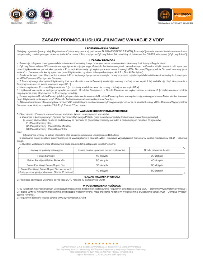 ZASADY PROMOCJI USŁUGI „FILMOWE WAKACJE Z VOD” I. POSTANOWIENIA OGÓLNE Niniejszy regulamin (zwany dalej „Regulaminem”) dotyczący promocji pod nazwą FILMOWE WAKACJE Z VOD („Promocja”) określa warunki świadczenia audiowizualnych usług medialnych typu „video na żądanie” w ramach Promocji przez Cyfrowy Polsat SA z siedzibą: ul. Łubinowa 4a, 03-878 Warszawa („Cyfrowy Polsat”) II. ZASADY PROMOCJI a.Promocja polega na udostępnianiu Materiałów Audiowizualnych w promocyjnej cenie, na warunkach określonych niniejszym Regulaminem. b.Cyfrowy Polsat udziela 50% rabatu na wypożyczenie pojedynczego Materiału Audiowizualnego od cen wskazanych w Cenniku, dzięki czemu środki wpłacone przez Użytkownika na poczet skorzystania z Promocji, które mają być wykorzystane w ramach usługi „VOD - Domowa Wypożyczalnia Filmowa” zostaną ”podwojone” o równowartość kwoty wpłaconej przez Użytkownika, zgodnie z tabelą wskazaną w pkt III.2. („Środki Pieniężne”). c. Środki wpłacone przez Użytkownika w ramach Promocji mogą być przeznaczone tylko na wypożyczenie pojedynczych Materiałów Audiowizualnych, dostępnych w „VOD - Domowej Wypożyczalni Filmowej. d.Z Promocji mogą skorzystać Użytkownicy, którzy w okresie trwania Promocji zawierając umowę o której mowa w pkt III.1.a) zadeklarują chęć skorzystania z Promocji oraz uiszczą kwotę wskazaną w pkt III.1.b). e.Na skorzystanie z Promocji Użytkownik ma 3 (trzy) miesiące od dnia zawarcia umowy o której mowa w pkt III.1.a) f. Użytkownik nie może w żadnym przypadku uzupełnić Środków Pieniężnych, a Środki Pieniężne nie wykorzystane w okresie 3 (trzech) miesięcy od dnia przystąpienia przez Użytkownika do Promocji przepadają. g.Po wykorzystaniu Środków Pieniężnych lub gdy pozostała kwota w ramach Środków Pieniężnych nie jest wystarczająca do wypożyczenia Materiału Audiowizualnego, Użytkownik może wypożyczyć Materiału Audiowizualne za kwoty wskazane w Cenniku. h.Aktualna lista filmów oferowanych w ramach VOD jest dostępna na stronie www.cyfrowypolsat.pl/vod. oraz na kanałach usługi VOD – Domowa Wypożyczalnia Filmowa, po wciśnięciu przycisku ‘i’ lub ‘Epg’, ‘Guide’, ‘G’ na pilocie. III. WARUNKI SKORZYSTANIA Z PROMOCJI 1.Skorzystanie z Promocji jest możliwe po spełnieniu łącznie następujących warunków: a. Zawarcia w Autoryzowanym Punkcie Sprzedaży Cyfrowego Polsatu (lista punktów sprzedaży dostępna na www.cyfrowypolsat.pl) (i) umowy abonenckiej, na okres podstawowy co najmniej 15 (piętnastu) miesięcy, na jeden z następujących Pakietów Programów: (1) Pakiet Familijny albo (2) Pakiet Familijny i Pakiet Relax Mix albo (3) Pakiet Familijny i Pakiet Super Film; oraz (ii) zawarcia umowy na zakup Dekodera albo zawarcie umowy na udostępnienie Dekodera. b. dokonanie wpłaty środków przeznaczonych na wykorzystanie w ramach „VOD – Domowa Wypożyczalnie Filmowa” w kwocie wskazanej w pkt. 2 – kolumna druga. 2. Kwotom wpłaconym przez Użytkownika będą odpowiadały następujące Środki Pieniężne: Umowy na pakiety telewizyjne Kwota brutto wpłacone przez Użytkownika Środki pieniężne brutto Pakiet Familijny 10 złotych 20 złotych Pakiet Familijny i Pakiet Relax Mix 20 złotych 40 złotych Pakiet Familijny i Pakiet Super Film 30 złotych 60 złotych Pakiet Familijny i Pakiet Super Film w ramach oferty promocyjnej pod nazwą „Oferta Premium” 40 złotych 80 złotych IV. CZAS TRWANIA PROMOCJI 3.Promocja obowiązuje w okresie od 19 lipca 2010 roku do 19 października 2010. V. POSTANOWIENIA KOŃCOWE 1.W kwestiach nieuregulowanych w niniejszych Regulaminie będzie miał zastosowanie Regulamin świadczenia usługi „VOD – Domowa Wypożyczalnia Filmowa”. 2.Pojęcia użyte w niniejszym Regulaminie oraz pojęcia niezdefiniowane, mają znaczenie nadane im w Regulaminie świadczenia usługi „VOD – Domowa Wypożyczalnia Filmowa”. 3.Regulamin dostępny jest na stronie www.cyfrowypolsat.pl/vod