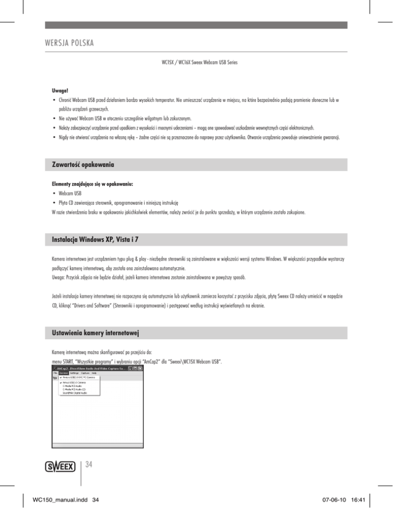Wersja polska WC15X / WC16X Sweex Webcam USB Series Uwaga! • Chronić Webcam USB przed działaniem bardzo wysokich temperatur. Nie umieszczać urządzenia w miejscu, na które bezpośrednio padają promienie słoneczne lub w pobliżu urządzeń grzewczych. • Nie używać Webcam USB w otoczeniu szczególnie wilgotnym lub zakurzonym. • Należy zabezpieczyć urządzenie przed upadkiem z wysokości i mocnymi uderzeniami – mogą one spowodować uszkodzenie wewnętrznych części elektronicznych. • Nigdy nie otwierać urządzenia na własną rękę – żadne części nie są przeznaczone do naprawy przez użytkownika. Otwarcie urządzenia powoduje unieważnienie gwarancji. Zawartość opakowania Elementy znajdujące się w opakowaniu: • Webcam USB • Płyta CD zawierająca sterownik, oprogramowanie i niniejszą instrukcję W razie stwierdzenia braku w opakowaniu jakichkolwiek elementów, należy zwrócić je do punktu sprzedaży, w którym urządzenie zostało zakupione. Instalacja Windows XP, Vista i 7 Kamera internetowa jest urządzeniem typu plug & play - niezbędne sterowniki są zainstalowane w większości wersji systemu Windows. W większości przypadków wystarczy podłączyć kamerę internetową, aby została ona zainstalowana automatycznie. Uwaga: Przycisk zdjęcia nie będzie działał, jeżeli kamera internetowa zostanie zainstalowana w powyższy sposób. Jeżeli instalacja kamery internetowej nie rozpoczyna się automatycznie lub użytkownik zamierza korzystać z przycisku zdjęcia, płytę Sweex CD należy umieścić w napędzie CD, kliknąć “Drivers and Software” (Sterowniki i oprogramowanie) i postępować według instrukcji wyświetlanych na ekranie. Ustawienia kamery internetowej Kamerę internetową można skonfigurować po przejściu do: menu START, “Wszystkie programy” i wybraniu opcji “AmCap2” dla “Sweex\WC15X Webcam USB”. 34 WC150_manual.indd 34 07-06-10 16:41 Wersja polska W AmCap2 należy otworzyć zakładkę “Devices” (Urządzenia). Należy się upewnić, że wybrana została właściwa kamera internetowa: “USB Video device” (Urządzenie wideo USB) lub “Sweex Webcam USB” (Kamera internetowa USB Sweex). W AmCap2 należy przejść do menu “Options” (Opcje). Wybrać “Preview” (Podgląd). Ta opcja pozwala na kontrolę obrazu. W tym samym menu, opcje “Video Capture Filter…” (Filtr nagrań wideo) i “Video Capture Pin…” (Parametry strumienia wideo) umożliwiają zmianę ustawień kamery internetowej. Mikrofon Mikrofon kamery internetowej także wykorzystuje złącze USB - komputer rozpozna i zainstaluje automatycznie mikrofon po podłączeniu kamery. System Windows lub komunikator internetowy powinny automatycznie rozpoznać mikrofon kamery internetowej jako urządzenie do zapisu dźwięku. Jeżeli tak się nie stanie, należy odnieść się do instrukcji obsługi komunikatora internetowego, aby uzyskać więcej informacji na ten temat. Przycisk zdjęcia Kamera internetowa wyposażona jest w “przycisk zdjęcia”. Po wprowadzeniu ustawień kamery internetowej za pośrednictwem AmCap2 lub innego programu, zdjęcie może zostać wykonane poprzez naciśnięcie tego przycisku. Przycisk znajduje się na górze kamery internetowej. Pierścień ostrości Ostrość zdjęcia wykonanego za pomocą Kamery internetowej Sweex można ustawić ręcznie, korzystając w tym celu z pierścienia ostrości. Pierścień ostrości to ruchomy pierścień wokół obiektywu. Znajduje się on z przodu kamery. Przekręcając go w lewo lub w prawo można ustawić ostrość. 35 WC150_manual.indd 35 07-06-10 16:41 Wersja polska 36 WC150_manual.indd 36 07-06-10 16:41 Wersja polska 37 WC150_manual.indd 37 07-06-10 16:41