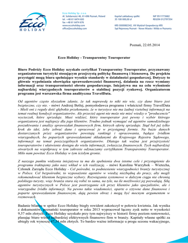 Poznań, 22.05.2014 Ecco Holiday - Transparentny Touroperator