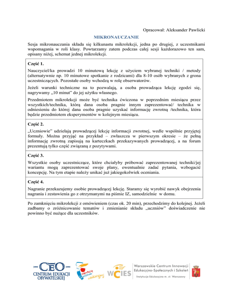 Opracował: Aleksander Pawlicki MIKRONAUCZANIE Sesja mikronauczania składa się kilkunastu mikrolekcji, jedna po drugiej, z uczestnikami wspomagania w roli klasy. Powtarzamy zatem podczas całej sesji każdorazowo ten sam, opisany niżej, schemat jednej mikrolekcji. Część 1. Nauczyciel/ka prowadzi 10 minutową lekcję z użyciem wybranej techniki / metody (alternatywnie np. 10 minutowe spotkanie z rodzicami) dla 8-10 osób wybranych z grona uczestniczących. Pozostałe osoby wchodzą w rolę obserwatorów. Jeżeli warunki techniczne na to pozwalają, a osoba prowadząca lekcję zgodzi się, nagrywamy „10 minut” do jej użytku własnego. Przedmiotem mikrolekcji może być technika ćwiczona w poprzednim miesiącu przez wszystkich/technika, którą dana osoba pragnie innym zaprezentować/ technika w odniesieniu do której dana osoba pragnie uzyskać informację zwrotną /technika, która będzie przedmiotem eksperymentów w kolejnym miesiącu. Część 2. „Uczniowie” udzielają prowadzącej lekcję informacji zwrotnej, wedle wspólnie przyjętej formuły. Można przyjąć na przykład – zwłaszcza w pierwszym okresie – że pełną informację zwrotną zapisują na karteczkach przekazywanych prowadzącej, a na forum prezentują tylko część związaną z pozytywami. Część 3. Wszystkie osoby uczestniczące, które chciałyby próbować zaprezentowanej techniki/jej wariantu mogą zaprezentować swoje plany, ewentualnie zadać pytania, wzbogacić koncepcję. Na tym etapie należy unikać już jakiegokolwiek oceniania. Część 4. Nagranie przekazujemy osobie prowadzącej lekcję. Staramy się wyrobić nawyk obejrzenia nagrania i zestawienia go z otrzymanymi na piśmie IZ, samodzielnie w domu. Po zamknięciu mikrolekcji z omówieniem (czas ok. 20 min), przechodzimy do kolejnej. Jeżeli zadbamy o zróżnicowanie tematów i zmienianie składu „uczniów” doświadczenie nie powinno być nużące dla uczestników.
