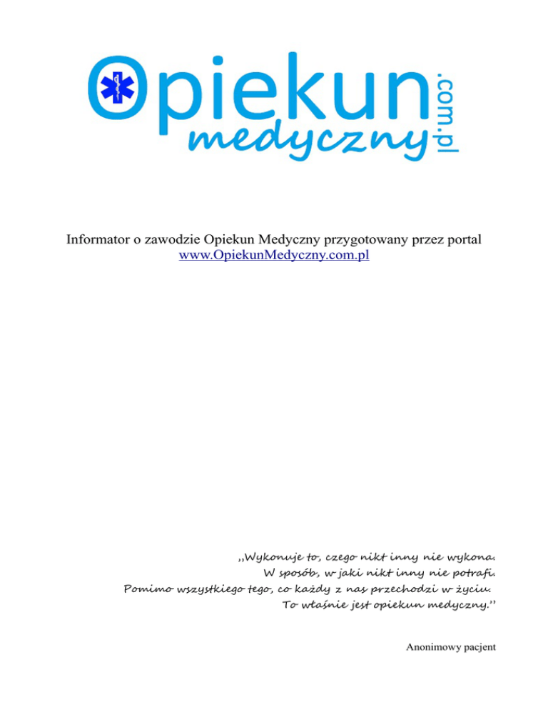 Informator o zawodzie Opiekun Medyczny przygotowany przez portal www.OpiekunMedyczny.com.pl „Wykonuje to, czego nikt inny nie wykona. W sposób, w jaki nikt inny nie potrafi. Pomimo wszystkiego tego, co każdy z nas przechodzi w życiu. To właśnie jest opiekun medyczny.” Anonimowy pacjent Rozdział 1 - Wstęp Zawód opiekuna medycznego jest stosunkowo nowym zawodem. Powstał z inicjatywy Ministra Zdrowia w 2007 roku i od tego roku rozpoczęły się pierwsze nabory do szkół kształcących w tym zawodzie. Rok później odbyły się pierwsze egzaminy i pod koniec roku było już 130 absolwentów, kolejny rok zwiększył ilość opiekunów do ok. 1600 a obecnie absolwentów jest ponad 15 tysięcy. Zawód opiekuna medycznego był odpowiedzią na zmniejszającą się ilość pielęgniarek oraz starzejące się społeczeństwo, które wymaga więcej opieki. Wcześniej bardzo często salowe i pozostały personel szpitala pomagał pielęgniarce w czynnościach opiekuńczych. Sformalizowanie zawodu i ujednolicenie standardów nauczania jest ważne by wprowadzić lepszą jakość opieki, ale również pozwala dostosować wymagania, jak również wygląd hierarchii zawodowej w szpitalu do wyglądu zespołu terapeutycznego w innych krajach. Kształcenie w zawodzie może odbyć się na dwa sposoby. Pierwszym jest kształcenie w szkole policealnej, które trwa rok lub poprzez kwalifikacyjny kurs zawodowy. Niezależnie kształcenie kończy się egzaminem zawodowym i otrzymaniem dyplomu potwierdzającego otrzymanie kwalifikacji zawodowych. Dyplom zawodowy pozwala na wykonywanie zawodów na terenie całej Unii Europejskiej. Certyfikat zawodowy wydawany jest również w języku angielskim. Wielokrotnie podnoszone były obawy pielęgniarek, że zawód ten ma zastąpić pielęgniarki, stanowić ich tańszą alternatywę. Kwalifikacje zawodowe nie pozwalają na wykonywanie czynności pielęgniarskich. Opiekun medyczny ma na celu odciążenie pielęgniarki, pomóc w wykonywaniu podstawowych czynności pielęgnacyjnych i zaspokajanie podstawowych potrzeb życiowych pacjenta. Opiekun medyczny działa na zlecenie pielęgniarki, jednak część czynności może wykonywać bez zlecenia. Publikacja ta ma na celu zebranie w jednym miejscu dostępnych dokumentów prawnych, które dotyczą zawodu, jak również istotnych informacji na temat zawodu i przedstawienia stanowiska, co można by zmienić by zawód ten jeszcze lepiej mógł pełnić powierzone funkcje. W kolejnym rozdziale przedstawimy dokładną sytuację prawną zawodu oraz opis kompetencji. W ostatnim rozdziale skupimy się na prezentacji pozarządowych inicjatyw, które powstały dla opiekunów medycznych oraz propozycji zmian. Rozdział 2 – Podstawy prawne Rozporządzenie Ministra Pracy i Polityki Społecznej z dnia 27 kwietnia 2010 r. w sprawie klasyfikacji zawodów i specjalności na potrzeby rynku pracy oraz zakresu jej stosowania (Dz. U. z dnia 17 maja 2010 r.) sklasyfikowało zawód w tzw. wielkiej grupie Nr 5: Nr 5 – pracownicy usług osobistych i sprzedawcy 53 – pracownicy opieki osobistej i pokrewni 532 - pracownicy opieki osobistej w ochronie zdrowia i pokrewni 5321 – medyczny personel pomocniczy 532102 – opiekun medyczny s (Symbol s oznacza, że kwalifikacje opiekuna medycznego zdobywa się w kształceniu szkolnym) Podstawowym dokumentem dotyczącym kwalifikacji opiekuna medycznego jest Rozporządzenie Ministra Edukacji Narodowej z dnia 7 lutego 2012 r. w sprawie ramowych planów nauczania w szkołach publicznych. Którego załącznik określa jakie kompetencje powinien nabyć opiekun medyczny. Zawód ten zdobył w tym rozporządzeniu symbol cyfrowy 532102, oznaczeniem kwalifikacji jest Z.4 (świadczenie usług opiekuńczych osobie chorej i niesamodzielnej), a efekty kształcenia wspólne dla zawodów w ramach obszaru kształcenia stanowiące podbudowę do kształcenia w zawodzie lub grupie zawodów z uwzględnieniem bezpieczeństwa i higieny pracy (BHP), podejmowania i prowadzenia działalności gospodarczej (PDG), języka obcego ukierunkowanego zawodowo (JOZ), kompetencji personalnych i społecznych (KPS), a w przypadku zawodów nauczanych na poziomie technika, również organizacji pracy małych zespołów (OMZ) zostały opisane skrótem PKZ(Z.a) Opis zawodu zgodnie z załącznikiem do powyższego rozporządzenia: OPIEKUN MEDYCZNY 532102 1. CELE KSZTAŁCENIA W ZAWODZIE Absolwent szkoły kształcącej w zawodzie opiekun medyczny powinien być przygotowany do wykonywania następujących zadań zawodowych: 1) rozpoznawania i rozwiązywania problemów opiekuńczych osoby chorej i niesamodzielnej w różnym stopniu zaawansowania choroby i w różnym wieku; 2) pomagania osobie chorej i niesamodzielnej w zaspakajaniu potrzeb bio-psycho-społecznych; 3) asystowania pielęgniarce i innemu personelowi medycznemu podczas wykonywania zabiegów pielęgnacyjnych; 4) konserwacji, dezynfekcji przyborów i narzędzi stosowanych podczas wykonywania zabiegów; 5) podejmowania współpracy z zespołem opiekuńczym i terapeutycznym podczas świadczenia usług z zakresu opieki medycznej nad osobą chorą i niesamodzielną. 2. EFEKTY KSZTAŁCENIA Do wykonywania wyżej wymienionych zadań zawodowych niezbędne jest osiągnięcie zakładanych efektów kształcenia, na które składają się: 1) efekty kształcenia wspólne dla wszystkich zawodów; 2) efekty kształcenia wspólne dla zawodów w ramach obszaru medyczno- społecznego, stanowiące podbudowę do kształcenia w zawodzie lub grupie zawodów PKZ(Z.a); 3) efekty kształcenia właściwe dla kwalifikacji wyodrębnionej w zawodzie opiekun medyczny opisane w części II: Z.4. Świadczenie usług opiekuńczych osobie chorej i niesamodzielnej: 1. Rozpoznawanie problemów i potrzeb osoby chorej i niesamodzielnej Uczeń: 1) charakteryzuje rozwój psychofizyczny człowieka w poszczególnych fazach życia; 2) określa wpływ choroby na stan psychiczny, sytuację społeczną jednostki i jej rodziny; 3)
