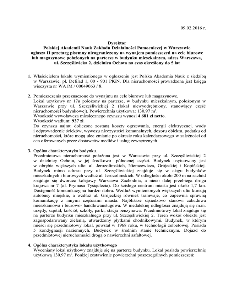 09.02.2016 r. Dyrektor Polskiej Akademii Nauk Zakładu Działalności Pomocniczej w Warszawie ogłasza II przetarg pisemny nieograniczony na wynajem pomieszczeń na cele biurowe lub magazynowe położonych na parterze w budynku mieszkalnym, adres Warszawa, ul. Szczęśliwicka 2, dzielnica Ochota na czas określony do 5 lat 1. Właścicielem lokalu wymienionego w ogłoszeniu jest Polska Akademia Nauk z siedzibą w Warszawie, pl. Defilad 1, 00 - 901 PKiN. Dla nieruchomości prowadzona jest księga wieczysta nr WA1M / 00049063 / 8. 2. Pomieszczenia przeznaczone do wynajmu na cele biurowe lub magazynowe. Lokal użytkowy nr 17u położony na parterze, w budynku mieszkalnym, położonym w Warszawie przy ul. Szczęśliwickiej 2 (lokal niewyodrębniony, stanowiący część nieruchomości budynkowej). Powierzchnia użytkowa: 130,97 m². Wysokość wywoławcza miesięcznego czynszu wynosi 4 681 zł netto. Wysokość wadium: 937 zł. Do czynszu najmu doliczone zostaną koszty ogrzewania, energii elektrycznej, wody i odprowadzenie ścieków, wywozu nieczystości komunalnych, dozoru obiektu, podatku od nieruchomości, które mogą ulec zmianie po okresie roku kalendarzowego w zależności od cen oferowanych przez dostawców mediów i usług zewnętrznych. 3. Ogólna charakterystyka budynku. Przedmiotowa nieruchomość położona jest w Warszawie przy ul. Szczęśliwickiej 2 w dzielnicy Ochota, w jej środkowo- północnej części. Budynek usytuowany jest w obrębie większych ulic: al. Jerozolimskich, Niemcewicza, Grójeckiej i Kopińskiej. Budynek mimo adresu przy ul. Szczęśliwickiej znajduje się w ciągu budynków mieszkalnych i biurowych wzdłuż al. Jerozolimskich. W odległości około 200 m na zachód znajduje się dworzec kolejowy Warszawa Zachodnia, a nieco dalej przebiega droga krajowa nr 7 (al. Prymasa Tysiąclecia). Do ścisłego centrum miasta jest około 1,7 km. Dostępność komunikacyjna bardzo dobra. Wzdłuż wymienionych większych ulic kursują autobusy miejskie, a wzdłuż ul. Grójeckiej również tramwaje, co zapewnia sprawną komunikację z innymi częściami miasta. Najbliższe sąsiedztwo stanowi zabudowa mieszkaniowa i biurowo- handlowausługowa. W niedalekiej odległości znajdują się m.in. urzędy, szpital, kościół, szkoły, parki, stacja benzynowa. Przedmiotowy lokal znajduje się na parterze budynku mieszkalnego przy ul. Szczęśliwickiej 2. Teren wokół obiektu jest zagospodarowany zielenią, utwardzony płytkami chodnikowymi. Budynek, w którym mieści się przedmiotowy lokal, powstał w 1968 roku, w technologii żelbetowej. Posiada 5 kondygnacji naziemnych. Budynek w średnim stanie technicznym. Dojazd do przedmiotowej nieruchomości drogą o nawierzchni asfaltowej. 4. Ogólna charakterystyka lokalu użytkowego Wyceniany lokal użytkowy znajduje się na parterze budynku. Lokal posiada powierzchnię użytkową 130,97 m2. Poniżej zestawienie powierzchni poszczególnych pomieszczeń: Tabela 1 pomieszczenie pom. 1 pom. 2 pom. 3 pom. 4 pom. 5 pom. 6 pom. 7 wc wc Razem pow. [m2] 11,37 8,89 21,13 40,00 8,92 13,91 22,54 2,03 2,18 130,97 Wejście do lokalu z klatki schodowej. Podłogi pokryte są wykładzina dywanową, w wcpłytkami ceramicznymi, zaś ściany pokrywa tynk pomalowany farbami emulsyjnymi w jasnym kolorze oraz płytki ceramiczne w wc. Stolarka okienna PCV. W oknach zamontowane są kraty. Lokal jest w stanie wykończonym, materiałami średniej jakości, dostosowany do prowadzenia działalności biurowej. 5. Informacja o trybie przeprowadzenia przetargu: a. oferty należy składać w zamkniętych kopertach z napisem „Oferta przetargowa na wynajem pomieszczeń w Warszawie, ul. Szczęśliwicka 2” osobiście bądź za pomocą poczty na adres: PAN ZDP w W-wie, 00-330 Warszawa ul. Nowy Świat 72, do dnia 11 kwietnia 2016 roku, do godz.15.00. b. otwarcie ofert odbędzie się w dniu dnia 14 kwietnia 2016 r. o godz.10.00 w siedzibie PAN ZDP w Warszawie, ul. Nowy Świat 72, 00-330 Warszawa, sala nr 05. c. rozpatrywane będą tylko oferty wynajmu na cele biurowe lub magazynowe, niepowodujące uciążliwości dla użytkowników budynku, jak też dla samego charakteru nieruchomości. 6. Obowiązujący termin wnoszenia opłat czynszowych: do 10 każdego miesiąca z góry. Zasady zmian opłat miesięcznych: wynajmujący zastrzega sobie prawo do waloryzacji czynszu raz w roku o średnioroczny wskaźnik wzrostu cen i usług konsumpcyjnych za rok ubiegły, ogłaszany przez Prezesa GUS. 7. Składający ofertę jest związany jej treścią przez 60 dni od daty otwarcia ofert. 8. Dyrektorowi PAN ZDP w warszawie przysługuje prawo zamknięcia przetargu bez wybrania jakiejkolwiek oferty. 9. Warunkiem wzięcia udziału w przetargu jest wpłacenie na rachunek bankowy PAN ZDP w Warszawie nr 31 1130 1017 0020 1462 9420 0035 wadium ze wskazaniem tytułu: „Wynajem pomieszczeń położonych w budynku mieszkalnym w Warszawie, ul. Szczęśliwicka 2”, w wysokości podanej w pkt. 2 do dnia 11 kwietnia 2016 r. Za datę wpłaty przyjmowany będzie dzień wpływu wadium na rachunek bankowy. 10. Wpłacone wadium: a. zostanie zwrócone uczestnikom przetargu, którzy nie wygrali, w terminie 3 dni od daty zamknięcia przetargu, b. przepada na rzecz PAN w przypadku odmowy zawarcia umowy przez uczestnika, który przetarg wygrał, c. zostanie zaliczone w poczet pierwszego czynszu w przypadku uczestnika, który przetarg wygrał. 11. Oferta na wynajem pomieszczenia powinna zawierać, co najmniej: a. wypełniony i podpisany formularz ofertowy z datą. Oferowany miesięczny czynsz za wynajem pomieszczenia nie może być niższy od wywoławczego, do którego zostanie doliczony podatek VAT, zgodnie z obowiązującymi w tym zakresie przepisami. b. kopię dowodu wpłaty wadium. c. krótki opis planowanej działalności w pomieszczeniu biurowym lub magazynowym, będącym przedmiotem najmu. 12. Formularz ofertowy oraz szczegółowe warunki i informacje dotyczące przetargu można uzyskać w Pałac