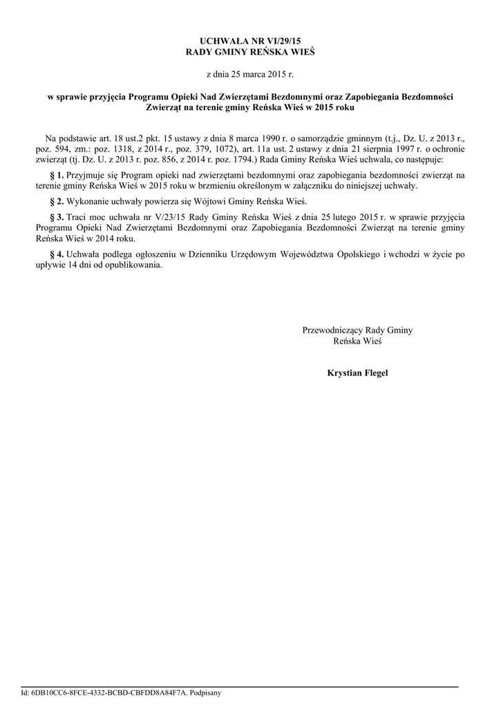 UCHWAŁA NR VI/29/15 RADY GMINY REŃSKA WIEŚ z dnia 25 marca 2015 r. w sprawie przyjęcia Programu Opieki Nad Zwierzętami Bezdomnymi oraz Zapobiegania Bezdomności Zwierząt na terenie gminy Reńska Wieś w 2015 roku Na podstawie art. 18 ust.2 pkt. 15 ustawy z dnia 8 marca 1990 r. o samorządzie gminnym (t.j., Dz. U. z 2013 r., poz. 594, zm.: poz. 1318, z 2014 r., poz. 379, 1072), art. 11a ust. 2 ustawy z dnia 21 sierpnia 1997 r. o ochronie zwierząt (tj. Dz. U. z 2013 r. poz. 856, z 2014 r. poz. 1794.) Rada Gminy Reńska Wieś uchwala, co następuje: § 1. Przyjmuje się Program opieki nad zwierzętami bezdomnymi oraz zapobiegania bezdomności zwierząt na terenie gminy Reńska Wieś w 2015 roku w brzmieniu określonym w załączniku do niniejszej uchwały. § 2. Wykonanie uchwały powierza się Wójtowi Gminy Reńska Wieś. § 3. Traci moc uchwała nr V/23/15 Rady Gminy Reńska Wieś z dnia 25 lutego 2015 r. w sprawie przyjęcia Programu Opieki Nad Zwierzętami Bezdomnymi oraz Zapobiegania Bezdomności Zwierząt na terenie gminy Reńska Wieś w 2014 roku. § 4. Uchwała podlega ogłoszeniu w Dzienniku Urzędowym Województwa Opolskiego i wchodzi w życie po upływie 14 dni od opublikowania. Przewodniczący Rady Gminy Reńska Wieś Krystian Flegel Id: 6DB10CC6-8FCE-4332-BCBD-CBFDD8A84F7A. Podpisany Załącznik do Uchwały Nr VI/29/15 Rady Gminy Reńska Wieś z dnia 25 marca 2015 r. PROGRAM OPIEKI NAD ZWIERZĘTAMI BEZDOMNYMI ORAZ ZAPOBIEGANIA BEZDOMNOŚCI ZWIERZĄT DLA GMINY REŃSKA WIEŚ Reńska Wieś 2015 r. Id: 6DB10CC6-8FCE-4332-BCBD-CBFDD8A84F7A. Podpisany Program opieki nad zwierzętami bezdomnymi oraz zapobiegania bezdomności zwierząt Zgodnie z Ustawą z dnia 21 sierpnia 1997 r. o ochronie zwierząt (Dz. U. z dnia 30 lipca 2013 r. poz. 856 ( tekst jednolity) oraz ustawy z 13 września 1996 r. o utrzymaniu czystości i porządku w gminach (Dz. U z 2013r. poz. 1399). Rada Gminy do 31 marca każdego roku zobowiązana jest do uchwalenia programu opieki nad zwierzętami bezdomnymi oraz zapobiegania bezdomności na podstawie projektu przygotowanego przez Wójta Gminy Reńska Wieś. Celem programu jest: Zapewnienie opieki nad zwierzętami bezdomnymi oraz zapobiegania bezdomności zwierząt. W Programie wskazano również realizatorów poszczególnych zadań oraz wysokość środków finansowych planowanych na ich realizację. W celu zapewnienia opieki nad zwierzętami bezdomnymi przewiduje się realizację następujących zadań: 1. Zapewnienie bezdomnym zwierzętom miejsca w schronisku dla zwierząt Przez schronisko dla zwierząt rozumie się placówkę przeznaczoną dla bezdomnych zwierząt domowych (głównie psów i kotów), w której otoczone są one podstawową opieką. Do podstawowych form opieki świadczonej przez schroniska dla bezdomnych zwierząt należy zabezpieczenie zwierzętom bezpiecznego schronienia, pożywienia, podstawowej opieki weterynaryjnej oraz pomoc w znalezieniu nowych opiekunów. Bezdomne zwierzęta z terenu Gminy Reńska Wieś będą kierowane do schroniska dla bezdomnych zwierząt, prowadzonego przez Miejski Zarząd Budynków Komunalnych w Kędzierzynie-Koźlu, ul. Grunwaldzka 6 na podstawie zawartego w dniu 19 września 2011 r. Porozumienia pomiędzy Gminą Kędzierzyn-Koźle a Gminą Reńska Wieś. (Aneks nr 1/12013 z dnia 05-04-2013r.). Zbieranie bezdomnych zwierząt będzie prowadzone przez specjalistyczną firmę, działającą w oparciu o przepisy ustawy o utrzymaniu czystości i porządku w gminach oraz o ochronie zwierząt– za pomocą specjalistycznego sprzętu, który nie będzie stwarzał zagrożenia dla życia i zdrowia zbieranych zwierząt oraz nie będzie zadawał im cierpienia. W schronisku, w którym Gmina umieściła bezdomne zwierzęta, powinien istnieć punkt informacyjny wskazujący miejsce pobytu przekazanych zwierząt. Schronisko powinno posiadać aktualną umowę z lekarzem weterynarii na świadczenie kompleksowej obsługi weterynaryjnej nad zwierzętami przyjmowanymi i przebywającymi w schronisku oraz umowę z podwykonawcą na odbiór zwierząt uśpionych lub padłych w schronisku. 2. Opieka nad wolno żyjącymi kotami, w tym ich dokarmianie Koty wolno żyjące nie są zwierzętami bezdomnymi, w związku z tym, nie wolno ich wywozić, ani utrudniać im bytowania w danym miejscu. Gmina otoczy opieką wolno żyjące koty, pozostawiając je jednocześnie na wolności. Opieka będzie polegać przede wszystkim na dokarmianiu takich kotów w miejscu ich bytowania. Ponadto Gmina w swoich działaniach, w zależności od posiadanych środków finansowych, uwzględni sterylizację i kastrację dojrzałych płciowo osobników, co przyczyni się do ograniczenia populacji tych zwierząt. Zabiegi takie wykonywać będzie lekarz weterynarii, z którym Gmina podpisze umowę. Skierowania na zabiegi będą wydawane w zależności od potrzeb oraz możliwości finansowych Gminy. Id: 6DB10CC6-8FCE-4332-BCBD-CBFDD8A84F7A. Podpisany 3. Odławianie bezdomnych zwierząt Odławianie zwierząt bezdomnych jest możliwe tylko w przypadku, gdy istnieje możliwość zapewnienia odłowionym zwierzętom miejsca w schronisku dla zwierząt. Odstępstwem są odłowione zwierzęta, które stwarzają poważne zagrożenie dla ludzi lub innych zwierząt. Odławianie zwierząt będzie się odbywało na zasadach określonych Rozporządzeniem MSWiA w spawie zasad i warunków wyłapywania bezdomnych zwierząt z dnia 26 sierpnia 1998 r. (Dz. U. Nr 116, poz.753) - przez osoby przeszkolone w zakresie obchodzenia się ze zwierzętami, za pomocą specjalistycznego sprzętu tak, aby działania te nie stwarzały zagrożenia dla bezpieczeństwa wykonujących je osób, jak również dla zdrowia i życia odławianych zwierząt oraz nie będzie zadawał im cierpienia. Transport odłowionych bezdomnych zwierząt będzie się odbywać pojazdami przystosowanymi do ich transportu. Podczas odławiania i transportu, w razie potrzeby będzie zapewniona opieka weterynaryjna. Dla odłowionych