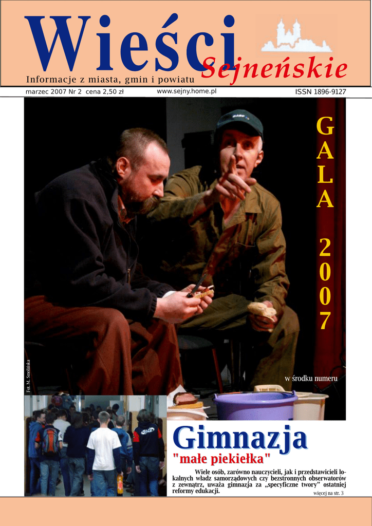 Inform acje z m ias ta, gm in i pow iatu m arze c 2007 Nr 2 ce na 2,50 zł w w w .s e jny.h om e .pl ISSN 189 6-9 127 G A L A Fot. M . Sm olińs k a 2 0 0 7 w środk u num e ru G i m n a z j a " m ałe p ie k ie łk a" W ie l e osób , zarów no nauczycie l i, jak i prze d staw icie l il ok al nych w ład z sam orząd ow ych czy b e zstronnych ob se rw atorów z zew nątrz, uw aża gim nazja za „spe cyficzne tw ory” ostatnie j re form y e d uk acji. w ięce jna str. 3 R ol n ik u ! •Ch ce s z s k or z y s taćz d otacji u n ijn ych ? •Potr z e b u je s z porad y ? Pom oże m y w w y pe łn ie n iu w n ios k u m .in . n a: •d opłaty b e z pośr e d n ie (GPS, w y d r u k i m ap) •pr ogram y r ol n ośr od ow is k ow e •in w e s tycje w gos pod ar s tw ach r ol n ych •u łatw ie n ie s tar tu m łod y m r ol n ik om •r óżn icow an ie d z iałal n ości poz ar ol n icz e j •m ik r opr z e d s ięb ior s tw a O fe r u je m y r ów n ie ż s pr z e d aż i m on taż pr z y d om ow ych i pr z y z agr od ow ych ocz y s z cz al ni ście k ów . Z głoś s ię d o nas – pom oże m y. O d d w óch l atd ziałam y na ty m te re nie Służy m y fach ow ąporad ą. Strona 2 Z apras z am y d o b iu ra w Se jn ach „SM O LIŃSK I” K an ce l ar ia Praw n o- Gos pod ar cz a ul . Słow ack ie go 3 (z a Sy n agogą) w god z . 9 .00 - 17.00 te l . (087) 516 24 87 0 500 025 437 W ie ści Se jne ńs k ie Prob l e m y w ych ow aw cze w gim nazjum z rok u na rok są coraz w ięk sze – przyznaje Al ina O górk is, w ice d yre k tor Gim nazjum nr 1 w Se jnach . Pod ob nie je st w innych gim nazjach z nasze go re gionu. Se jne ńsk a szk oła posłuży nam je d ynie jak o przyk ład . W ie le os ób, zarów no nauczycie li, jak i prze dstaw icie li lok al nych w ładz s am orządow ych czy be zs tronnych obs e rw atorów z ze w nątrz, uw aża gim nazja za „s pe cyficzne tw ory” ostatnie j re form y e duk acji. Nie stety, ok re śl e nie to pojaw ia s ię w ne gatyw nym k onte k ście : jak o m ie js ce , w k tórym m iędzy m łodym i zach odzi dużo ne gatyw nych proce s ów . D odatk ow o w zrasta ostatnim i czas y ilość prze stępstw , pope łnianych prze z nie letnich – uczniów gim nazjów . Czy istnie je s k ute czna re ce pta na opanow anie s ytuacji?M oże pom oże s zk olny ps ych olog, al bo dodatk ow e zajęcia? A m oże … M łodzi m us zą s ię po porostu w ys zum ie ć? k ów ps ych oak tyw nych i ich zażyw anie , s pożyw anie alkoh ol u i nie l e galna je go s prze daż alkoh olu innym uczniom , zas tras zanie , nis zcze nie cudze go i s zk olne go m ie nia, niew yk onyw anie polece ń nauczycie la i ce low e prze s zk adzanie w lek cji, ucie czk i z zajęć, nis zcze nie cudze go m ie nia. D zie nnie - ok oło trze ch zdarze ń. – Nie s pos ób w s zys tk o uch w ycić. Nie o w s zystk ich zdarze niach w ie m y. Najczęście j, zdanie m nauczycie l i nas ze j s zk oły, pojaw ia s ię agre s ja s łow na, bójk i i nis zcze nie m ie nia – pods um ow uje K rzys ztof Tur, dyre k tor Gim nazjum nr 1. - O be cność ps ych ologa w s zk ole je st nie zbędna, naw et je że li s ą to czte ry godziny tygodniow o. Tylko i aż czte ry godziny. Jak o nauczycie l , dos k onale zdaję s obie s praw ę, jak w ażna je st k ażda godzina – w yjaśnia K .Tur. proce s y – m ów i K . Tur. - I tu prze de w s zystk im je s t potrze bny ps ych olog. D om to podstaw a. Jak tam coś nie gra, to w s zys tk o s ię w al i. A ucze ń to w s zystk o w s obie tłum i, albo odre agow uje . D late go obe cność ps ych ologa, s pe cjalisty od ok re s u dojrzew ania, w gim nazjum je s tk onie czna - dodaje . – To, co prze żyliśm y w e w łas ne j rodzinie , dobre go i złe go, idzie za nam i. D zie ci, k tóre m ają pow ażne probl em y w dom u, s w oją złość, poczucie w stydu i s trach prze nos zą na s pos ób funk cjonow ania w innych środow is k ach – w yjaśnia H al ina Saw ick a, dyre k tor Poradni Ps ych ologiczno-Pe dagogiczne j w Se jnach . Fot. M .S. Kociołe k – W tym w ie k u s ą nie s am ow ite napięcia i ryw alizacja pod k ażdym w zględe m m iędzy rów ie śnik am i – oce Szk ol ne gagatk i nia na podstaw ie obs e rw acji i dośw iad– Często je ste m w yw oływ ana z lek cji cze ń K . Tur. – D użo e m ocji, pie rw s ze po to, by załagodzić k onflik t i poroz- m iłości. Tak i k ociołe k s ię robi. Nie stety m aw iać z nie pok ornym ucznie m . A najm ocnie j rozw ijają s ię te ne gatyw ne re agow ać trze ba bardzo s zybk o, że by zjaw is k a. A najtrudnie js ze do znie s ie nia Ponura statystyk a nie dos zło do w ięk s zych i bardzie js k om - s ą dl a nich problem y z rów ie śnik am i. – Na brak dodatk ow ych zajęć u nas w plik ow anych problem ów – m ów i Alina Trze ba starać s ię ich zrozum ie ć, rozs zk ole nie m ożna narze k ać – zaznacza. O górk is , w ice dyre k tor gim nazjum . – m aw iać. Alina O górk is z s e jne ńs k ie go gim - Nie k tórzy uczniow ie po prostu nie – Na czas nauk i w gim nazjum przypada nazjum . Z ajęcia s portow e , k ółk a darzą s zacunk ie m nauczycie li. Najw ięk - trudny ok re s rozw ojow y m łodych ludzi. te m atyczne (m . in. fotograficzne , ch e - s ze problem y s ą na lek cjach re ligii, O ni w ch odzą w burzę h orm onalną. Pom iczne ), m łodzie żow e radio, Ce ntrum poniew aż oce na z te go prze dm iotu nie s zuk ują s w e go m ie js ca w św ie cie . D uży w pływ m ają na nich k oledzy. To trudny ok re s dla nich - m ów i H al ina Saw ick a. Z atrudnie nie ps ych ologa w gim nazjum to w ażny k rok . Ucze ń czy rodzic m oże zgłos ić s ię do nie go po poradę be z cze k ania w k olejce . A te w poradni ps ych ologiczno-pe dagogiczne j w Se jnach s ą długie . - Je że li je s t s ytuacja bardzo trudna, pom agam y natych m iast. Przew ażnie je dnak od m om e ntu zgłos ze nia do s potk ania z ps ych ologie m m ijają je de n, naw et dw 