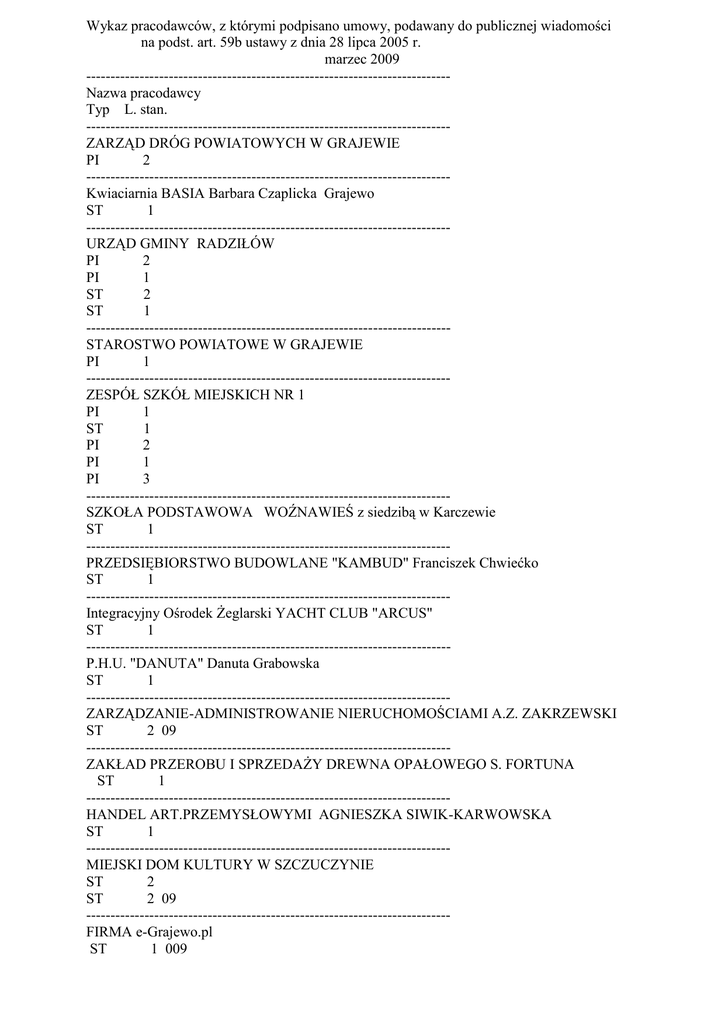 Wykaz pracodawców, z którymi podpisano umowy, podawany do publicznej wiadomości na podst. art. 59b ustawy z dnia 28 lipca 2005 r. marzec 2009 --------------------------------------------------------------------------Nazwa pracodawcy Typ L. stan. --------------------------------------------------------------------------ZARZĄD DRÓG POWIATOWYCH W GRAJEWIE PI 2 --------------------------------------------------------------------------Kwiaciarnia BASIA Barbara Czaplicka Grajewo ST 1 --------------------------------------------------------------------------URZĄD GMINY RADZIŁÓW PI 2 PI 1 ST 2 ST 1 --------------------------------------------------------------------------STAROSTWO POWIATOWE W GRAJEWIE PI 1 --------------------------------------------------------------------------ZESPÓŁ SZKÓŁ MIEJSKICH NR 1 PI 1 ST 1 PI 2 PI 1 PI 3 --------------------------------------------------------------------------SZKOŁA PODSTAWOWA WOŹNAWIEŚ z siedzibą w Karczewie ST 1 --------------------------------------------------------------------------PRZEDSIĘBIORSTWO BUDOWLANE "KAMBUD" Franciszek Chwiećko ST 1 --------------------------------------------------------------------------Integracyjny Ośrodek Żeglarski YACHT CLUB "ARCUS" ST 1 --------------------------------------------------------------------------P.H.U. "DANUTA" Danuta Grabowska ST 1 --------------------------------------------------------------------------ZARZĄDZANIE-ADMINISTROWANIE NIERUCHOMOŚCIAMI A.Z. ZAKRZEWSKI ST 2 09 --------------------------------------------------------------------------ZAKŁAD PRZEROBU I SPRZEDAŻY DREWNA OPAŁOWEGO S. FORTUNA ST 1 --------------------------------------------------------------------------HANDEL ART.PRZEMYSŁOWYMI AGNIESZKA SIWIK-KARWOWSKA ST 1 --------------------------------------------------------------------------MIEJSKI DOM KULTURY W SZCZUCZYNIE ST 2 ST 2 09 --------------------------------------------------------------------------FIRMA e-Grajewo.pl ST 1 009 Wykaz pracodawców, z którymi podpisano umowy, podawany do publicznej wiadomości na podst. art. 59b ustawy z dnia 28 lipca 2005 r. marzec 2009 --------------------------------------------------------------------------VANESSA Rogowski Bogdan ST 1 --------------------------------------------------------------------------USŁUGI TRANSPORTOWO-TOWAROWE, LESZEK SMOLIŃSKI, GRAJEWO ST 1 --------------------------------------------------------------------------POWSZECHNA KASA OSZCZĘDNOŚCI BANK POLSKI S.A. O/BIAŁYSTOK ST 1 --------------------------------------------------------------------------,, MOTO-TRIO ,, s.c. Niebrzydowski i Synowie ST 1 --------------------------------------------------------------------------BIEBRZAŃSKI PARK NARODOWY OSOWIEC TWIERDZA ST 1 --------------------------------------------------------------------------SZKOŁA PODSTAWOWA im. Henryka Sienkiewicza w Rajgrodzie ST 1 --------------------------------------------------------------------------BIBLIOTEKA PUBLICZNA W RAJGRODZIE ST 1 --------------------------------------------------------------------------ZESPÓŁ SZKÓŁ W SZCZUCZYNIE PI 2 --------------------------------------------------------------------------SPRZĄTANIE POSESJI AGATA DĄBKOWSKA ST 1 --------------------------------------------------------------------------BIURO POSELSKIE Posła Kazimierza Gwiazdowskiego ST 1 --------------------------------------------------------------------------PITMAN PIOTR CIMOCHOWSKI GRAJEWO ST 1 --------------------------------------------------------------------------SKLEP SPOŻYWCZO - PRZEMYSŁOWY Dariusz Dobkowski ST 1 --------------------------------------------------------------------------KOMENDA POWIATOWA POLICJI W GRAJEWIE ST 1 ST 1 --------------------------------------------------------------------------P.H.U. "PAWCOM " Paweł Baranowski ST 1 --------------------------------------------------------------------------Sprzedaż Detal. Art. Przemysł. R. Waszkiewicz & J. Rydzewski ST 1 --------------------------------------------------------------------------P.H.U Andrzej Krymski Sprzedaż Materiałów Budowlanych ST 1 --------------------------------------------------------------------------SPRZĄTANIE I OCZYSZCZANIE OBIEKTÓW ,LESZEK" ST 1 --------------------------------------------------------------------------- Wykaz pracodawców, z którymi podpisano umowy, podawany do publicznej wiadomości na podst. art. 59b ustawy z dnia 28 lipca 2005 r. marzec 2009 SZPITAL OGÓLNY IM. DR WITOLDA GINELA W GRAJEWIE ST 1 ST 1 ST 1 --------------------------------------------------------------------------URZĄD MIEJSKI W RAJGRODZIE REF/03 10 --------------------------------------------------------------------------SEKRET CIAŁA ROMAN OPARA ST 1 --------------------------------------------------------------------------MARKO WYKONYWANIE KRAJOWEGO I MIĘDZYNARODOWEGO TRANSPORTU OSOBOWEGO A. Jurski ST 1 --------------------------------------------------------------------------SKLEP WIELOBRANŻOWY "VIKI" Henryk Niedźwiecki ST 1 --------------------------------------------------------------------------ZAKŁAD USŁUGOWY HANDLOWY ,,AUTO-KLINIKA" EWELINA RUSZKOWSKA ST 1 --------------------------------------------------------------------------NOVA Bar Przy Kominku Olga Zielińska ST 1 --------------------------------------------------------------------------OŚRODEK POMOCY SPOŁECZNEJ w RAJGRODZIE PI 1 --------------------------------------------------------------------------PHU "SASS" Karol Sobolewski ST 1 --------------------------------------------------------------------------AUTO-KOMIS MICHAŁ FADROWSKI ST 1 --------------------------------------------------------------------------IMPORTAL Hurtownia Odzieży Używanej Aneta Laskowska ST 1 --------------------------------------------------------------------------GERMAR ST 1 --------------------------------------------------------------------------SZKOŁA PODSTAWOWA NR 4 im. Henryka Sienkiewicza PI 1 ---------------------