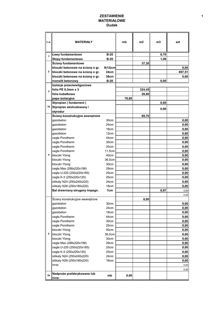 ZESTAWIENIE MATERIAŁOWE Dudek L.p. 1 2 3 3a 4 MATERIAŁY Ławy fundamentowe Stopy fundamentowe Ściany fundamentowe bloczki betonowe na ścianę o gr. bloczki betonowe na ścianę o gr. bloczki betonowe na ścianę o gr. monolit betonowy Izolacje przeciwwilgociowe folia PE 0,3mm x 3 folia kubełkowa papa izolacyjna Styropian ( fundament ) Styropian ekstrudowany / styrodur Ściany konstrukcyjne zewnętrzne gazobeton gazobeton gazobeton gazobeton cegła Porotherm cegła Porotherm cegła Porotherm cegła Porotherm bloczki Ytong bloczki Ytong bloczki Ytong cegła Max (288x220x188) cegła U-220 (250x220x185) cegła K-3 (250x220x120) silikaty N24 (250x240x220) silikaty N28 (250x180x220) Bal drewniany strugany impegn. 1 mb m2 B-20 B-20 m3 szt 6,70 1,06 37,30 9(12)cm 24cm 38cm B-20 0,00 697,51 0,00 0,00 324,45 28,80 78,80 0,00 0,00 89,70 30cm 24cm 18cm 12cm 44cm 30cm 25cm 11,5cm 40cm 36,5cm 30cm 29cm 25cm 25cm 24cm 18cm 7cm 0,00 0,00 0,00 0,00 0,00 0,00 0,00 0,00 0,00 0,00 0,00 0,00 0,00 0,00 0,00 0,00 8,97 0,00 0,00 5 Ściany konstrukcyjne wewnętrzne gazobeton gazobeton gazobeton cegła Porotherm cegła Porotherm cegła Porotherm bloczki Ytong bloczki Ytong bloczki Ytong cegła Max (288x220x188) cegła U-220 (250x220x185) cegła K-3 (250x220x120) silikaty N24 (250x240x220) silikaty N28 (250x180x220) Inne: 0,00 30cm 24cm 18cm 44cm 30cm 25cm 40cm 36,5cm 30cm 29cm 25cm 25cm 24cm 18cm 0,00 0,00 0,00 0,00 0,00 0,00 0,00 0,00 0,00 0,00 0,00 0,00 0,00 0,00 0,00 0,00 5a Nadproże prefabrykowane lub Inne: mb 0,00 ZESTAWIENIE MATERIAŁOWE Dudek L.p. MATERIAŁY 2 mb m2 6 6cm 12cm 11,5cm 11,5cm 6,5cm 12cm 12cm 6cm 12cm 6cm 12cm 12cm 6,5cm 7cm 0,00 0,00 0,00 0,00 0,00 0,00 0,00 0,00 0,00 0,00 0,00 0,00 0,00 64,50 6,45 0,00 7 8 Ściany osłonowe i dekoracyjne cegła klinkierowa okładzina z płytek ( itp..) 12/6cm 0,00 13,20 Kominy cegła pełna cegła klinkierowa wkłady Schiedel kształtki wentylacyjne kształtki ceramiczne Inne: 945,00 0,00 0,00 21,00 8,40 0,00 0,00 12 13 Słupy żelbetowe B-20 0,00 14 Wylewki powierzchniowe podkład fundamentowy szlichta piwnicy szlichta parteru szlichta piętra podkład pod podłogę na legarach B-7,5 B-15 B-15 B-15 B-10 4,14 0,00 0,42 0,00 10,95 10 11 0,00 0,00 0,00 0,00 0,00 0,00 0,00 0,00 0,00 0,00 0,00 0,00 0,00 0,00 0,00 Zaprawa murarska cementowo-wapienna Zaprawa wapienna tynki Wylewki betonowe ( podciągi,nadproża,wylewki, wieńce,schody ) Płyta żelbetowa 9 szt 64,50 w tym: Ściany działowe gazobeton gazobeton cegła Porotherm bloczki Ytong pustak PD-1 (250x220x65) pustak PD-2 (250x220x120) cegła kratówka K-1 (250x65x120) cegła dziurawka cegła dziurawka cegła pełna cegła pełna silikaty N12 (250x120x220) silikaty N6,5 (250x65x220) Bal drewniany strugany impegn. m3 1,12 0,00 B-20 0,00 B-20 0,00 ZESTAWIENIE MATERIAŁOWE Dudek L.p. 15 1 2 3 4 5 6 7 8 9 10 11 12 13 14 15 16 17 18 19 20 21 22 23 24 25 MATERIAŁY 3 mb m2 m3 szt Stropy gęstożebrowe belki stropowe o długościach: 0,00 0,00 0,00 0,00 0,00 0,00 0,00 0,00 0,00 0,00 0,00 0,00 0,00 0,00 0,00 0,00 0,00 0,00 0,00 0,00 0,00 0,00 0,00 0,00 0,00 m m m m m m m m m m m m m m m m m m m m m m m m m 0,00 0,00 0,00 0,00 0,00 0,00 0,00 0,00 0,00 0,00 0,00 0,00 0,00 0,00 0,00 0,00 0,00 0,00 0,00 0,00 0,00 0,00 0,00 0,00 0,00 Suma 15a 15b 16 17 18 Pustaki stropowe Strop monolityczny beton stal zbrojeniowa Zasypka piaskowa ławy fundamenty Okładziny styropianowe ścian o grubości o grubości o grubości o grubości o grubości Okładzina z pianki poliuretanowej Okładzina z wełny mineralnej Ocieplenie szlicht piwnica - styropian parter - styropian piętro - styropian piętro - styropian 0,00 B-20 fi 12 0,00 0,00 39,40 39,50 8cm 10cm 12cm 15cm 20cm 10cm 12cm 0,00 0,00 0,00 0,00 0,00 8,97 0,00 10 cm 10cm 2cm 5cm 0,00 0,60 0,00 0,00 ZESTAWIENIE MATERIAŁOWE Dudek L.p. MATERIAŁY 19 Stal zbrojeniowa (dostosować do projektu) ławy fundamentowe fi 16 ławy fundamentowe fi 6 stal fi 16mm stal fi 12mm lub fi 10-zgodnie z projektem stal fi 8mm stal fi 6mm siatka stalowa do zbrojenia szlicht Okładziny terakota glazura panele podłogowe deski podłogowe wykładzina dywanowa Parapety zewnętrzne - twarde PCV wewnętrzne - konglomerat Wełna mineralna 20 cm + 10 cm Wełna mineralna 14 cm Wełna mineralna 5 cm Płyta G-K Profile stalowe do płyty G-K Płyta OSB Tynk cienkowarstwowy lub inny zewn. Pokrycie dachowe Pokrycie dachowe nieocieplane Folia wiatrowa Folia paroizolacyjna Blacha na obróbki dachowe ( arkusze 200x120 cm ) Rynny i rury spustowe .+ kształtki Gąsiory dachowe Okna - wg wykazu stolarki Okna dachowe typu Velux Luksfery Drzwi wewnętrzne zewnętrzne zewnętrzne - ozdobne Brama garażowa mała duża Płatwie stalowe (IN 240/220 PE 240/220 IN 160 itp…) - według projektu Słup stalowy 100x100x5 mm ( itp…) a b c d e f 20 21 22 23 24 25 26 27 28 29 30 31 32 33 34 35 36 36a 36b 37 38 39 40 41 Schody drewniane na konstrukcji stalowej 4 mb m2 m3 szt 161,54 236,40 0,00 31,68 0,00 0,00 6,00 6,00 0,00 0,00 73,00 0,00 9,57 2,70 74,80 73,00 0,00 93,50 336,60 0,00 0,00 0,00 151,50 165,00 96,80 21,60 55,00 35,00 87,12 16,20 0,00 0,00 6,00 1,00 0,00 0,00 0,00 0,00 0,00 0,00 ZESTAWIENIE MATERIAŁOWE Dudek L.p. MATERIAŁY mb 5 m2 m3 szt INSTALACJE Wodno-kanalizacyjne 42 43 44 45 Przybory: misa wc + spłuczka bidet wanna kabina prysznicowa umywalka zlewozmywak Armatura: bidet wanna prysznic umywalka zlewozmywak kran ogrodowy Orurowanie - Pex w peszlu Kanalizacja - rury PCV + kształtki 1,00 0,00 1,00 1,00 1,00 1,00 0,00 1,00 1,00 1,00 1,00 1,00 28,00 22,80 Instalacja CO 46 47 48 49 Grzejniki Orurowanie ( z ogrzew. podł.) Rozdzielacze Kocioł gaz gaz Inne 10,00 145,95 1,00 1,00 0,00 0,00 Instalacja Gazowa 50 Szafka zewnętrzna + zawór + orurowanie 1,00 Instalacja Elektryczna 51 52 53 54 55 Tablica rozdzielcza Kabel elektryczny Punkty elektryczne 1,00 300,00 60,00 Więźba dachowa /konstrukcje ścian/ wg załącznika nr1 + nr2 4,603 Pozycje pozostałe : Ceny zawarte w tym zestawieniu zostały podane w kwotach nett