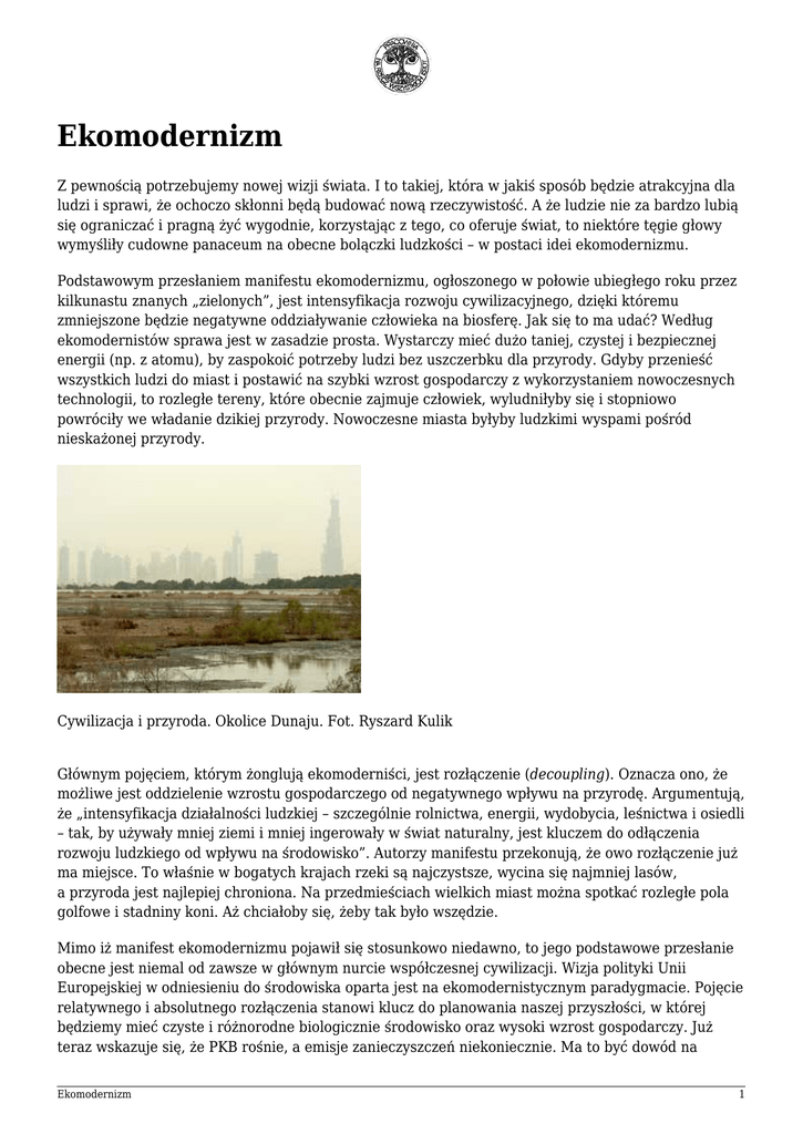 Ekomodernizm Z pewnością potrzebujemy nowej wizji świata. I to takiej, która w jakiś sposób będzie atrakcyjna dla ludzi i sprawi, że ochoczo skłonni będą budować nową rzeczywistość. A że ludzie nie za bardzo lubią się ograniczać i pragną żyć wygodnie, korzystając z tego, co oferuje świat, to niektóre tęgie głowy wymyśliły cudowne panaceum na obecne bolączki ludzkości – w postaci idei ekomodernizmu. Podstawowym przesłaniem manifestu ekomodernizmu, ogłoszonego w połowie ubiegłego roku przez kilkunastu znanych „zielonych”, jest intensyfikacja rozwoju cywilizacyjnego, dzięki któremu zmniejszone będzie negatywne oddziaływanie człowieka na biosferę. Jak się to ma udać? Według ekomodernistów sprawa jest w zasadzie prosta. Wystarczy mieć dużo taniej, czystej i bezpiecznej energii (np. z atomu), by zaspokoić potrzeby ludzi bez uszczerbku dla przyrody. Gdyby przenieść wszystkich ludzi do miast i postawić na szybki wzrost gospodarczy z wykorzystaniem nowoczesnych technologii, to rozległe tereny, które obecnie zajmuje człowiek, wyludniłyby się i stopniowo powróciły we władanie dzikiej przyrody. Nowoczesne miasta byłyby ludzkimi wyspami pośród nieskażonej przyrody. Cywilizacja i przyroda. Okolice Dunaju. Fot. Ryszard Kulik Głównym pojęciem, którym żonglują ekomoderniści, jest rozłączenie (decoupling). Oznacza ono, że możliwe jest oddzielenie wzrostu gospodarczego od negatywnego wpływu na przyrodę. Argumentują, że „intensyfikacja działalności ludzkiej – szczególnie rolnictwa, energii, wydobycia, leśnictwa i osiedli – tak, by używały mniej ziemi i mniej ingerowały w świat naturalny, jest kluczem do odłączenia rozwoju ludzkiego od wpływu na środowisko”. Autorzy manifestu przekonują, że owo rozłączenie już ma miejsce. To właśnie w bogatych krajach rzeki są najczystsze, wycina się najmniej lasów, a przyroda jest najlepiej chroniona. Na przedmieściach wielkich miast można spotkać rozległe pola golfowe i stadniny koni. Aż chciałoby się, żeby tak było wszędzie. Mimo iż manifest ekomodernizmu pojawił się stosunkowo niedawno, to jego podstawowe przesłanie obecne jest niemal od zawsze w głównym nurcie współczesnej cywilizacji. Wizja polityki Unii Europejskiej w odniesieniu do środowiska oparta jest na ekomodernistycznym paradygmacie. Pojęcie relatywnego i absolutnego rozłączenia stanowi klucz do planowania naszej przyszłości, w której będziemy mieć czyste i różnorodne biologicznie środowisko oraz wysoki wzrost gospodarczy. Już teraz wskazuje się, że PKB rośnie, a emisje zanieczyszczeń niekoniecznie. Ma to być dowód na Ekomodernizm 1 faktyczne występowanie rozłączenia. To wszystko brzmi pięknie, jak słodki sen. I w istocie nim jest. Aż nie mogę wyjść ze zdumienia, że wykształceni, rozsądni i inteligentni ludzie mogą ulegać takiemu złudzeniu i tak dalece zaprzeczać rzeczywistości. Ekomoderniści przekonują, że nasza działalność może nie mieć wpływu na środowisko – to właśnie oznacza absolutne rozłączenie. Oczywistością zaś jest to, że każda nasza czynność wpływa na przyrodę. Cokolwiek robimy – oddziałujemy na cały świat, ponieważ wszystko jest ze sobą połączone. Tego połączenia nie da się rozłączyć, ponieważ zaprzeczałoby to podstawowym zasadom fizyki. Tak było, jest i będzie – i nic tego nie zmieni. To oddziaływanie oczywiście może być mniejsze, gdy optymalizujemy swoją aktywność, ale nigdy nie zdarzy się tak, że będziemy mieć coś za nic. „Nie ma czegoś takiego jak obiad za darmo” – pisał już w latach 70. znany ekolog Barry Commoner. Istnienie wielkich, nowoczesnych miast jest w sposób absolutny, bezpośrednio i pośrednio uzależnione od usług świadczonych przez ekosystemy. Im bardziej rozwinięte i bogatsze jest miasto, tym większą pracę musi wykonać dzika przyroda, by utrzymać je przy życiu. Dowodem na to jest ślad ekologiczny takich aglomeracji. Przykładowo w Nowym Jorku wynosi on 14,2 gha na osobę, co oznacza, że gdybyśmy wszyscy chcieli żyć w ten sposób, to potrzebowalibyśmy prawie ośmiu planet takich jak Ziemia. To, że bogate państwa mają czystsze środowisko, jest związane wyłącznie z charakterem globalnej ekonomii, za sprawą której przenieśliśmy brudną produkcję do krajów trzeciego świata. Ale tego wszystkiego nie dowiemy się z manifestu ekomodernistów. Zamiast tego dostaniemy solidną porcję miłości do natury, podszytą chęcią jej eksploatacji na niespotykaną skalę, z zaklinaniem rzeczywistości, że nie spowoduje to negatywnych konsekwencji. Naiwność tej wizji jest doprawdy porażająca. Jest też przerażająca, bowiem całe rzesze polityków oraz zwykłych obywateli łapią się na ten słodki lep, rezygnując z intelektualnej uczciwości i przenikliwości. Z pewnością potrzebujemy nowej wizji świata. Jeżeli istotą naszych problemów jest postępujące oddzielenie od natury, to ekomoderniści proponuję nam absolutne oddzieleniejako lekarstwo na tę chorobę. Aż strach pomyśleć, do czego to może doprowadzić. Ryszard Kulik Ekomodernizm 2