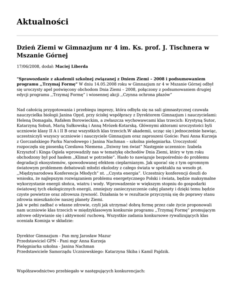 Aktualności Dzień Ziemi w Gimnazjum nr 4 im. Ks. prof. J. Tischnera w Mszanie Górnej 17/06/2008, dodał: Maciej Liberda "Sprawozdanie z akademii szkolnej związanej z Dniem Ziemi – 2008 i podsumowaniem programu ,,Trzymaj Formę” W dniu 14.05.2008 roku w Gimnazjum nr 4 w Mszanie Górnej odbył się uroczysty apel poświęcony obchodom Dnia Ziemi – 2008, połączony z podsumowaniem drugiej edycji programu ,,Trzymaj Formę” i wiosennej akcji ,,Czynna ochrona płazów” Nad całością przygotowania i przebiegu imprezy, która odbyła się na sali gimnastycznej czuwała nauczycielka biologii Janina Opyd, przy ścisłej współpracy z Dyrektorem Gimnazjum i nauczycielami: Heleną Domagała, Rafałem Borowieckim, a zwłaszcza wychowawcami klas trzecich: Krystyną Sutor, Katarzyną Sobuń, Marią Sułkowską i Anną Mrózek-Kotarską. Głównymi aktorami uroczystości byli uczniowie klasy II A i II B oraz wszystkich klas trzecich.W akademii, ucząc się i jednocześnie bawiąc, uczestniczyli wszyscy uczniowie i nauczyciele Gimnazjum oraz zaproszeni Goście: Pani Anna Kurzeja z Gorczańskiego Parku Narodowego i Janina Nachman – szkolna pielęgniarka. Uroczystość rozpoczęła się piosenką Czesława Niemena ,,Dziwny ten świat” Następnie uczennice: Izabela Krzysztof i Kinga Ogiela wprowadziły nas w tematykę obchodów Dnia Ziemi, który w tym roku obchodzony był pod hasłem ,,Klimat w potrzebie”. Hasło to nawiązuje bezpośrednio do problemu degradacji ekosystemów, spowodowanej efektem cieplarnianym. Jak uporać się z tym ogromnym światowym problemem debatowali młodzi ekolodzy z całego świata w spektaklu na wesoło pt. ,,Międzynarodowa Konferencja Młodych” nt. ,,Czysta energia”. Uczestnicy konferencji doszli do wniosku, że najlepszym rozwiązaniem problemu energetycznego Polski i świata, będzie maksymalne wykorzystanie energii słońca, wiatru i wody. Wprowadzenie w większym stopniu do gospodarki światowej tych ekologicznych energii, zmniejszy zanieczyszczenie całej planety i dzięki temu będzie czyste powietrze oraz zdrowsza żywność. Działania te w rezultacie przyczynią się do poprawy stanu zdrowia mieszkańców naszej planety Ziemi. Jak w pełni zadbać o własne zdrowie, czyli jak utrzymać dobrą formę przez całe życie proponowali nam uczniowie klas trzecich w międzyklasowym konkursie programu ,,Trzymaj Formę” promującym zdrowe odżywianie się i aktywność ruchową. Wszystkie zadania konkursowe rywalizujących klas oceniała Komisja w składzie: Dyrektor Gimnazjum - Pan mrg Jarosław Mazur Przedstawiciel GPN - Pani mgr Anna Kurzeja Pielęgniarka szkolna - Janina Nachman Przedstawiciele Samorządu Uczniowskiego: Katarzyna Skiba i Kamil Pajdzik. Współzawodnictwo przebiegało w następujących konkurencjach: 1. ,,Odżywiaj się zdrowo i prawidłowo” – to hasło pierwszej konkurencji, obejmującej 3 następujące propozycje: ,,Pij mleko i jedz jego przetwory, a będziesz wielki” do tej konkurencji, każda klasa przygotowała ekspozycję produktów mlecznych: serów białych, żółtych, mleka, kefiru, jogurtów i koktajli. ,,Najwięcej zdrowia! Sałatka owocowa i warzywna – Tobie da” pod takim hasłem klasy przygotowały na konkurs po jednej sałatce owocowej i warzywnej. ,,Najsmaczniejszy i zdrowy pełnoziarnisty chleb razowy” – hasło promujące różne gatunki ciemnego pieczywa prezentowane przez uczniów na wystawie. 2. ,,Nie! dla bulimii” ,,Nie ! dla anoreksji” to zadanie drugiej konkurencji, w której każda klasa wykonała plakat pod tym hasłem. 3. ,,Każdy może być poetą” - to konkurs na napisanie 5 rymowanek nt. zdrowego stylu życia, które przedstawiciele poszczególnych klas prezentowali przed komisją i publicznością. 4. Ostatnia konkurencja przebiegała pod hasłem ,,Ruch to zdrowie” w tym konkursie uczniowie, po dwóch z każdej klasy zaprezentowali rozbawionej już widowni, taniec do utworu ,,Papaja” Urszuli Dudziak. Członkowie Komisji dokonali degustacji przygotowanych przez uczniów potraw i biorąc pod uwagę walory smakowe, ekologiczne wyroby oraz estetykę prezentowanego meni, ocenili poszczególne klasy. Po wystawieniu punktów za pozostałe konkurencje i podsumowaniu wszystkich zadań, Komisja wyłoniła zwycięzcę konkursu. I tak pierwsze miejsce egzekwio zajęły klasy III B i C, drugie miejsce przypadło klasie III D i trzecie klasie III A. Podsumowując konkurs klas III Przewodniczący Komisji Dyrektor Gimnazjum Jarosław Mazur podziękował uczniom za zdrową i piękną rywalizację oraz wręczył przedstawicielom klas Dyplomy Uznania. Przy piosence Janusza Kofty ,,Pamiętajcie o ogrodach” wszyscy uczniowie, którzy przygotowywali program, oprawę muzyczną i dekorację tej uroczystości zostali obdarowani nagrodą ekologiczną jabłkiem - symbolem zdrowia i urody. W ostatniej części apelu Pani Anna Kurzeja - pracownik dydaktyczny GPN podsumowała akcję ,,Czynna ochrona płazów- wiosna 2008” i wręczyła cenne nagrody książkowe ufundowane przez Wójta Gminy Mszana Dolna Tadeusza Patalitę ośmiu uczniom naszego Gimnazjum. Nagrody otrzymali: Katarzyna Skiba, Anna Wąchała, Paulina Pytel, Kinga Ogiela, Justyna Kamińska, Izabela Krzysztof, Jarosław Talarek i Dariusz Tomala. Wymienieni uczniowie przez cztery tygodnie przenosili żaby przez jezdnię w Mszanie Górnej, podczas godowej wędrówki płazów do oczka wodnego w celu złożenia jaj. Nagrody za wieloletnią współpracę z GPN otrzymał również dyrektor Gimnazjum Jarosław Mazur i nauczycielka biologii Janina Opyd. Janina Opyd nauczyciel biologii w Gimnazjum nr4 w Mszanie Górnej Zapraszamy do galerii