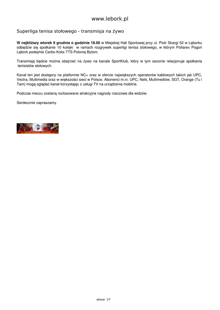 www.lebork.pl Superliga tenisa stołowego - transmisja na żywo W najbliższy wtorek 9 grudnia o godzinie 18.00 w Miejskiej Hali Sportowej przy ul. Piotr Skargi 52 w Lęborku odbędzie się spotkanie 10 kolejki w ramach rozgrywek superligi tenisa stołowego, w którym Poltarex Pogoń Lębork podejmie Carbo-Koks TTS Polonię Bytom. Transmisję będzie można obejrzeć na żywo na kanale SportKlub, który w tym sezonie relacjonuje spotkania tenisistów stołowych. Kanał ten jest dostępny na platformie NC+ oraz w ofercie największych operatorów kablowych takich jak UPC, Vectra, Multimedia oraz w większości sieci w Polsce. Abonenci m.in. UPC, Netii, Multimediów, SGT, Orange (Tu i Tam) mogą oglądać kanał korzystając z usługi TV na urządzenia mobilne. Podczas meczu zostaną rozlosowane atrakcyjne nagrody rzeczowe dla widzów. Serdecznie zapraszamy. strona 1/1 Powered by TCPDF (www.tcpdf.org)