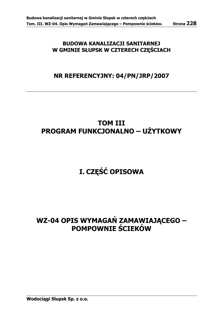 Budowa kanalizacji sanitarnej w Gminie Słupsk w czterech częściach Tom. III. WZ-04. Opis Wymagań Zamawiającego – Pompownie ścieków. Strona 228 BUDOWA KANALIZACJI SANITARNEJ W GMINIE SŁUPSK W CZTERECH CZĘŚCIACH NR REFERENCYJNY: 04/PN/JRP/2007 TOM III PROGRAM FUNKCJONALNO – UśYTKOWY I. CZĘŚĆ OPISOWA WZ-04 OPIS WYMAGAŃ ZAMAWIAJĄCEGO – POMPOWNIE ŚCIEKÓW Wodociągi Słupsk Sp. z o.o. Budowa kanalizacji sanitarnej w Gminie Słupsk w czterech częściach Tom. III. WZ-04. Opis Wymagań Zamawiającego – Pompownie ścieków. Strona 229 ZAWARTOŚĆ 1 Informacje ogólne.............................................................230 1.1 2 Zakres stosowania .................................................................................................. 230 Materiały ...........................................................................230 2.1 Ogólne wymagania dla materiałów........................................................................ 230 2.2 Stosowane materiały .............................................................................................. 230 2.2.1. Obudowa ........................................................................................................ 230 2.2.2. Pompy, rurociągi i armatura........................................................................... 231 2.2.3. Szafa sterownicza pompowni sieciowych...................................................... 234 2.2.4. Szafa sterownicza pompowni przydomowych ............................................... 236 3 Sprzęt ................................................................................237 3.1 4 Transport...........................................................................237 4.1 4.2 5 Wymagania ogólne................................................................................................. 237 Wymagania ogólne................................................................................................. 237 Wymagania szczegółowe ....................................................................................... 237 Wykonywanie robót ..........................................................238 5.1 Ogólne zasady wykonywania Robót ...................................................................... 238 5.2 Szczegółowe zasady wykonywania Robót............................................................. 238 5.2.1. Zagospodarowanie terenu wokół pompowni ................................................. 238 5.2.2. System sterowania i monitoringu ................................................................... 238 5.3 Dostęp do urządzeń ................................................................................................ 240 6 Kontrola jakości Robót ......................................................241 6.1 6.2 7 Ogólne wymagania................................................................................................. 241 Kontrola i badanie w trakcie robót i odbioru ......................................................... 241 Wymagania przy odbiorze .................................................241 7.1 Ogólne wymagania................................................................................................. 241 7.1.1. Odbiór techniczny końcowy........................................................................... 241 8 9 Podstawa płatności ...........................................................243 Dokumenty odniesienia .....................................................243 Wodociągi Słupsk Sp. z o.o. Budowa kanalizacji sanitarnej w Gminie Słupsk w czterech częściach Tom. III. WZ-04. Opis Wymagań Zamawiającego – Pompownie ścieków. 1 INFORMACJE OGÓLNE 1.1 Zakres stosowania Strona 230 Przedmiotem niniejszego Opisu Wymagań Zamawiającego są wymagania dotyczące wykonania pompowni ścieków związanych z realizacją zadania pn:„Budowa kanalizacji sanitarnej w gminie Słupsk” 2 MATERIAŁY 2.1 Ogólne wymagania dla materiałów Ogólne wymagania dla materiałów podano w WZ-00 Wymagania Ogólne. 2.2 Stosowane materiały 2.2.1. Obudowa Obudowa pompowni winna być wykonana z polimerobetonu, dla przepompowni przydomowych dopuszcza się wykonanie zbiorników przepompowni z polietylenu. Średnica wewnętrzna obudowy powinna być dobrana do gabarytów pomp i armatury, lecz nie moŜe być mniejsza jak: - 800 mm dla jednopompowej pompowni przydomowej - 1200 mm dla pompowni sieciowej dwupompowej. Dno pompowni powinno być ukształtowane tak, aby nie zalegały na nim osady i piasek. – nie dotyczy to pompowni przydomowych, w których piasek nie powinien być zasysany do pompy. Głębokość uŜytkowa pompowni powinna zapewniać częstotliwość załączeń pompy nie większą jak dopuszczona przez producenta pompy, jednak w Ŝadnym wypadku nie większą jak 15 na godzinę. Poziom załączenia pompy powinien znajdować się poniŜej poziomu dna kanału dopływowego do pompowni. KaŜda pompownia winna być wyposaŜona w drabinkę wykonaną ze stali nierdzewnej min. 0H18N9, a pompownie o głębokości ponad 3 m dodatkowo w pomost roboczy wykonany ze stali nierdzewnej min. 0H18N9. Właz powinien być wykonany ze stali nierdzewnej, z blach wzmocnionych uŜebrowaniem, o klasie wytrzymałości B (125 kN). Pokrywa włazu powinna być blokowana w połoŜeniu otwartym w pozycji zbliŜonej do pionowej. Zamek włazu powinien być odporny na zanieczyszczenia i uszkodzenia, otwierany powinien być trudnym do podrobienia kluczem. Wodociągi Słupsk Sp. z o.o. Budowa kanalizacji sanitarnej w Gminie Słupsk w czterech częściach Tom. III. WZ-04. Opis Wymagań Zamawiającego – Pompownie ścieków. Strona 231 Wentylacja pompowni powinna być jedynie wentylacją oddechową. Konstrukcja otworów wentylacyjnych powinna uniemoŜliwiać wrzucanie do pompowni jakichkolwiek stałych przedmiotów. Osłony otworów wentylacyjnych powinny mieć wytrzymałość odpowiadającą klasie B dla zwieńcze