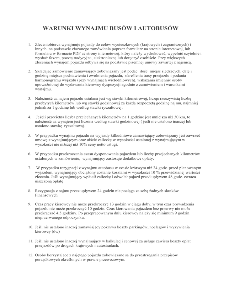 WARUNKI WYNAJMU BUSÓW I AUTOBUSÓW 1. Zleceniobiorca wynajmuje pojazdy do celów wycieczkowych (krajowych i zagranicznych) i innych na podstawie złożonego zamówienia poprzez formularz na stronie internetowej, lub formularz w formacie PDF ze strony internetowej, który należy wydrukować, wypełnić czytelnie i wysłać: faxem, pocztą tradycyjną, elektroniczną lub doręczyć osobiście. Przy większych zleceniach wynajem pojazdu odbywa się na podstawie pisemnej umowy zawartej z najemcą. 2. Składając zamówienie zamawiający zobowiązany jest podać ilość miejsc siedzących, datę i godzinę miejsca podstawienia i zwolnienia pojazdu, określenia trasy przejazdu i podania harmonogramu wyjazdu (przy wynajmach wielodniowych), wskazania imiennie osoby upoważnionej do wydawania kierowcy dyspozycji zgodnie z zamówieniem i warunkami wynajmu. 3. Należność za najem pojazdu ustalana jest wg stawki kilometrowej, licząc rzeczywistą liczbę przebytych kilometrów lub wg stawki godzinowej za każdą rozpoczętą godzinę najmu, najmniej jednak za 1 godzinę lub według stawki ryczałtowej. 4. Jeżeli przeciętna liczba przejechanych kilometrów na 1 godzinę jest mniejsza niż 30 km, to należność za wynajem jest liczona według stawki godzinowej ( jeśli nie ustalono inaczej lub ustalono stawkę ryczałtową). 5. W przypadku wynajmu pojazdu na wyjazdy kilkudniowe zamawiający zobowiązany jest zawrzeć umowę z wynajmującym oraz uiścić zaliczkę w wysokości ustalonej z wynajmującym w wysokości nie niższej niż 10% ceny netto usługi. 6. W przypadku przekroczenia czasu dysponowania pojazdem lub liczby przejechanych kilometrów ustalonych w zamówieniu, wynajmujący zastosuje dodatkowe opłaty. 7. W przypadku rezygnacji z wynajmu autobusu w czasie krótszym niż 24 godz. przed planowanym wyjazdem, wynajmujący obciążony zostanie kosztami w wysokości 10 % przewidzianej wartości zlecenia. Jeśli wynajmujący wpłacił zaliczkę i odwołał pojazd przed upływem 48 godz. zwraca uiszczoną opłatę 8. Rezygnacja z najmu przez upływem 24 godzin nie pociąga za sobą żadnych skutków Finansowych 9. Czas pracy kierowcy nie może przekroczyć 13 godzin w ciągu doby, w tym czas prowadzenia pojazdu nie może przekroczyć 10 godzin. Czas kierowania pojazdem bez przerwy nie może przekraczać 4,5 godziny. Po przepracowanym dniu kierowcy należy się minimum 9 godzin nieprzerwanego odpoczynku. 10. Jeśli nie ustalono inaczej zamawiający pokrywa koszty parkingów, noclegów i wyżywienia kierowcy (ów) 11. Jeśli nie ustalono inaczej wynajmujący w kalkulacji cenowej za usługę zawiera koszty opłat przejazdów po drogach krajowych i autostradach. 12. Osoby korzystające z najętego pojazdu zobowiązane są do przestrzegania przepisów porządkowych określonych w prawie przewozowym. 13. W przypadku uszkodzenia, zanieczyszczenia pojazdu nie wynikającego z normalnej eksploatacji, najemca przywróci stan poprzedni lub poniesie koszty z tym związane. 14. Należność za usługę opłacana jest według cen umownych. 15. Kierowcy nie wolno stawiać żądań, które byłyby sprzeczne z ogólnie obowiązującymi przepisami prawa, a w szczególności przepisami o bezpieczeństwie ruchu drogowego i ustawy o czasie pracy kierowców. 16. Bagaż osób przewożonych nie powinien przekraczać 20 kg na jedno miejsce siedzące w pojeździe 17. We wszelkiego rodzaju sporach zaistniałych pomiędzy wynajmującym a najemcą stosuje się przepisy Kodeksu Cywilnego lub rozpatrywane są przez Sąd właściwy dla miejsca siedziby wynajmującego Piotr Żuk