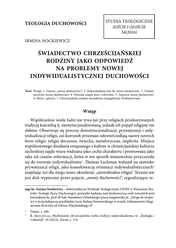 Teologia duchowości Studia Teologiczne IDŹCIE I GŁOŚCIE 34(2016) Irmina Nockiewicz świadectwo chrześcijańskiej rodziny jako odpowiedź na problemy nowej indywidualistycznej duchowości Treść: Wstęp; 1. Geneza „nowej duchowości”; 2. Indywidualistyczne tło nowej duchowości; 3. Charakterystyka nowej duchowości; 4. Świecka religia praw człowieka; 5. Antyteza nowej duchowości; 6. Idźcie i głoście; 7. Chrześcijańska rodzina narzędziem ewangelizacji; Podsumowanie. Wstęp Współcześnie wielu ludzi nie trwa już przy religiach przekazywanych tradycją kościelną tj. zinstytucjonalizowaną, jednak ich popęd religijny nie słabnie. Obserwuje się procesy deinstytucjonalizacji, prywatyzacji i indywidualizacji religii, zaś kierunek przemian odzwierciedlają nazwy nowych form religii: religia doczesna, świecka, metaforyczna, implicite. Miejsce wspólnotowego działania związanego z kultem w chrześcijańskiej kulturze zachodniej zajęła wiara widziana jako cecha charakteru i promowana jako taka od czasów reformacji, która w ten sposób mimowolnie przyczyniła się do rozwoju indywidualizmu1. Thomas Luckman wskazał na zjawisko prywatyzacji religii, jako konsekwencję orientacji indywidualistycznych2 znajdując też dla niego nowe określenie „niewidzialna religia”. Termin ten jest dziś wypierany przez pojęcie „nowej duchowości”, sygnalizujące remgr lic. Irmina Nockiewicz – doktorantka na Wydziale Teologicznym UKSW w Warszawie (Katedra Teologii Życia Duchowego), prowadzi badania nad duchowością osób świeckich pod kierunkiem ks. prof. dr hab. Stanisława Urbańskiego; praca magisterska pt. „Droga do świętości w życiu laikatu na przykładzie życia Stefana Świeżawskiego w świetle Dokumentów Magisterium Kościoła od Soboru Watykańskiego II”. 1 2 Tamże, s. 206. K. Skoczylas, Wychowanie chrześcijańskie wobec kultury indywidualizmu, w: „Teologia i Człowiek” 19 (2012), Toruń, s. 174. Irmina Nockiewicz wolucyjny megatrend w dziedzinie religii. Czy można tym tendencjom się przeciwstawić? Czy da się przezwyciężyć trend nasilającej się indywidualizacji i prywatyzacji w dziedzinie religii? Odpowiedź na te pytania, stanowi równocześnie podpowiedź, jak tę rzeczywistość ewangelizować? W niniejszej dysertacji zostanie przedstawione zjawisko nowej duchowości indywidualistycznej: jego geneza, wpisany w nie indywidualizm wraz z jego implikacjami na różnych płaszczyznach, które w świetle katolickiej nauki społecznej (KNS) można określić mianem problemów, gdyż Kościół odrzuca zarówno antropologiczne założenia indywidualizmu, jak i jego praktyczne zastosowania3. Analiza nowej indywidualistycznej duchowości umożliwi na zaproponowanie rozwiązań - tak teoretycznych, jak i praktycznych - będących odpowiedzią na problem społeczny, jaki stanowi. Jednocześnie niniejsza praca nie rości sobie ambicji do wyczerpania tematu, gdyż ze względu na ograniczoną objętość zaproponowana tematyka zostanie jedynie naszkicowana, może jednak posłużyć do dalszych, pogłębionych badań w tej dziedzinie. 1. Geneza „nowej duchowości” Genezę nowej duchowości można porównać do zmiany skupienia materii religijnej: od ciała stałego, przez formę płynną, aż po stan gazowy, eteryczny, która będąc zjawiskiem diachronicznym, nie wyklucza istnienia wymienionych trzech stanów skupienia synchronicznie4. Przez wieki religia chrześcijańska w Europie przejawiała się w formie ścisłej zależności życia religijnego w wymiarze prywatnym i społecznym oraz wyrażała się w tradycyjnych obyczajach i obrzędach. Ten stan skupienia religii nazywany jest „chrześcijaństwem kongregacyjnym” (Gemeindechristentum). Jednak przemiany zjawiska religijnego na zachodzie poszły w kierunku koncentracji na doświadczeniach i stanach wewnętrznych. Tendencja ta ukształtowała się w łonie reformy protestanckiej, która zniosła zbawcze pośrednictwo Kościoła, przerzucając całą odpowiedzialność za zbawienie na jednostkę, co zaowocowało ukierunkowaniem na samoobserwację, samorefleksyjność i samointerpretację5. Myśl protestancka traktuje jednostkę, jako izolowaną całość, osłabiającą swoje związki z innymi dla poszerzenia zakresu swojej 3 4 5 94 Tamże, s. 171. D. Motak, Religia-Religijność-Duchowość, dz. cyt., s. 202-203. Tamże, s. 206. Świadectwo chrześcijańskiej rodziny jako odpowiedź na problemy nowej indywidualistycznej duchowości niezależności6. Prądy reformacyjne wzmocnione przez filozofię oświecenia przekierowały zjawisko religijne ku subiektywizmowi, gdzie nie mówi się już o religii, ale o „religijności” (Religiosität), jako o fenomenie indywidualistycznym o zabarwieniu estetyczno-etycznym; umiejscawiając je tym samym w sferze prywatnej. Refleksyjna religijność sprawiła, że przedmiot wiary stał się stopniowo mniej określony i intersubiektywnie niekomunikowalny, a więc - w rezultacie - mniej „publiczny”, a bardziej „prywatny”. Religijność zmienia się w duchowość (Spiritualität) w momencie, „w którym doświadczenie wewnętrzne staje się instancją o autorytecie przewyższającym autorytet zinstytucjonalizowanych wierzeń. Za tą linią w nic już nie trzeba wierzyć: trzeba to tylko przeżyć7.” Tak rozumiana „nowa duchowość” jest zjawiskiem ściśle indywidualistycznym i polega na budowaniu relacji z Bogiem na swój sposób i o własnych siłach, bez pośredników, zaś jej koncentracja na „przeżyciu” wpisuje się w postulaty kultury indywidualizmu i konsumpcji. Emil Durkheim posuwa się do stwierdzenia, że jest to kult, którego jednostka jest zarazem przedmiotem i wyznawcą8. 2. Indywidualistyczne tło nowej duchowości Stopniowa indywidualizacja religii doprowadziła do ukształtowania się nowej duchowości. Indywidualizm jest określeniem roli jednostki w strukturze bytu w przyrodzie lub w życiu społecznym. Występuje w 