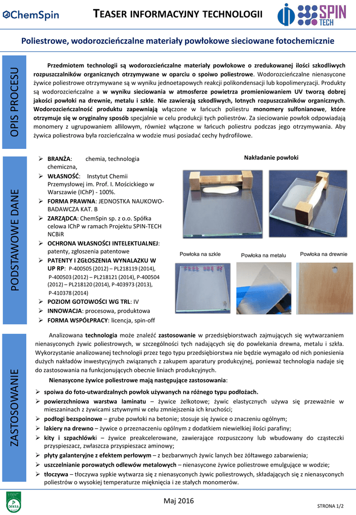 TEASER INFORMACYJNY TECHNOLOGII PODSTAWOWE DANE OPIS PROCESU Poliestrowe, wodorozcieńczalne materiały powłokowe sieciowane fotochemicznie Przedmiotem technologii są wodorozcieńczalne materiały powłokowe o zredukowanej ilości szkodliwych rozpuszczalników organicznych otrzymywane w oparciu o spoiwo poliestrowe. Wodorozcieńczalne nienasycone żywice poliestrowe otrzymywane są w wyniku jednoetapowych reakcji polikondensacji lub kopolimeryzacji. Produkty są wodorozcieńczalne a w wyniku sieciowania w atmosferze powietrza promieniowaniem UV tworzą dobrej jakości powłoki na drewnie, metalu i szkle. Nie zawierają szkodliwych, lotnych rozpuszczalników organicznych. Wodorozcieńczalność produktu zapewniają włączone w łańcuch poliestru monomery sulfonianowe, które otrzymuje się w oryginalny sposób specjalnie w celu produkcji tych poliestrów. Za sieciowanie powłok odpowiadają monomery z ugrupowaniem allilowym, również włączone w łańcuch poliestru podczas jego otrzymywania. Aby żywica poliestrowa była rozcieńczalna w wodzie musi posiadać cechy hydrofilowe. BRANŻA: chemia, technologia chemiczna, WŁASNOŚĆ: Instytut Chemii Przemysłowej im. Prof. I. Mościckiego w Warszawie (IChP) - 100%. FORMA PRAWNA: JEDNOSTKA NAUKOWOBADAWCZA KAT. B ZARZĄDCA: ChemSpin sp. z o.o. Spółka celowa IChP w ramach Projektu SPIN-TECH NCBiR OCHRONA WŁASNOŚCI INTELEKTUALNEJ: patenty, zgłoszenia patentowe PATENTY I ZGŁOSZENIA WYNALAZKU W UP RP: P-400505 (2012) – PL218119 (2014), Nakładanie powłoki Powłoka na szkle Powłoka na metalu Powłoka na drewnie P-400503 (2012) – PL218121 (2014), P-400504 (2012) – PL218120 (2014), P-403973 (2013), P-410378 (2014) ZASTOSOWANIE POZIOM GOTOWOŚCI WG TRL: IV INNOWACJA: procesowa, produktowa FORMA WSPÓŁPRACY: licencja, spin-off Analizowana technologia może znaleźć zastosowanie w przedsiębiorstwach zajmujących się wytwarzaniem nienasyconych żywic poliestrowych, w szczególności tych nadających się do powlekania drewna, metalu i szkła. Wykorzystanie analizowanej technologii przez tego typu przedsiębiorstwa nie będzie wymagało od nich poniesienia dużych nakładów inwestycyjnych związanych z zakupem aparatury produkcyjnej, ponieważ technologia nadaje się do zastosowania na funkcjonujących obecnie liniach produkcyjnych. Nienasycone żywice poliestrowe mają następujące zastosowania: spoiwa do foto-utwardzalnych powłok używanych na różnego typu podłożach. powierzchniowa warstwa laminatu – żywice żelkotowe; żywic elastycznych używa się przeważnie w mieszaninach z żywicami sztywnymi w celu zmniejszenia ich kruchości; podłogi bezspoinowe – grube powłoki na betonie; stosuje się żywice o znaczeniu ogólnym; lakiery na drewno – żywice o przeznaczeniu ogólnym z dodatkiem niewielkiej ilości parafiny; kity i szpachlówki – żywice preakcelerowane, zawierające rozpuszczony lub wbudowany do cząsteczki przyspieszacz, zwłaszcza przyspieszacz aminowy; płyty galanteryjne z efektem perłowym – z bezbarwnych żywic lanych bez żółtawego zabarwienia; uszczelnianie porowatych odlewów metalowych – nienasycone żywice poliestrowe emulgujące w wodzie; tłoczywa – tłoczywa sypkie wytwarza się z nienasyconych żywic poliestrowych, składających się z nienasyconych poliestrów o wysokiej temperaturze mięknięcia i ze stałych monomerów. Maj 2016 STRONA 1/2 TEASER INFORMACYJNY TECHNOLOGII PRZEWAGI KONK. ŻYWICE - POLSKA RYNEK ŻYWIC Poliestrowe, wodorozcieńczalne materiały powłokowe sieciowane fotochemicznie Rynek nienasyconych żywic poliestrowych w Unii Europejskiej obejmuje około 8 000 przedsiębiorstw, które zatrudniają ok. 100 tysięcy pracowników. Samych producentów nienasyconych żywic poliestrowych jest w Europie około pięćdziesięciu, najwięksi z nich to: Koninklijke DSM N.V. (Holnadia), TOTAL Cray Valley (Francja, główna siedziba w USA), Reichhold LLC (zakłady produkcyjne we Francji, Norwegii i Wielkiej Brytanii, główna siedziba w USA), Nexeo Solutions LLC (siedziba główna w USA) i Lonza Group (Szwajcaria). Wymienione przedsiębiorstwa odpowiadają za około 60% europejskich mocy wytwórczych nienasyconych żywic poliestrowych. Szacuje się, że wartość tego rynku w Unii Europejskiej 2020 roku osiągnie 85 mld EUR. Segmentacja rynku nienasyconych żywic poliestrowych: Główni producenci nienasyconych żywic poliestrowych w Polsce: CIECH Sarzyna S.A., Lerg S.A.; PPG Polifarb Cieszyn S.A.; Tikkurila Polska S.A. Technologia opracowana w IChP umożliwia otrzymanie wodorozcieńczalnej żywicy poliestrowej nie wymagającej procesu neutralizacji aminami oraz zastosowania lotnych rozpuszczalników organicznych podczas otrzymywania wodnych emulsji. Zatem przewagi technologicznej nowej technologii należy upatrywać w redukcji emisji zanieczyszczeń związanych z produkcją i stosowaniem wodorozcieńczalnych nienasyconych żywic poliestrowych. Opracowano podstawy produkcji foto-utwardzalnych, wodorozcieńczalnych, nienasyconych żywic poliestrowych (WNŻP) z ograniczoną zawartością lub pozbawionych VOC (volatile organic compounds). Popularną metodą hydrofilizacji żywic poliestrowych (a przez to umożliwianie im rozpuszczania się w wodzie) jest zastosowanie jonowych grup hydrofilowych, z których najczęściej wykorzystywane są ugrupowania karboksylowe. Otrzymuje się je poprzez wprowadzenie do struktury polimeru monomerów z wolnymi grupami karboksylowymi, a następnie ich jonizację, np. w reakcji z trzeciorzędową aminą. Polimery zawierające grupy karboksylowe tworzą odporne na działanie wody pokrycia, w wyniku procesu wysychania powłoki, podczas którego następuje przejście zjonizowanych ugrupowań karboksylanowych w grupy karboksylowe. Procesowi temu towarzyszy emisja szkodliwych, lotnych amin, co stanowi istotną wadę tego typu hydrofilizacji polimerów. Kontakt: Ewa Śmigiera ([email protected] tel. +48 604479112) Maj 2016 STRONA 2/2