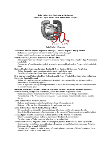 Folia Universitas Agriculturae Stetinensis Folia Univ. Agric. Stetin. 2005, Zootechnica 243 (47) Spis Treści – Contents Aleksandra Balicka-Ramisz, Bogumiła Pilarczyk, Tomasz Grupiński Alojzy Ramisz Badania nad rezerwuarem włośnicy wśród zwierząt wolno żyjących Studies on Trichinellosis reservoir among free living animals Piotr Baranowski, Barbara Binerowska, Monika Żbik Analiza porównawcza włókien włosowych owiec ras wrzosówka polska i Rauhwollige Pommersche Landschafe Comparison of hair fibres of the polish wrzosówka sheep and Rauhwollige Pommersche Landschafe sheep Bożena Chuda-Mickiewicz, Jarosław Prabucki, Jerzy Samborski Grzegorz Perużyński Wpływ dwutlenku węgla na dojrzewanie i wartość rozpłodową trutni The effect of carbon dioxide on drone maturation and breeding value Ewa Czerniawska-Piątkowska, Henryk Kamieniecki, Jerzy Wójcik Edyta Rzewucka, Małgorzata Szewczuk, Renata Pilarczyk Wpływ wieku pierwszego ocielenia na produkcyjność krów czarno-białych z różnym udziałem genów rasy holsztyńsko-fryzyjskiej Effect of age at first calving on the performance of black-and-white dairy cows with varied addition of holstein-friesian genes Danuta Czernomysy-Furowicz, Jolanta Karakulska, Antoni J. Furowicz, Janusz Kopyłowski, Paweł Nawrotek, Małgorzata Mizielińska, Jacek Borkowski, Magdalena Ferlas Ocena skuteczności immunostymulatora Propionibacterium acnes w terapii mastitis krów The estimation of the Propionibacterium acnes – based immune-stimulator in the bovine mastitis therapy Anna Dobrowolska, Kamila Górecka Budowa histologiczna poroża i kości długiej jelenia (Cervus elaphus L.) Histology of the red deer (Cervus elaphus L.) antlers and long bone Anna Dobrowolska, Marek Judka, Maciej Melosik Ołów postrzałowy jako źródło skażenia bażanta (Phasianus colchicus) i jego środowiska Shot-derived lead as a source of contamination in the pheasant (Phasianus colchicus) and its habitat Joanna Ignor, Jolanta Janiszewska, Katarzyna Paradecka Marcin Modzelewski Obserwacje zachowania się źrebiąt na pastwisku w Stadninie Koni Nowielice The observation of foals’ pasturing behaviour in Nowielice Stud Jolanta Janiszewska, Angelika Cieśla, Joanna Ignor, Iwonna Tabiszewska, Anna Szymańska Analiza zmian w strukturze rasowej koni zarodowych na terenie Zachodniopomorskiego Związku Hodowców Koni w latach 2000-2003 The analysis of changes in racial structure of breeding horses on terrain of West-Pomeranian Horse Breeders Association in years 2000-2003 Elżbieta Kalisińska, Wiesław Salicki, Halina Wołochowicz Mangan w twardych tkankach dwóch gatunków grążyc – ogorzałki Ayhtya marila i głowienki Ayhtya ferina Manganese in hard tissues of two Aythyini species the scaup (Ayhtya marila) and the pochard (Ayhtya ferina) Marek Kmieć, Arkadiusz Terman, Hanna Kulig, Daniel Polasik Analiza zależności między polimorfizmem genu receptora ryanodiny (RYR1) a niektórymi cechami użytkowości rozpłodowej świń Analysis of relationships between polymorphism in the ryanodin receptor gene (RYR1) and certain reproductive traits in pigs Marek Kmieć, Arkadiusz Terman, Joanna Ziemak, Inga Kowalewska-Łuczak Zależności między polimorfizmem genu receptora estrogenowego (ESR/AvaI, ESR/PvuII) a cechami nasienia knurów rasy polska biała zwisłoucha Associations between polymorphism of the estrogen receptor gene (ESR/AvaI, ESR/PvuII) and reproduction traits of Polish Landrace boars Stanisław Kondracki, Anna Wysokińska Charakterystyka zmian w budowie morfologicznej plemników knura, z uwzględnieniem wieku i rasy rozpłodnika Characterization of sperm abnormalities of boars with regard of age and breed Danuta Majewska, Danuta Szczerbińska, Zofia Tarasewicz, Ewa Linke Wpływ czasu przechowywania jaj przed inkubacją na wskaźniki wylęgowości strusia (Struthio camelus) Evaluation of ostrich (Struthio camelus) egg hatching results in relation to storage time Krum Petkov, Witold Podkówka, Izabela Jaskowska Jakość i wartość pokarmowa kiszonek z kukurydzy, wysłodków prasowanych, sianokiszonki z lucerny i porostu łąkowego jako podstawowych pasz objętościowych w systemach TMR i PMR Quality and nutrie value of maize, pressed sugar beet pulp, lucerne and sward silages as basic bulky feeds in TMR and PMR system Roman Petryshak, Yaroslaw Pivtorak, Krum Petkov, Olga Petryshak Kazimierz Bobko Influence of Humex preparation on growth and development of non-suckling piglets and Probiodor on digestibility of mixtures for experimental on laboratory rats Wpływ preparatu Humex na wzrost i rozwój prosiąt oraz preparatu Porobiodor na strawność mieszanki w doświadczeniu na szczurach laboratoryjnych Arkadiusz Pietruszka, Roman Czarnecki, Eugenia Jacyno Anita Kołodziej, Maria Kawęcka, Jacek Owsianny, Jan Udała Jakość nasienia młodych knurów mieszańców w zależności od genotypu RYR1 Semen quality of young crosbreed boars depending on RYR1 genotype Ryszard Pikuła, Mirosław Smugała, Żaneta Borowiec-Chłopek Iwonna Tabiszewska Polimorfizm genetyczny wybranych białek krwi koni rasy Standardbred Genetic polimorphism of proteins in Standardbred horses Bogumiła Pilarczyk, Aleksandra Balicka-Ramisz, Alojzy Ramisz Łukasz Laurans Występowanie pasożytów przewodu pokarmowego u psów i kotów z terenu miasta Szczecina Prevalence of parasites of the alimentary tract in dogs and cats from Szczecin region Bogumiła Pilarczyk, Aleksandra Balicka-Ramisz, Alojzy Ramisz Stach Vovk Osipocič1, Agnieszka Tomza, Marta Wieczorek Badania nad poziomem selenu w surowicy zwierząt gospodarskich pochodzących z Pomorza Zachodniego i zachodniej Ukrainy The investigation of serum selenium levels in farm animals from Western Pomerania and western Ukraine Artur Rybarczyk, Roman Szaruga, Wanda Natalczyk-Szymkowska Mięsność i jakość mięsa w zależności od masy tuszy ciepłej tuczników PEN AR LAN pochodzących z krzyżowania loch Naïma z knurami P-76 Leanness 