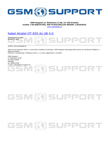 GSM-Support ul. Bitschana 2/38, 31-420 Kraków mobile +48 608107455, NIP PL9451852164 REGON: 120203925 www.jamepda.pl Kabel Alcatel OT-835 do UB 4.0 Obsługiwane modele: Alcatel OT-835 ©2012 www.jamepda.pl Opis ten nie stanowi oferty w rozumieniu Kodeksu Cywilnego. GSM-Support zastrzega sobie prawo do możliwych błędów w opisie produktu. Prosimy o weryfikację z Państwa strony, a w razie wątpliwości o kontakt. GSM-Support ul. Bitschana 2/38 31-420 Kraków POLSKA tel. 608107455 e-mail: [email protected] Powered by TCPDF (www.tcpdf.org)