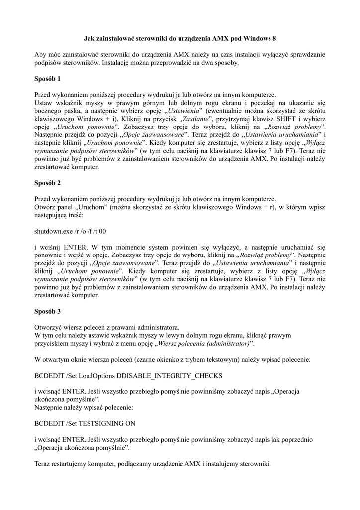 Jak zainstalować sterowniki do urządzenia AMX pod Windows 8 Aby móc zainstalować sterowniki do urządzenia AMX należy na czas instalacji wyłączyć sprawdzanie podpisów sterowników. Instalację można przeprowadzić na dwa sposoby. Sposób 1 Przed wykonaniem poniższej procedury wydrukuj ją lub otwórz na innym komputerze. Ustaw wskaźnik myszy w prawym górnym lub dolnym rogu ekranu i poczekaj na ukazanie się bocznego paska, a następnie wybierz opcję „Ustawienia” (ewentualnie można skorzystać ze skrótu klawiszowego Windows + i). Kliknij na przycisk „Zasilanie”, przytrzymaj klawisz SHIFT i wybierz opcję „Uruchom ponownie”. Zobaczysz trzy opcje do wyboru, kliknij na „Rozwiąż problemy”. Następnie przejdź do pozycji „Opcje zaawansowane”. Teraz przejdź do „Ustawienia uruchamiania” i następnie kliknij „Uruchom ponownie”. Kiedy komputer się zrestartuje, wybierz z listy opcję „Wyłącz wymuszanie podpisów sterowników” (w tym celu naciśnij na klawiaturze klawisz 7 lub F7). Teraz nie powinno już być problemów z zainstalowaniem sterowników do urządzenia AMX. Po instalacji należy zrestartować komputer. Sposób 2 Przed wykonaniem poniższej procedury wydrukuj ją lub otwórz na innym komputerze. Otwórz panel „Uruchom” (można skorzystać ze skrótu klawiszowego Windows + r), w którym wpisz następującą treść: shutdown.exe /r /o /f /t 00 i wciśnij ENTER. W tym momencie system powinien się wyłączyć, a następnie uruchamiać się ponownie i wejść w opcje. Zobaczysz trzy opcje do wyboru, kliknij na „Rozwiąż problemy”. Następnie przejdź do pozycji „Opcje zaawansowane”. Teraz przejdź do „Ustawienia uruchamiania” i następnie kliknij „Uruchom ponownie”. Kiedy komputer się zrestartuje, wybierz z listy opcję „Wyłącz wymuszanie podpisów sterowników” (w tym celu naciśnij na klawiaturze klawisz 7 lub F7). Teraz nie powinno już być problemów z zainstalowaniem sterowników do urządzenia AMX. Po instalacji należy zrestartować komputer. Sposób 3 Otworzyć wiersz poleceń z prawami administratora. W tym celu należy ustawić wskaźnik myszy w lewym dolnym rogu ekranu, kliknąć prawym przyciskiem myszy i wybrać z menu opcję „Wiersz polecenia (administrator)”. W otwartym oknie wiersza poleceń (czarne okienko z trybem tekstowym) należy wpisać polecenie: BCDEDIT /Set LoadOptions DDISABLE_INTEGRITY_CHECKS i wcisnąć ENTER. Jeśli wszystko przebiegło pomyślnie powinniśmy zobaczyć napis „Operacja ukończona pomyślnie”. Następnie należy wpisać polecenie: BCDEDIT /Set TESTSIGNING ON i wcisnąć ENTER. Jeśli wszystko przebiegło pomyślnie powinniśmy zobaczyć napis jak poprzednio „Operacja ukończona pomyślnie”. Teraz restartujemy komputer, podłączamy urządzenie AMX i instalujemy sterowniki. Po zainstalowaniu sterowników zalecamy ponownie włączyć sprawdzanie podpisów sterowników. W tym celu należy otworzyć wierz poleceń z prawami administratora i wpisać polecenie: BCDEDIT /Set LoadOptions ENABLE_INTEGRITY_CHECKS i wcisnąć ENTER. Jeśli wszystko przebiegło pomyślnie powinniśmy zobaczyć napis „Operacja ukończona pomyślnie”. Następnie należy wpisać polecenie: BCDEDIT /Set TESTSIGNING OFF i wcisnąć ENTER. Jeśli wszystko przebiegło pomyślnie powinniśmy zobaczyć napis jak poprzednio „Operacja ukończona pomyślnie”. Restartujemy komputer i gotowe.