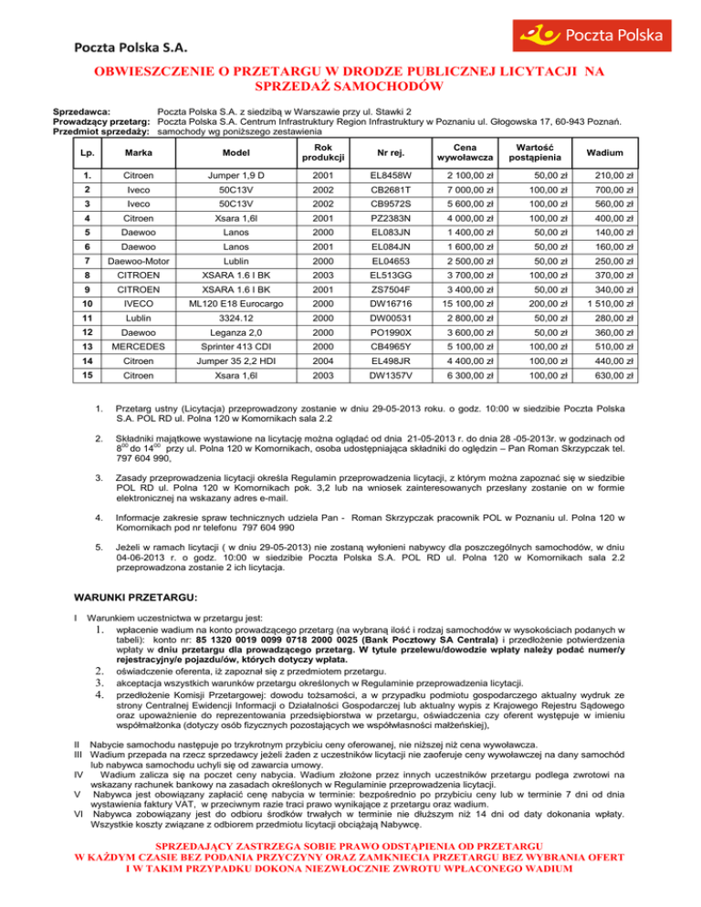 OBWIESZCZENIE O PRZETARGU W DRODZE PUBLICZNEJ LICYTACJI NA SPRZEDAŻ SAMOCHODÓW Sprzedawca: Poczta Polska S.A. z siedzibą w Warszawie przy ul. Stawki 2 Prowadzący przetarg: Poczta Polska S.A. Centrum Infrastruktury Region Infrastruktury w Poznaniu ul. Głogowska 17, 60-943 Poznań. Przedmiot sprzedaży: samochody wg poniższego zestawienia Cena wywoławcza Wartość postąpienia Lp. Marka Model Rok produkcji Nr rej. 1. Citroen Jumper 1,9 D 2001 EL8458W 2 100,00 zł 50,00 zł 210,00 zł 2 Iveco 50C13V 2002 CB2681T 7 000,00 zł 100,00 zł 700,00 zł Wadium 3 Iveco 50C13V 2002 CB9572S 5 600,00 zł 100,00 zł 560,00 zł 4 Citroen Xsara 1,6l 2001 PZ2383N 4 000,00 zł 100,00 zł 400,00 zł 5 Daewoo Lanos 2000 EL083JN 1 400,00 zł 50,00 zł 140,00 zł 6 Daewoo Lanos 2001 EL084JN 1 600,00 zł 50,00 zł 160,00 zł 7 Daewoo-Motor Lublin 2000 EL04653 2 500,00 zł 50,00 zł 250,00 zł 8 CITROEN XSARA 1.6 I BK 2003 EL513GG 3 700,00 zł 100,00 zł 370,00 zł 9 CITROEN XSARA 1.6 I BK 2001 ZS7504F 3 400,00 zł 50,00 zł 340,00 zł 10 IVECO ML120 E18 Eurocargo 2000 DW16716 15 100,00 zł 200,00 zł 1 510,00 zł 11 Lublin 3324.12 2000 DW00531 2 800,00 zł 50,00 zł 280,00 zł 12 Daewoo Leganza 2,0 2000 PO1990X 3 600,00 zł 50,00 zł 360,00 zł 13 MERCEDES Sprinter 413 CDI 2000 CB4965Y 5 100,00 zł 100,00 zł 510,00 zł 14 Citroen Jumper 35 2,2 HDI 2004 EL498JR 4 400,00 zł 100,00 zł 440,00 zł 15 Citroen Xsara 1,6l 2003 DW1357V 6 300,00 zł 100,00 zł 630,00 zł 1. Przetarg ustny (Licytacja) przeprowadzony zostanie w dniu 29-05-2013 roku. o godz. 10:00 w siedzibie Poczta Polska S.A. POL RD ul. Polna 120 w Komornikach sala 2.2 2. Składniki majątkowe wystawione na licytację można oglądać od dnia 21-05-2013 r. do dnia 28 -05-2013r. w godzinach od 800 do 1400 przy ul. Polna 120 w Komornikach, osoba udostępniająca składniki do oględzin – Pan Roman Skrzypczak tel. 797 604 990, 3. Zasady przeprowadzenia licytacji określa Regulamin przeprowadzenia licytacji, z którym można zapoznać się w siedzibie POL RD ul. Polna 120 w Komornikach pok. 3,2 lub na wniosek zainteresowanych przesłany zostanie on w formie elektronicznej na wskazany adres e-mail. 4. Informacje zakresie spraw technicznych udziela Pan - Roman Skrzypczak pracownik POL w Poznaniu ul. Polna 120 w Komornikach pod nr telefonu 797 604 990 5. Jeżeli w ramach licytacji ( w dniu 29-05-2013) nie zostaną wyłonieni nabywcy dla poszczególnych samochodów, w dniu 04-06-2013 r. o godz. 10:00 w siedzibie Poczta Polska S.A. POL RD ul. Polna 120 w Komornikach sala 2.2 przeprowadzona zostanie 2 ich licytacja. WARUNKI PRZETARGU: I Warunkiem uczestnictwa w przetargu jest: 1. wpłacenie wadium na konto prowadzącego przetarg (na wybraną ilość i rodzaj samochodów w wysokościach podanych w tabeli): konto nr: 85 1320 0019 0099 0718 2000 0025 (Bank Pocztowy SA Centrala) i przedłożenie potwierdzenia wpłaty w dniu przetargu dla prowadzącego przetarg. W tytule przelewu/dowodzie wpłaty należy podać numer/y rejestracyjny/e pojazdu/ów, których dotyczy wpłata. 2. oświadczenie oferenta, iż zapoznał się z przedmiotem przetargu. 3. akceptacja wszystkich warunków przetargu określonych w Regulaminie przeprowadzenia licytacji. 4. przedłożenie Komisji Przetargowej: dowodu tożsamości, a w przypadku podmiotu gospodarczego aktualny wydruk ze strony Centralnej Ewidencji Informacji o Działalności Gospodarczej lub aktualny wypis z Krajowego Rejestru Sądowego oraz upoważnienie do reprezentowania przedsiębiorstwa w przetargu, oświadczenia czy oferent występuje w imieniu współmałżonka (dotyczy osób fizycznych pozostających we współwłasności małżeńskiej), II Nabycie samochodu następuje po trzykrotnym przybiciu ceny oferowanej, nie niższej niż cena wywoławcza. III Wadium przepada na rzecz sprzedawcy jeżeli żaden z uczestników licytacji nie zaoferuje ceny wywoławczej na dany samochód lub nabywca samochodu uchyli się od zawarcia umowy. IV Wadium zalicza się na poczet ceny nabycia. Wadium złożone przez innych uczestników przetargu podlega zwrotowi na wskazany rachunek bankowy na zasadach określonych w Regulaminie przeprowadzenia licytacji. V Nabywca jest obowiązany zapłacić cenę nabycia w terminie: bezpośrednio po przybiciu ceny lub w terminie 7 dni od dnia wystawienia faktury VAT, w przeciwnym razie traci prawo wynikające z przetargu oraz wadium. VI Nabywca zobowiązany jest do odbioru środków trwałych w terminie nie dłuższym niż 14 dni od daty dokonania wpłaty. Wszystkie koszty związane z odbiorem przedmiotu licytacji obciążają Nabywcę. SPRZEDAJĄCY ZASTRZEGA SOBIE PRAWO ODSTĄPIENIA OD PRZETARGU W KAŻDYM CZASIE BEZ PODANIA PRZYCZYNY ORAZ ZAMKNIECIA PRZETARGU BEZ WYBRANIA OFERT I W TAKIM PRZYPADKU DOKONA NIEZWŁOCZNIE ZWROTU WPŁACONEGO WADIUM