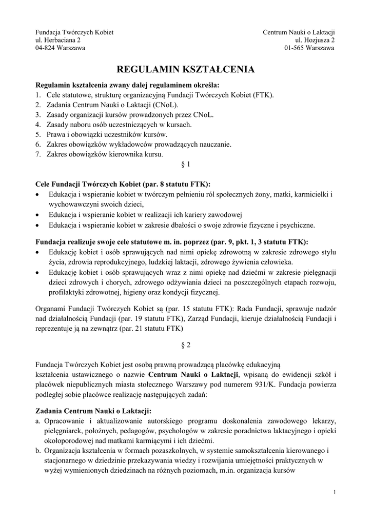 Fundacja Twórczych Kobiet ul. Herbaciana 2 04-824 Warszawa Centrum Nauki o Laktacji ul. Hozjusza 2 01-565 Warszawa REGULAMIN KSZTAŁCENIA Regulamin kształcenia zwany dalej regulaminem określa: 1. Cele statutowe, strukturę organizacyjną Fundacji Twórczych Kobiet (FTK). 2. Zadania Centrum Nauki o Laktacji (CNoL). 3. Zasady organizacji kursów prowadzonych przez CNoL. 4. Zasady naboru osób uczestniczących w kursach. 5. Prawa i obowiązki uczestników kursów. 6. Zakres obowiązków wykładowców prowadzących nauczanie. 7. Zakres obowiązków kierownika kursu. §1 Cele Fundacji Twórczych Kobiet (par. 8 statutu FTK): Edukacja i wspieranie kobiet w twórczym pełnieniu ról społecznych żony, matki, karmicielki i wychowawczyni swoich dzieci, Edukacja i wspieranie kobiet w realizacji ich kariery zawodowej Edukacja i wspieranie kobiet w zakresie dbałości o swoje zdrowie fizyczne i psychiczne. Fundacja realizuje swoje cele statutowe m. in. poprzez (par. 9, pkt. 1, 3 statutu FTK): Edukację kobiet i osób sprawujących nad nimi opiekę zdrowotną w zakresie zdrowego stylu życia, zdrowia reprodukcyjnego, ludzkiej laktacji, zdrowego żywienia człowieka. Edukację kobiet i osób sprawujących wraz z nimi opiekę nad dziećmi w zakresie pielęgnacji dzieci zdrowych i chorych, zdrowego odżywiania dzieci na poszczególnych etapach rozwoju, profilaktyki zdrowotnej, higieny oraz kondycji fizycznej. Organami Fundacji Twórczych Kobiet są (par. 15 statutu FTK): Rada Fundacji, sprawuje nadzór nad działalnością Fundacji (par. 19 statutu FTK), Zarząd Fundacji, kieruje działalnością Fundacji i reprezentuje ją na zewnątrz (par. 21 statutu FTK) §2 Fundacja Twórczych Kobiet jest osobą prawną prowadzącą placówkę edukacyjną kształcenia ustawicznego o nazwie Centrum Nauki o Laktacji, wpisaną do ewidencji szkół i placówek niepublicznych miasta stołecznego Warszawy pod numerem 931/K. Fundacja powierza podległej sobie placówce realizację następujących zadań: Zadania Centrum Nauki o Laktacji: a. Opracowanie i aktualizowanie autorskiego programu doskonalenia zawodowego lekarzy, pielęgniarek, położnych, pedagogów, psychologów w zakresie poradnictwa laktacyjnego i opieki okołoporodowej nad matkami karmiącymi i ich dziećmi. b. Organizacja kształcenia w formach pozaszkolnych, w systemie samokształcenia kierowanego i stacjonarnego w dziedzinie przekazywania wiedzy i rozwijania umiejętności praktycznych w wyżej wymienionych dziedzinach na różnych poziomach, m.in. organizacja kursów 1 c. d. e. f. g. dokształcających i specjalistycznych dla pielęgniarek, położnych i kursów medycznych dla lekarzy. (par. 5, statutu CNoL) Zgodnie z dyrektywą UE Dyrektywa Komisji Europejskiej 2006/141/WE z dnia 22 grudnia 2006 oraz Wzorcem Działania dla Europy (2006) kształcenie profesjonalnych doradców laktacyjnych i zgodnie ze statutem CNoL nadawanie im tytułu Certyfikowany Doradca Laktacyjny. Wdrażanie do wyżej wymienionych dziedzin kształcenia nowoczesnych metod i technik audiowizualnych oraz metod aktywizujących.(par. 5 statutu CNoL) Dbanie o wysoki poziom przekazywanych treści nauczania poprzez staranny dobór kadry nauczycielskiej, posiadającej doświadczenie pedagogiczne i zawodowe. (par. 5 statutu CNoL). Prowadzenie kształcenia kadry i udoskonalanie jej umiejętności dydaktycznych i poszerzanie warsztatu pracy. Zaspokajanie potrzeb społecznych w zakresie poszerzania wiedzy i doskonalenia umiejętności zawodowych. (par. 5, statutu CNoL) Aktywizacja zawodowa uczestników kursów . §3 Zasady organizacji kursu: 1. Kursy prowadzone są w oparciu o 1. autorskie programy opracowane przez egzaminatorów CNoL (Magdalenę Nehring – Gugulską, Monikę Żukowską – Rubik, Joannę Żołnowską, Agnieszkę Pietkiewicz, Agnieszkę Muszyńską, Kingę Osuch, Barbarę Królak-Olejnik); 2. programy kursów specjalistycznych udostępniane przez Centrum Kształcenia Podyplomowego Pielęgniarek i Położnych. 2. Programy kształcenia odpowiadają dwóm poziomom wiedzy o laktacji według Wellstart International & University of California San Diego. Lactation Management Curriculum Guide. A faculty guide for schools of medicine, nursing and nutrition. California: Wellestart International; 1999. (Wer. polska. Żukowska-Rubik M, red. Przewodnik nauczania o karmieniu piersią. Wskazówki metodyczne dla wydziałów medycyny, pielęgniarstwa i żywienia. I wydanie polskie. Tłum. Banaszkiewicz A, Niecikowska K, Oslislo A, Ślizień-Kuczapska E. Warszawa: KUKP; 2002). Poziom II 6 godz. Karmienie piersią w praktyce szpitala 12 godz. Karmienie piersią - standard w opiece okołoporodowej. 12 godz. Karmienie piersią i mlekiem kobiecym wcześniaków i dzieci chorych standard opieki w szpitalach III poziomu referencyjnego. 46 godz. Edukacja i wsparcie kobiety w okresie laktacji - kurs specjalistyczny. 3 godz. Karmienie piersią w praktyce lekarza 20 godz. Promotor karmienia piersią 6 godz. Wspieranie kobiet w sytuacjach kryzysowych w okresie okołoporodowym warsztaty psychologiczne. Poziom III 95 godz. Problemy w laktacji (dla kandydatów na certyfikaty CDL, IBCLC) 2 3. Kursy są prowadzone w siedzibie CNoL, w sali wykładowej wyposażonej w podstawowy sprzęt wizualny, wynajętej od Fundacji Bonum prowadzącej Dom Pielgrzyma Amicus w Warszawie przy ul. Hozjusza 2 lub FZZ Metalowcy ul. Długa 29, a także na terenie współpracujących jednostek. 4. Zajęcia praktyczne (praktyki pod nadzorem) organizowane są w poradniach laktacyjnych w poradniach laktacyjnych lub na oddziałach położniczych, z którymi organizator podpisuje umowy. Praktyki są prowadzone pod nadzorem trenerów CNoL. Wykaz trenerów oraz placówek jest dostępny na stronie www.kobiety.med.pl/cnol . Zakres i sposób zaliczenia zajęć regulują osobne zapisy w Przewodniku dla kandydatów. 5. Na zakończenie kursów odbywają się warsztaty, quizy lub testy sprawdzające wyniki kształcenia. 6. Potwierdzeniem uczestni