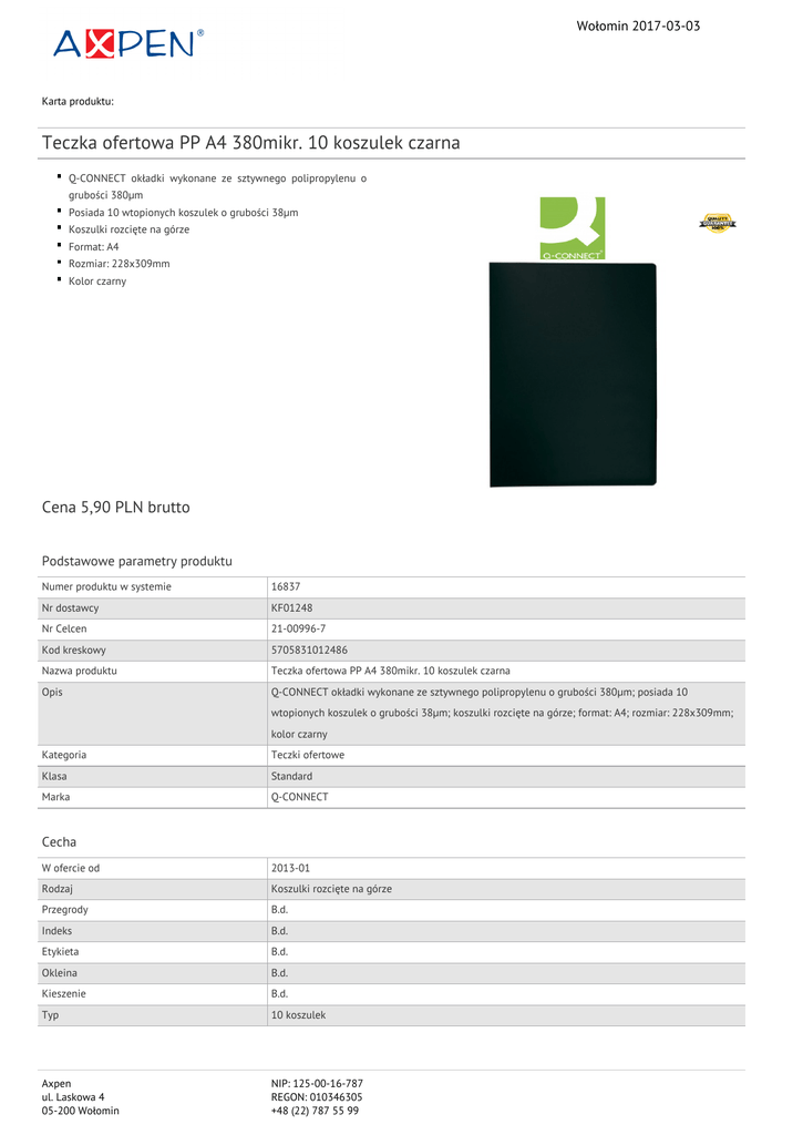 Wołomin 2017-03-03 Karta produktu: Teczka ofertowa PP A4 380mikr. 10 koszulek czarna Q-CONNECT okładki wykonane ze sztywnego polipropylenu o grubości 380μm Posiada 10 wtopionych koszulek o grubości 38μm Koszulki rozcięte na górze Format: A4 Rozmiar: 228x309mm Kolor czarny Cena 5,90 PLN brutto Podstawowe parametry produktu Numer produktu w systemie 16837 Nr dostawcy KF01248 Nr Celcen 21-00996-7 Kod kreskowy 5705831012486 Nazwa produktu Teczka ofertowa PP A4 380mikr. 10 koszulek czarna Opis Q-CONNECT okładki wykonane ze sztywnego polipropylenu o grubości 380μm; posiada 10 wtopionych koszulek o grubości 38μm; koszulki rozcięte na górze; format: A4; rozmiar: 228x309mm; kolor czarny Kategoria Teczki ofertowe Klasa Standard Marka Q-CONNECT Cecha W ofercie od 2013-01 Rodzaj Koszulki rozcięte na górze Przegrody B.d. Indeks B.d. Etykieta B.d. Okleina B.d. Kieszenie B.d. Typ 10 koszulek Axpen ul. Laskowa 4 05-200 Wołomin NIP: 125-00-16-787 REGON: 010346305 +48 (22) 787 55 99 Wołomin 2017-03-03 Karta katalogowa produktu cd. Teczka ofertowa PP A4 380mikr. 10 koszulek czarna Produkt Teczka Materiał Pp Wymiary Format A4 Rozmiar 10 koszulek Grubość (mm) 380/38µm Gramatura (g/m2) B.d. Wymiary (mm) 228x309 Ilość Ilość kartek B.d. Wspólny słownik zamówień CPV 22852000-7 Foldery Certyfikaty Nowy produkt w ofercie Standard Hit Standard Kolor Kolor Czarny Pozostałe zdjęcia produktu Serdecznie zapraszamy do współpracy Axpen zespół. Axpen ul. Laskowa 4 05-200 Wołomin NIP: 125-00-16-787 REGON: 010346305 +48 (22) 787 55 99