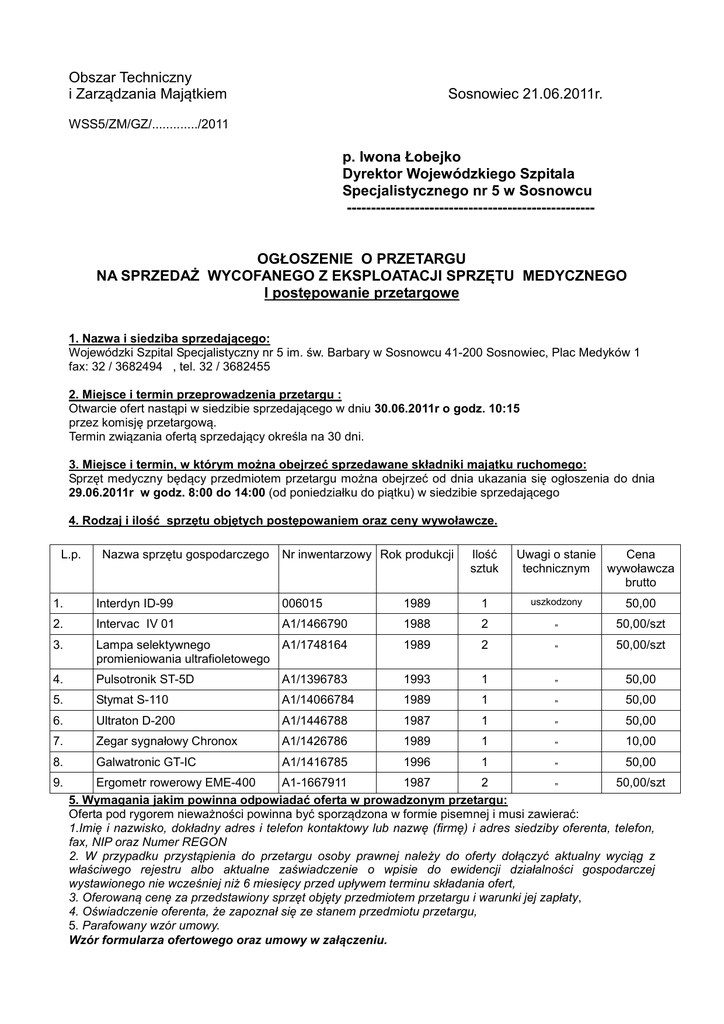 Ogłoszenie - wyposażenie - Wojewódzki Szpital Specjalistyczny nr 5