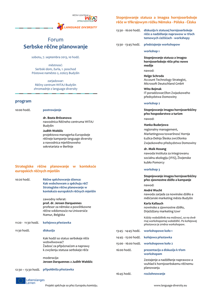 Stopnjowanje statusa a imagea hornjoserbskeje rěče w třikrajowym róžku Němska - Pólska - Čěska Forum Serbske rěčne planowanje 13:30 - 16:00 hodź. diskusija k statusej hornjoserbskeje rěče a nadźěłanje naprawow w třoch temowych ćežišćach - workshopy 13:30 - 13:45 hodź. předstajenje workshopow workshop 1 sobotu, 7. septembra 2013, 10 hodź. Stopnjowanje statusa a imagea hornjoserbskeje rěče přez nowe medije městnosć: Serbski dom, žurla, 1. poschod Póstowe naměsto 2, 02625 Budyšin nawod: Helge Schroda Account Technology Strategist, Microsoft Deutschland GmbH zarjadowar: Rěčny centrum WITAJ Budyšin zhromadnje z language diversity Wito Bejmak IT-poradźowar/čłon Zwjazkoweho předsydstwa Domowiny program 10:00 hodź. workshop 2 postrowjenje Stopnjowanje imagea hornjoserbšćiny přez hospodarstwo a turizm dr. Beata Brězanowa nawodnica Rěčneho centruma WITAJ Budyšin nawod: Hanka Budarjowa regionalny management, Marketingowa towaršnosć Hornja Łužica-Delnja Šleska zwr/čłonka Zwjazkoweho předsydstwa Domowiny Judith Wałdźic projektowa managerka Europskeje rěčneje kampanje language diversity a nawodnica mjeńšinoweho sekretariata w Berlinje Strategiske rěčne planowanje europskich rěčnych mjeńšin 10:20 hodź. w dr. Maik Hosang nawoda Instituta za integrowanu socialnu ekologiju (IFIS), Žiwjenske kubło Pomorcy konteksće workshop 3 Stopnjowanje imagea hornjoserbšćiny přez zjawnostne dźěło a kampanje Rěčne spěchowanje dźensa: Kak wobchowam a spěchuju rěč? Strategiske rěčne planowanje w konteksće europskich rěčnych mjeńšin nawod: André Wucht nawoda zarjada za nowinske dźěło a měšćanski marketing města Budyšin zawodny referat: prof. dr. Jeroen Darquennes profesor za němske a powšitkowne rěčne wědomosće na Uniwersiće Namur, Belgiska Karla Kallauch nowinske a zjawnostne dźěło, Drježdźany marketing tzwr Kóždy wobdźělnik ma móžnosć, so na dwěmaj workshopomaj wobdźělić. Po kofejowej přestawce je změna workshopow. 11:20 - 11:30 hodź. kofejowa přestawka 11:30 hodź. diskusija 13:45 - 14:45 hodź. workshopowe koło 1 Kak hodźi so status serbskeje rěče wobwliwować? Žadosć za připóznaćom a naprawy k zwyšenju statusa serbskeje rěče 14:45 - 15:00 hodź. kofejowa přestawka 15:00 - 16:00 hodź. workshopowe koło 2 16:00 hodź. moderacija: Jeroen Darquennes a Judith Wałdźic Zestajenje a nadźěłanje naprawow a wuhlad k hornjoserbskemu rěčnemu planowanju 12:30 – 13:30 hodź. připołdniša přestawka 16:45 hodź. Projekt spěchuje so přez Europsku komisiju. prezentacija a diskusija k třom workshopam rozžohnowanje www.language-diversity.eu
