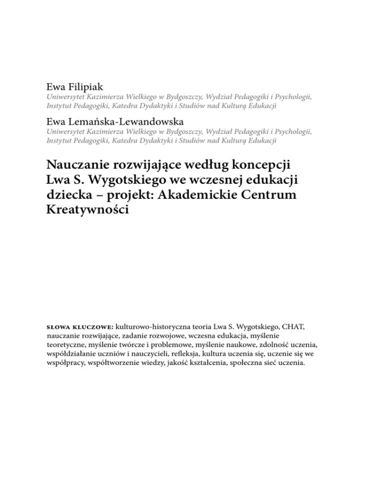 Ewa Filipiak Uniwersytet Kazimierza Wielkiego w Bydgoszczy, Wydział Pedagogiki i Psychologii, Instytut Pedagogiki, Katedra Dydaktyki i Studiów nad Kulturą Edukacji Ewa Lemańska-Lewandowska Uniwersytet Kazimierza Wielkiego w Bydgoszczy, Wydział Pedagogiki i Psychologii, Instytut Pedagogiki, Katedra Dydaktyki i Studiów nad Kulturą Edukacji Nauczanie rozwijające według koncepcji Lwa S. Wygotskiego we wczesnej edukacji dziecka – projekt: Akademickie Centrum Kreatywności słowa kluczowe: kulturowo-historyczna teoria Lwa S. Wygotskiego, CHAT, nauczanie rozwijające, zadanie rozwojowe, wczesna edukacja, myślenie teoretyczne, myślenie twórcze i problemowe, myślenie naukowe, zdolność uczenia, współdziałanie uczniów i nauczycieli, refleksja, kultura uczenia się, uczenie się we współpracy, współtworzenie wiedzy, jakość kształcenia, społeczna sieć uczenia. Kontakt: Ewa Filipiak [email protected] Ewa Lemańska-Lewandowska [email protected] Jak cytować: Filipiak, E., Lemańska-Lewandowska, E. (2015). Nauczanie rozwijające według koncepcji Lwa S. Wygotskiego we wczesnej edukacji dziecka – projekt: Akademickie Centrum Kreatywności. Forum Oświatowe, 27(1), 161–165. Pobrane z: http:// forumoswiatowe.pl/index.php/czasopismo/article/view/380 How to cite: Filipiak, E., & Lemańska-Lewandowska, E. (2015). Nauczanie rozwijające według koncepcji Lwa S. Wygotskiego we wczesnej edukacji dziecka – projekt: Akademickie Centrum Kreatywności. Forum Oświatowe, 27(1), 161–165. Retrieved from http:// forumoswiatowe.pl/index.php/czasopismo/article/view/380 Kulturowo-historyczna teoria rozwoju Lwa S. Wygotskiego (CHAT) inspiruje do myślenia o zmianie i rozwoju w edukacji, podejmowania projektów badawczych. Akademickie Centrum Kreatywności, działające przy Uniwersytecie Kazimierza Wielkiego w Bydgoszczy, to jedna z dziewięciu jednostek w kraju, utworzonych w ramach programu Ministra Nauki i Szkolnictwa Wyższego (decyzja nr 7/POIG/ ACK/2014). Projekt ten był jednym z 9 najlepszych projektów z całego kraju, zakwalifikowanym do realizacji w drodze konkursu, w celu wykorzystywania potencjału szkoły wyższej do kształcenia przyszłych nauczycieli. Prowadzono go w terminie: 15 XII 2014–15 XI 2015. Głównym zamierzeniem projektu było opracowanie (testowanie i popularyzacja) innowacyjnego modelu pracy nauczyciela/studenta z uczniem w oparciu o koncepcję Lwa S. Wygotskiego. Obszarem badań uczyniono okres wczesnej edukacji i specyfikę przygotowania nauczyciela do pracy z dzieckiem w tym etapie, stanowiącym fundament dalszej edukacji. To właśnie pierwsze lata pobytu dziecka w szkole utrwalają nawyki myślenia i rozumienia, przesądzają o dalszej karierze ucznia. Nauczyciele I poziomu edukacji muszą być wsparciem dla dziecka w nauce kreatywności i twórczego rozwiązywania problemów. Konieczna jest zmiana sposobu ich kształcenia, filozofii myślenia, przekonań, a także redefinicja profesjonalizmu nauczycielskiego. Studenci – beneficjenci projektu uczestniczyli w cyklu warsztatów, podczas których rozwijali kompetencje „nauczyciela–kreatora nauczania rozwijającego”. Byli przygotowywani do poznawania i wdrażania „nauczania rozwijającego”, rozwijania u dzieci myślenia teoretycznego, twórczego, krytycznego, problemowego i projektowego. Kształtowali także umiejętność uczenia we współpracy oraz reagowania na potrzeby ucznia. Celem podjętych działań projektowych było przygotowanie studentów do (z)rozumienia zmiany edukacyjnej, wejścia w rolę promotora zmian. Autorem i kierownikiem projektu ACK jest prof. dr hab. Ewa Filipiak, kierownik Katedry Dydaktyki i Studiów nad Kulturą Edukacji Uniwersytetu Kazimierza Wielkiego w Bydgoszczy. Koordynatorem projektu – dr Ewa Lemańska-Lewandowska. 162 Forum Oświatowe 27(1) Sprawozdania Członkowie zespołu badawczego to: dr Małgorzata Wiśniewska, mgr Joanna Szymczak, mgr Adam Mroczkowski, mgr Goretta Siadak. Unikatową grupę projektową stanowiły 3 zróżnicowane zespoły: (1) zespół naukowo- badawczy Katedry Dydaktyki i Studiów nad Kulturą Edukacji Uniwersytetu Kazimierza Wielkiego w Bydgoszczy, (2) zespół nauczycielek-interwencjonistek, (3) zespół studentów-beneficjentów kierunku pedagogika wczesnoszkolna Uniwersytetu Kazimierza Wielkiego w Bydgoszczy. Zespoły te tworzyły bazę dla konstruowania przestrzeni społecznej sieci uczenia się, dzięki której uczestnicy doświadczali autentycznego współtworzenia wiedzy w edukacyjnym działaniu, pogłębionego transferu pomiędzy Nowicjuszem (studentem) a Ekspertem (nauczycielem). Zaangażowane uczestnictwo studentów w projekcie przyczyniło się do zainicjowania zmiany ich filozofii edukacyjnej, rozumienia zmiany edukacyjnej, wejścia w rolę promotora zmian. Doświadczenia studentów były dokumentowane na blogu oraz w prowadzonych przez studentów e-portfolio. Efekty projektu zostały zaprezentowane na seminarium naukowym z udziałem ekspertów zagranicznych. Seminarium naukowe pt. „Koncepcja nauczania rozwijającego według teorii Lwa S. Wygotskiego we wczesnej edukacji dziecka – podsumowanie projektu Akademickiego Centrum Kreatywności, nr projektu 7/POIG/ACK/2014” odbyło się 20–21 października 2015. Pierwszego dnia seminarium prof. dr hab. Ewa Filipiak dokonała merytorycznego wprowadzenia, prezentując model nauczania rozwijającego w kontekście teorii L.S. Wygotskiego oraz przybliżając kategorię zadania rozwojowego i jego rolę w rozwijaniu myślenia i uczenia się dzieci, wygłaszając wykłady, pt. „Możliwości budowania rusztowania dla myślenia i uczenia się dzieci w perspektywie kulturowo-historycznej teorii Lwa S. Wygotskiego” i „Możliwości rozwijania myślenia i uczenia się dzieci poprzez stawianie zadań rozwojowych – prezentacja wyników projektu”. Ewa Filipiak i Ewa Lemańska-Lewandowska zapoznały uczestników seminarium z ideą projektu Akademickiego Centrum Kreatywności 