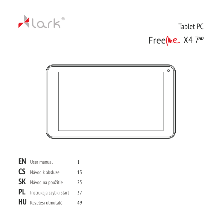 Tablet PC X4 7HD EN CS SK PL HU User manual 1 Návod k obsluze 13 Návod na použitie 25 Instrukcja szybki start 37 Kezelési útmutató 49 Before you begin Thank you for choosing Lark FreeMe X4 7HD tablet . We wish you many satisfaction from its use. Tablet PC is a multi-functional device, which can be used for work and education and for entertainment as well. Thanks to the tablet you have the Internet always in your reach, without need of bulky personal computers of previous generation. Android 4.4 KitKat and Google Play enable access to plenty of useful applications, for both business and entertainment purposes. Clear and intuitive interface gives you the pleasure of dailyuse of the tablet. Please read the user guide and keep it for further reference.The user guide contains important information regarding safe and effective use of the tablet. The producer mayintroduce changes in the device and the user guide. Please refer to the www.lark.com.pl website in case of questions or doubts concerning use of the device. 1 Before you begin Safetyand handling Prevent your tablet and accessories from getting wet. Getting electrical equipment wet not only causes serious damage, but it is also a threat to the user (risk of electric shock). Protect your device against shocks, falls and vibrations. Protect the device from high and low temperatures. Do not drop, bend, puncture, insert foreign objects, or place heavyobjects on your tablet. Do not use unauthorized accessories, as the maydamage the tablet and void manufacturer's warranty. Important safetyinstructions Be sure to follow instructions bellow. Make sure that theyare known to all users of your tablet, including children.. Never use your tablet while driving. Hospitals and other medical facilities may be prohibited from using electronic devices, including tablets. Always follow these restrictions. Turn off the tablet in the plane for the whole flight or during take-off and landing, according to the instructions given bythe aircraft personnel. Switch off the device near important electronic devices, which could be disrupted bypossible interference. Do not attempt to disassemble, modifyor repair the tablet. Always entrust these tasks to authorized specialist. Protect your tablet from strong magnetic fields.These fields can damage magnetic storage media. Do not use the tablet in veryhigh temperatures or in areas at high risk of fire or explosion, such as petrol stations. 2 Before you begin Supervise the use of the device bychildren, do not let them playwith the tablet unattended. Prevent the tablet from getting wet, for instance do not use or store it in the bathroom. The symbol to the left means that according to European Union laws and regulations your product and/or its battery shall be disposed of separately from household waste. When this product reaches its end of life, take it to a collection point designated by local authorities. The separate collection and recycling of your product and/or its battery at the time of disposal will help conserve natural resources and ensure that it is recycled in a manner that protects human health and the environment. 3 Product overview Parts and buttons of the device 2 1 1. Touch screen 2. Front camera 4 Product overview 3 6 7 8 9 10 5 4 3. Speaker 7. 4. RESET button 8. Micro USB port 5. MicroSD card slot 9. Power adapter port 6. Power ON/OFF button 10. Volume up / Volume down 5 Earphone jack Getting started Battery charging Please charge the battery before first use. 1. Connect Table to the AC charger, and the charger to AC power outlet. 2. Check charging lights. Red light means that device is charging, green that the charge has been completed. ATTENTION! The battery will fully charge in around 4 hours. Using the device during charging will make charging process longer. Disconnect the ac charger from your tablet when the battery power is full or when you wish to stop the charging. You can only use identical battery as a replacement. Physical damages to the battery may cause a fire or electric shock. 6 Using your tablet Buttons functions Power button - press and hold for a few seconds to turn on the device Volume UP - press and hold Volume Up button to increase the volume Volume Down - press and hold Volume Down button to decrease the volume Powering on/off the device Turning on After pressing and holding the ON/OFF button for 2 seconds the start screen will appear. Turning off To turn off the device press and hold the ON/OFF button for 2 seconds. Locking the screen To unlock the screen swipe the lock icon upwards 7 Using your tablet Multi-touch screen Never before have the use of an electronic device was so easy and natural. The screen responds to even gentle brush, understand a few fingers touch applied simultaneously, eg. 'pinching' shrink the image, and spreading the fingers apart-expand it. You can rotate the image with two fingers, like a piece of paper on the table. The capacitive touch screen is also indispensable for gaming use. Using the multitouch screen Tap gently on the screen with your fingertip to launch an application, select an item, open a menu, or type text using the onscreen keyboard. Touch The device is operated by touching appropriate place on the screen. Swipe or slide Move your finger in a vertical or horizontal direction on the screen to scroll through the content. Drag Touch, hold and drag an item to the desired position. Rotate the screen The tablet has a built-in motion sensor that supports the screen auto-rotation feature. By default, this feature is enabled. When you rotate the tablet, the screen automatically rotates to landscape or portrait view which is very convenient during internet browsing, watching the movies, pictures, etc. Navigating through the screens Home screen surface is greater than the display surface, so it is possible to affix the more shortcuts, applications and widgets. Switching between home screen pages is possible by dragging the screen to the left or 