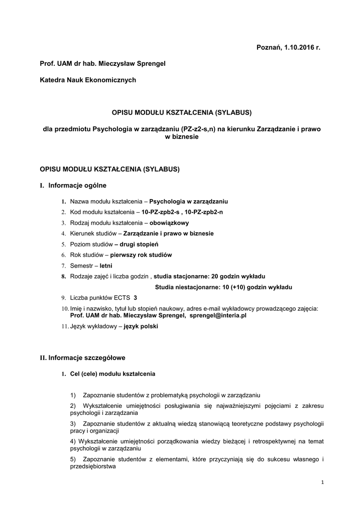 Poznań, 1.10.2016 r. Prof. UAM dr hab. Mieczysław Sprengel Katedra Nauk Ekonomicznych OPISU MODUŁU KSZTAŁCENIA (SYLABUS) dla przedmiotu Psychologia w zarządzaniu (PZ-z2-s,n) na kierunku Zarządzanie i prawo w biznesie OPISU MODUŁU KSZTAŁCENIA (SYLABUS) I. Informacje ogólne 1. Nazwa modułu kształcenia – Psychologia w zarządzaniu 2. Kod modułu kształcenia – 10-PZ-zpb2-s , 10-PZ-zpb2-n 3. Rodzaj modułu kształcenia – obowiązkowy 4. Kierunek studiów – Zarządzanie i prawo w biznesie 5. Poziom studiów – drugi stopień 6. Rok studiów – pierwszy rok studiów 7. Semestr – letni 8. Rodzaje zajęć i liczba godzin , studia stacjonarne: 20 godzin wykładu Studia niestacjonarne: 10 (+10) godzin wykładu 9. Liczba punktów ECTS 3 10. Imię i nazwisko, tytuł lub stopień naukowy, adres e-mail wykładowcy prowadzącego zajęcia: Prof. UAM dr hab. Mieczysław Sprengel, [email protected] 11. Język wykładowy – język polski II. Informacje szczegółowe 1. Cel (cele) modułu kształcenia 1) Zapoznanie studentów z problematyką psychologii w zarządzaniu 2) Wykształcenie umiejętności posługiwania się najważniejszymi pojęciami z zakresu psychologii i zarządzania 3) Zapoznanie studentów z aktualną wiedzą stanowiącą teoretyczne podstawy psychologii pracy i organizacji 4) Wykształcenie umiejętności porządkowania wiedzy bieżącej i retrospektywnej na temat psychologii w zarządzaniu 5) Zapoznanie studentów z elementami, które przyczyniają się do sukcesu własnego i przedsiębiorstwa 1 2. Wymagania wstępne w zakresie wiedzy, umiejętności oraz kompetencji społecznych (jeśli obowiązują) Znajomość podstawowych pojęć z zakresu psychologii i zarządzania 3. Efekty kształcenia w zakresie wiedzy, umiejętności oraz kompetencji społecznych dla modułu kształcenia i odniesienie do efektów kształcenia dla kierunku studiów (UWAGA: nie dzielimy efektów kształcenia dla modułów (przedmiotów) na kategorie wiedzy, umiejętności i kompetencji społecznych; każdy moduł (przedmiot) nie musi obejmować wszystkich trzech kategorii efektów kształcenia; jeśli efektem kształcenia jest np. analiza wymagająca określonej wiedzy, to nie trzeba oddzielnie definiować efektów kształcenia w kategorii wiedzy ) Symbol efektów kształcenia* Po zakończeniu modułu (przedmiotu) i potwierdzeniu osiągnięcia efektów kształcenia student potrafi: Odniesienie do efektów kształcenia dla kierunku # studiów PZ_01 Streścić zachodzące przemiany w charakterze współczesnej pracy. K_W01; K_W02, K_U01, K_K01 PZ_02 Zdefiniować podstawowe zagadnienia z zakresu teorii organizacji i zarządzania. K_W05, K_U02, K_U03, K_K01 PZ_03 Wytłumaczyć podstawowe problemy związane z pełnieniem władzy w organizacji. K_W05, K_W06, K_K04 PZ_04 Zinterpretować sposoby zarządzania pracownikami wynikającymi z koncepcji natury ludzkiej. K_W03; K_W05; K_K04; PZ_05 Określić podstawowe narzędzia polityki kadrowej przedsiębiorstw i komunikacji międzyludzkiej. K_W05, K_K06, K_K02 PZ_06 Zaradzić konfliktom w pracy K_W06, K_U08, K_K06 PZ_07 Próbować opanować stres w pracy K_W06, K_U07, K_K06 * kod modułu kształcenia, np. KHT_01 (KHT-kod modułu „Kataliza Heterogeniczna” w USOS) # efekty kształcenia dla kierunku studiów (np. K_W01, K_U01, ..) W – wiedza; U – umiejętności; K – kompetencje społeczne (wyszczególnione tylko w symbolach kierunkowych efektów kształcenia) 01, 02… – numer efektu kształcenia UWAGA! Zaleca się, aby, w zależności od modułu, liczba efektów kształcenia zawierała się w przedziale: 5-10. 2 4. Treści kształcenia Nazwa modułu kształcenia: Psychologia w zarządzaniu Symbol treści kształcenia* Opis treści kształcenia Odniesienie do efektów # kształcenia modułu TK_01 Psychologiczne zachowania ludzi w organizacji .Człowiek w organizacji i style przywództwa PZ_01 TK_02 Podstawy teorii organizacji i zarzadzania PZ_02 TK_03 Efektywne wykorzystanie potencjału pracowników i ich władzy PZ_03 TK_04 Motywacja do pracy PZ_04 TK_05 Komunikacja w organizacji PZ_05 TK_06 Konflikty w pracy PZ_06 TK_07 Zjawisko stresu w pracy zawodowej PZ_07 * np. TK_01, TK_02, … # np. KHT_01 – kod modułu kształcenia wg tabeli w pkt. II 3 5. Zalecana literatura: Dowolne dostępne na rynku wydawniczym publikacje z zakresu psychologii w zarządzaniu. Literatura podstawowa: 1) G. Bartkowiak, Psychologia zarządzania, Poznań 1997. 2) N. Chmiel, Psychologia pracy i organizacji, Gdańsk 2003. 3) Z. Ratajczak, Psychologia pracy i organizacji, Warszawa 2007. Literatura uzupełniająca: 1) H. Skłodowski (red.), Psychologia w zarządzaniu, Łódź 2004. 6. Informacja o tym, gdzie można zapoznać się z materiałami do zajęć, instrukcjami do laboratorium, itp. Biblioteka UAM w Poznaniu, Biblioteki Publiczne, Czytelnia Biblioteki Uniwersyteckiej UAM w Poznaniu 3 III. Informacje dodatkowe 1. Odniesienie efektów kształcenia i treści kształcenia do sposobów prowadzenia zajęć i metod oceniania Nazwa modułu (przedmiotu): Psychologia w zarządzaniu Sposoby prowadzenia zajęć Symbol efektu Symbol treści kształcenia umożliwiające osiągnięcie kształcenia dla realizowanych w trakcie założonych efektów # modułu * zajęć kształcenia PZ_01-07 TK_01-07 Wykład Metody oceniania stopnia osiągnięcia założonego efektu & kształcenia Zaliczenie w formie testu * np. KHT_01 – kod modułu kształcenia wg tabeli w pkt. II 3 i w pkt. II 4 # np. TK_01 – symbol treści kształcenia wg tabeli w pkt. II 4 & Proszę uwzględnić zarówno oceny formujące(F) jak i podsumowujące(P) 2. Obciążenie pracą studenta (punkty ECTS) Nazwa modułu (przedmiotu): Forma aktywności Godziny zajęć (wg planu studiów) z nauczycielem Praca własna studenta (łącznie wszystkie formy) SUMA GODZIN SUMARYCZNA LICZBA PUNKTÓW ECTS DLA MODUŁU (PRZEDMIOTU) Średnia liczba godzin na zrealizowanie aktywności * Studia stacjonarne: 20 wykładów Studia niestacj