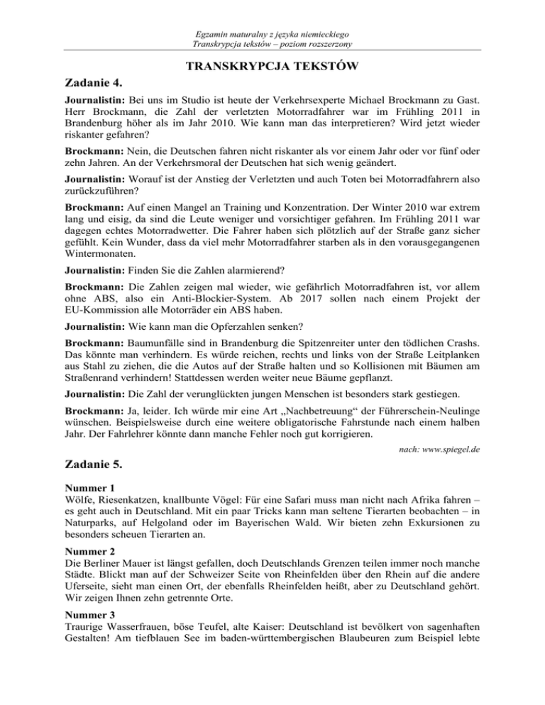 Egzamin maturalny z języka niemieckiego Transkrypcja tekstów – poziom rozszerzony TRANSKRYPCJA TEKSTÓW Zadanie 4. Journalistin: Bei uns im Studio ist heute der Verkehrsexperte Michael Brockmann zu Gast. Herr Brockmann, die Zahl der verletzten Motorradfahrer war im Frühling 2011 in Brandenburg höher als im Jahr 2010. Wie kann man das interpretieren? Wird jetzt wieder riskanter gefahren? Brockmann: Nein, die Deutschen fahren nicht riskanter als vor einem Jahr oder vor fünf oder zehn Jahren. An der Verkehrsmoral der Deutschen hat sich wenig geändert. Journalistin: Worauf ist der Anstieg der Verletzten und auch Toten bei Motorradfahrern also zurückzuführen? Brockmann: Auf einen Mangel an Training und Konzentration. Der Winter 2010 war extrem lang und eisig, da sind die Leute weniger und vorsichtiger gefahren. Im Frühling 2011 war dagegen echtes Motorradwetter. Die Fahrer haben sich plötzlich auf der Straße ganz sicher gefühlt. Kein Wunder, dass da viel mehr Motorradfahrer starben als in den vorausgegangenen Wintermonaten. Journalistin: Finden Sie die Zahlen alarmierend? Brockmann: Die Zahlen zeigen mal wieder, wie gefährlich Motorradfahren ist, vor allem ohne ABS, also ein Anti-Blockier-System. Ab 2017 sollen nach einem Projekt der EU-Kommission alle Motorräder ein ABS haben. Journalistin: Wie kann man die Opferzahlen senken? Brockmann: Baumunfälle sind in Brandenburg die Spitzenreiter unter den tödlichen Crashs. Das könnte man verhindern. Es würde reichen, rechts und links von der Straße Leitplanken aus Stahl zu ziehen, die die Autos auf der Straße halten und so Kollisionen mit Bäumen am Straßenrand verhindern! Stattdessen werden weiter neue Bäume gepflanzt. Journalistin: Die Zahl der verunglückten jungen Menschen ist besonders stark gestiegen. Brockmann: Ja, leider. Ich würde mir eine Art „Nachbetreuung“ der Führerschein-Neulinge wünschen. Beispielsweise durch eine weitere obligatorische Fahrstunde nach einem halben Jahr. Der Fahrlehrer könnte dann manche Fehler noch gut korrigieren. nach: www.spiegel.de Zadanie 5. Nummer 1 Wölfe, Riesenkatzen, knallbunte Vögel: Für eine Safari muss man nicht nach Afrika fahren – es geht auch in Deutschland. Mit ein paar Tricks kann man seltene Tierarten beobachten – in Naturparks, auf Helgoland oder im Bayerischen Wald. Wir bieten zehn Exkursionen zu besonders scheuen Tierarten an. Nummer 2 Die Berliner Mauer ist längst gefallen, doch Deutschlands Grenzen teilen immer noch manche Städte. Blickt man auf der Schweizer Seite von Rheinfelden über den Rhein auf die andere Uferseite, sieht man einen Ort, der ebenfalls Rheinfelden heißt, aber zu Deutschland gehört. Wir zeigen Ihnen zehn getrennte Orte. Nummer 3 Traurige Wasserfrauen, böse Teufel, alte Kaiser: Deutschland ist bevölkert von sagenhaften Gestalten! Am tiefblauen See im baden-württembergischen Blaubeuren zum Beispiel lebte Egzamin maturalny z języka niemieckiego Transkrypcja tekstów – poziom rozszerzony einmal, einer Sage nach, eine junge Nixe. Wir führen Sie zu zehn Ausflugszielen, über die viel Mystisches erzählt wird. Nummer 4 Goethes Graffito an einer Berghütte, Becketts liebster Spaziergang – auf den Spuren von Thomas Mann und mehr als einem Dutzend weiterer Autoren – wir führen Sie auf ungewöhnliche Weise durch unser Land. Bei uns erfahren passionierte Leser ungewöhnliche Details aus Leben und Werk von Schriftstellern. Nummer 5 Das Indoor-Tauchzentrum Oktopus in Europas größtem Tauchturm feiert am Donnerstag Eröffnung. Es ist der in Beton gegossene Versuch, die Karibik ins Rheinland zu holen. Doch nicht nur künstliche Welten locken in Deutschland unter Wasser. Wir stellen Ihnen zehn Gewässer vor, die einen Besuch lohnen. nach: www.spiegel.de Zadanie 6. AMELIE AUF SRI LANKA Ich sollte für fünf Monate mit meinen Eltern nach Sri Lanka fliegen, weil mein Vater dort einen Auftrag als Fotograf hatte. Da die Sommerferien nur 6 Wochen dauern, musste meine Schulleiterin zustimmen. Ich bekam die Erlaubnis! Aber ich musste den Stoff, den meine Klassenkameraden in der Schule durchnahmen, mit meiner Mutter auf Sri Lanka lernen. Der Unterricht war dort natürlich anders als in Berlin. Der größte Unterschied: Mama und ich haben auf dem Balkon gelernt, manchmal auch an der Poolbar. Und ich war allein; dadurch war der Unterricht intensiver und ich lernte schneller. Darum musste ich auch nicht jeden Tag sieben Stunden lernen, sondern oft nur zwei. Meistens setzten wir uns mittags zusammen hin, wenn meine kleine Schwester Smilla schlief. Sobald sie aufwachte, war der Unterricht vorüber. Mit meiner Mutter habe ich Deutsch, Französisch, Mathe, Geschichte und Erdkunde gemacht. Außerdem musste ich in den fünf Monaten drei Aufsätze schreiben. Die Themen durfte ich frei wählen. Ein Aufsatz handelte von dem Tsunami, der ein paar Jahre zuvor über Sri Lanka hereingebrochen war. Dafür habe ich einen Hotelbesitzer interviewt, der während des Tsunamis auf das Dach des Hotels floh und von dort gerettet wurde. Der zweite Aufsatz drehte sich um eine Schildkrötenfarm, die ich mit meinen Eltern besucht hatte. Der dritte Aufsatz behandelte die Produktion des berühmten Ceylontees – Sri Lanka hieß ja früher Ceylon. Während wir auf Sri Lanka waren, habe ich meinen Klassenkameraden oft Fotos geschickt. Natürlich habe ich meine Freunde sehr vermisst. Ich konnte meinen Geburtstag nicht mit ihnen in Deutschland feiern, das war wirklich sehr schade. Wir haben nämlich eine Tradition: An unseren Geburtstagen gehen wir immer zusammen indisch essen. Diesmal haben sie meinen Geburtstag ohne mich gefeiert, aber einen Stuhl für mich freigehalten. So, als ob ich persönlich dabei wäre. Außerdem hat mir mein guter Freund Pit per E-Mail Fotos von dem Geburtstag geschickt. Er hat mir sogar ein Foto vom ersten Schnee in Deutschland geschickt. Auf Sri Lanka gibt es ja keinen. Sonst war Sri Lanka toll. Ich konnte jeden Tag an den Strand gehen und im Meer bade