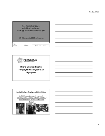 07.10.2015 Spotkanie branżowe spółdzielni socjalnych działających w zakresie turystyki Tytuł 25-‐26 września 2015 r., Byczyna Biuro Obsługi Ruchu Turystyki Historycznej w Byczynie Spółdzielnia Socjalna PERUNICA Spółdzielnia socjalna osób prawnych Stowarzyszenie Animacji Lokalnej ARKONA + Ochotnicza Straż Pożarna w Byczynie. Zarząd 1 07.10.2015 Struktura Spółdzielni Punkt Przedszkolny MYSIA WIEŻA Sala zabaw BORTH • Ul. Dworcowa 7 • Plac Wolności • Ul. Dworcowa 7 BORTH Struktura BORTH Koordynator BORTH Sprzedawca Aneta Musiałek Kierownik sprzedaży/ opiekun osoby niepełnosprawnej Ania Białek-‐Cebula Przewodnik/ sprzedawca ofert Barbara Brzezińska Przewodnik/ animator Izabela Polus 2 07.10.2015 Nasze cele 1. Kompleksowa obsługa turystyczna w Gminie Byczyna 2. Sieć współpracy 3. Sprowadzenie takiej ilości turystów do Byczyny, aby stała się ona rozpoznawalna w Polsce jako miejsce atrakcyjne turystycznie 4. Utrzymanie stałej – 6 osobowej ekipy 5. Wypracowanie modelu, który pójdzie „w Polskę” Nasze działania • Trasa turystyczna – możliwa do przejścia samemu, lub w kilku wariantach: z przewodnikiem tradycyjnym, animatorem, z kartą zadań, dla grup zorganizowanych i dla osób indywidualnych. Możliwa będzie też do przejścia w strojach średniowiecznych i w formie gry terenowej (usługa użyteczności publicznej) • Warsztaty rzemieślnicze – dla grup zorganizowanych lub osób indywidualnych, po uprzednim zamówieniu usługi (usługa up) • Zielone szkoły o specjalności „historia” dla różnych grup wiekowych (usługa up) • Żywe lekcje historii – wycieczki jednodniowe dla szkół i przedszkoli (usługa up) • Wycieczki integracyjno-‐terapeutyczne dla uczestników WTZ (usługa up) • Kolonie socjoterapeutyczne – dla wychowanków ośrodków szkolno-‐ wychowawczych, domów dziecka, ośrodków poprawczych – w klimacie wczesno i późnośredniowiecznym (usługa up) • Półkolonie, we współpracy z placówkami szkolnymi i ośrodkiem kultury (usługa up) • Wizyty studyjne ukierunkowane na promocję Biura Obsługi Ruchu Turystyki Historycznej oraz innych podmiotów ekonomii społecznej (usługi up) • Staże oraz praktyki zawodowe dla studentów przedmiotów historycznych, dziedzictwa kulturowego, turystyki historycznej (usługa up) • Team building w realiach historycznych dla grup korporacyjnych i spółdzielczych (działalność gospodarcza) • Organizacja imprez plenerowych, w tym lipcowej PERUNICY – czyli słowiańskiego święta ognia (usługa up) • Sprzedaż pamiątek, odzieży stylizowanej oraz autorskiej kolekcji ubrań współczesnych z wizerunkami bóstw wczesnośredniowiecznych (działalność gospodarcza) • Koncerty i warsztaty muzyczne (usługa up) 3 07.10.2015 Zadania 1. 2. 3. 4. 5. 6. 7. 8. 9. Bazy danych -‐ podmioty współpracujące Współpraca na trasie turystycznej Opracowanie ofert Przygotowanie do sprzedaży -‐ szkolenie, wdrożenie Ustalenie cen usług, dostosowanie do przepisów prawa Promocja działań Spółdzielni Sprzedaż Włączenie się aktywnie w działania Spółdzielni Utrzymywanie współpracy z Partnerami Spółdzielni – Gminą Byczyna, Uniwersytetem Opolskim, Regionalnym Ośrodkiem Polityki Społecznej w Opolu Współpraca z Gminą Byczyna oraz Uniwersytetem Opolskim • teledysk promocyjny • zadanie z zakresu turystyki i krajoznawstwa folder kwerenda • stała współpraca przy organizacji wydarzeń z zakresu kultury, turystyki, promocji itp. Perunicowy Kram 4 07.10.2015 Dzięki i zapraszamy do Byczyny na dłużej !!! www.perunica.pl Facebook: Spółdzielnia Socjalna PERUNICA 5