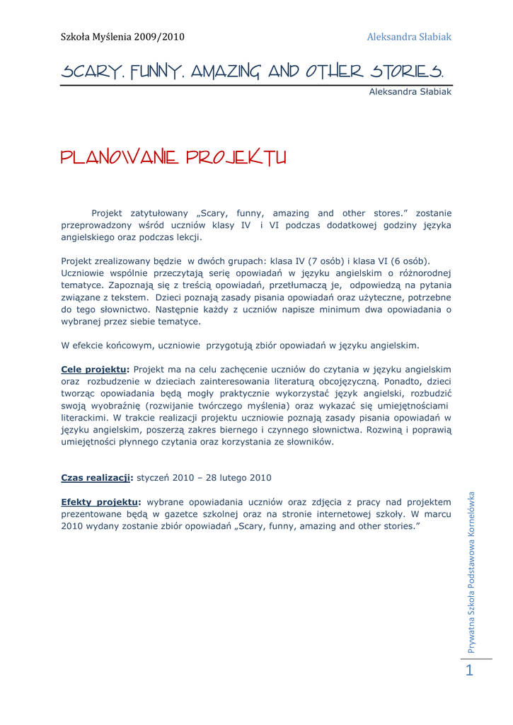 Szkoła Myślenia 2009/2010 Aleksandra Słabiak Scary, funny, amazing and other stories. Aleksandra Słabiak Planowanie projektu Projekt zatytułowany „Scary, funny, amazing and other stores.” zostanie przeprowadzony wśród uczniów klasy IV i VI podczas dodatkowej godziny języka angielskiego oraz podczas lekcji. Projekt zrealizowany będzie w dwóch grupach: klasa IV (7 osób) i klasa VI (6 osób). Uczniowie wspólnie przeczytają serię opowiadań w języku angielskim o różnorodnej tematyce. Zapoznają się z treścią opowiadań, przetłumaczą je, odpowiedzą na pytania związane z tekstem. Dzieci poznają zasady pisania opowiadań oraz użyteczne, potrzebne do tego słownictwo. Następnie każdy z uczniów napisze minimum dwa opowiadania o wybranej przez siebie tematyce. W efekcie końcowym, uczniowie przygotują zbiór opowiadań w języku angielskim. Cele projektu: Projekt ma na celu zachęcenie uczniów do czytania w języku angielskim oraz rozbudzenie w dzieciach zainteresowania literaturą obcojęzyczną. Ponadto, dzieci tworząc opowiadania będą mogły praktycznie wykorzystać język angielski, rozbudzić swoją wyobraźnię (rozwijanie twórczego myślenia) oraz wykazać się umiejętnościami literackimi. W trakcie realizacji projektu uczniowie poznają zasady pisania opowiadań w języku angielskim, poszerzą zakres biernego i czynnego słownictwa. Rozwiną i poprawią umiejętności płynnego czytania oraz korzystania ze słowników. Efekty projektu: wybrane opowiadania uczniów oraz zdjęcia z pracy nad projektem prezentowane będą w gazetce szkolnej oraz na stronie internetowej szkoły. W marcu 2010 wydany zostanie zbiór opowiadań „Scary, funny, amazing and other stories.” Prywatna Szkoła Podstawowa Kornelówka Czas realizacji: styczeń 2010 – 28 lutego 2010 1 Szkoła Myślenia 2009/2010 Aleksandra Słabiak Realizacja projektu Czas realizacji: styczeń 2010 – 28 lutego 2010 Projekt zrealizowany został podczas dziesieciu spotkań w grupach (klasach) oraz kilku (w zależności od indywidualnych potrzeb uczniów) spotkań indywidualnych, konsultacji. Spotkanie 1 miało na celu zapoznanie uczniów z tematyką i zasadami realizacji projektu. Opowiedziałam dlaczego bierzemy udział w tego rodzaju projekcie, jakie są jego cele. Wyjaśniłam uczniom co osiągną poprzez realizację projektu, jakie nowe umiejętności zdobędą, a jakie udoskonalą. Ustaliliśmy częstotliwość, terminy lekcji poświęconych realizacji projektu oraz terminy konsultacji. Uczniowie otrzymali swobodę w kwestii wyboru tematów swoich opowiadań, co bardzo zmotywowało ich do pracy i wywołało duży entuzjazm. Spotkanie 2 poświęcone było zasadom pisania planów opowiadań oraz samych opowiadań. Podczas lekcji omówiliśmy cechy jakie powinno posiadać dobre opowiadanie. Przypomnieliśmy czasy (Present Simple, Present Continuous, Past Simple i Past Continuous) przy pomocy których uczniowie będą pisać swoje opowiadania. Przedstawiłam uczniom trzy podstawowe części opowiadania (wstęp, rozwinięcie, zakończenie), oraz wyjaśniłam co powinna zawierać każda z nich. Zwróciłam również uwagę aby pisząc swoje opowiadania starali się opisywać wydarzenia we właściwej kolejności, aby utrzymywali chronologiczny ciąg wydarzeń. Zebraliśmy i wypisaliśmy zwroty od których można zacząć opowiadanie (np. one time, two years ago, it started with, one day, a long time ago), zwroty, których można używać w trakcie opowiadania (np. suddenly, then, after that) oraz zwroty, które mogą pojawić się na końcu (np. in the end, finally). Przypomniałam również uczniom jak korzystać ze słowników oraz zachecałam dzieci do używania ich podczas pisania opowiadań. Spotkanie 4. Uczniowie wysłuchali czytanego przeze mnie opowiadania (klasa IV - „The storm" by Roderick Hunt, klasa VI – „Village in the snow" by Roderick Hunt), następnie każdy z nich otrzymał pocięty na kawałki tekst. Zadaniem dzieci było poskładanie tekstu w całość na podstawie tego, co zapamiętały. Po kilku minutach ponownie przeczytałam opowiadanie, a dzieci, w trakcie mojego czytania, sprawdzały zgodność ich wersji z oryginałem. Poprawnie ułożone opowiadania zostały naklejone na duże kartony i zilustrowane. W trakcie 5 spotkania uczniowie wspólnie czytali krótkie, przygotowane przeze mnie opowiadania, w których brakowało zakończenia. Każdy uczeń miał szansę wymyśleć swoje zakończenie. Wszystkie wersje zostały zapisane na kartonach, a następnie, poprzez glosowanie, wybraliśmy jedno, które podobało się najbardziej. Prywatna Szkoła Podstawowa Kornelówka Podczas 3 spotkania uczniowie otrzymali kopie opowiadań :klasa IV – „Rainbow Renny the veggy-eating shark", klasa VI – „Mountain Story” by Sue. Wspólnie czytaliśmy teksty, wyjaśnialiśmy niejasności, tłumaczyliśmy nieznane słowa, a następnie uczniowie odpowiadali na pytania związane z tekstem. Wyszukiwali w tekście konkretne informacje. 2 Szkoła Myślenia 2009/2010 Aleksandra Słabiak Spotkanie 6. W pracowni poprzyklejałam pocięty na części tekst opowiadania, którego dzieci wcześniej nie czytały. Zadaniem uczniów było przeczytanie wszystkich fragmentów i zdecydowanie, w jakiej kolejności należy ułożyć części, aby stworzyły spójną całość. Swoje odpowiedzi dzieci zapisywały na kartkach. Następnie każdy otrzymał kopię oryginalnego tekstu i samodzielnie sprawdzał poprawność swoich odpowiedzi. Na zakończenie wspólnie przeczytaliśmy opowiadanie i uczniowie odpowiedzieli na pytania związane z tekstem. Spotkanie 7. “Sam's secret zoo" by Sue Clark. Przed zapoznaniem się z treścią opowiadania, uczniowie poznali nowe słownictwo w dwojaki sposób: a) Każdy dziecko otrzymało obrazki zwierząt występujących w opowiadaniu, karteczki z nazwami tych zwierząt oraz kartki z opisami zwierząt. Zadanie polegało na dopasowaniu obrazka, nazwy i definicji. P