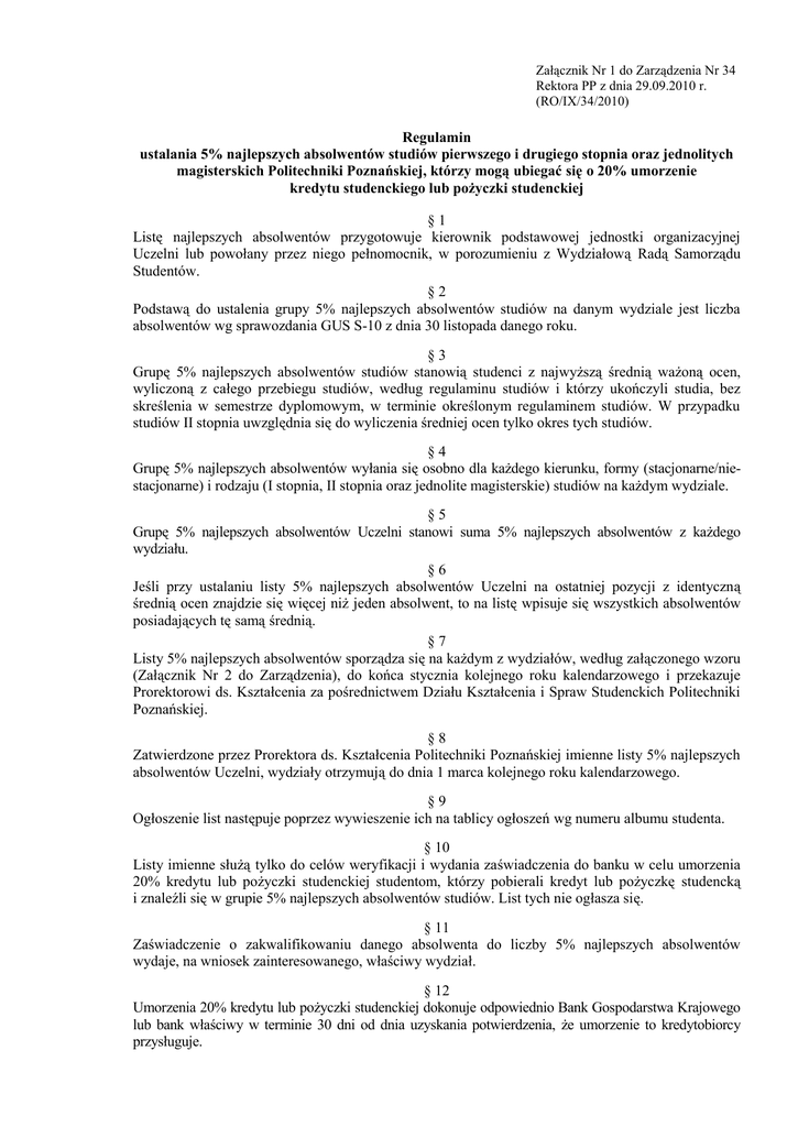 Załącznik Nr 1 do Zarządzenia Nr 34 Rektora PP z dnia 29.09.2010 r. (RO/IX/34/2010) Regulamin ustalania 5% najlepszych absolwentów studiów pierwszego i drugiego stopnia oraz jednolitych magisterskich Politechniki Poznańskiej, którzy mogą ubiegać się o 20% umorzenie kredytu studenckiego lub pożyczki studenckiej §1 Listę najlepszych absolwentów przygotowuje kierownik podstawowej jednostki organizacyjnej Uczelni lub powołany przez niego pełnomocnik, w porozumieniu z Wydziałową Radą Samorządu Studentów. §2 Podstawą do ustalenia grupy 5% najlepszych absolwentów studiów na danym wydziale jest liczba absolwentów wg sprawozdania GUS S-10 z dnia 30 listopada danego roku. §3 Grupę 5% najlepszych absolwentów studiów stanowią studenci z najwyższą średnią ważoną ocen, wyliczoną z całego przebiegu studiów, według regulaminu studiów i którzy ukończyli studia, bez skreślenia w semestrze dyplomowym, w terminie określonym regulaminem studiów. W przypadku studiów II stopnia uwzględnia się do wyliczenia średniej ocen tylko okres tych studiów. §4 Grupę 5% najlepszych absolwentów wyłania się osobno dla każdego kierunku, formy (stacjonarne/niestacjonarne) i rodzaju (I stopnia, II stopnia oraz jednolite magisterskie) studiów na każdym wydziale. §5 Grupę 5% najlepszych absolwentów Uczelni stanowi suma 5% najlepszych absolwentów z każdego wydziału. §6 Jeśli przy ustalaniu listy 5% najlepszych absolwentów Uczelni na ostatniej pozycji z identyczną średnią ocen znajdzie się więcej niż jeden absolwent, to na listę wpisuje się wszystkich absolwentów posiadających tę samą średnią. §7 Listy 5% najlepszych absolwentów sporządza się na każdym z wydziałów, według załączonego wzoru (Załącznik Nr 2 do Zarządzenia), do końca stycznia kolejnego roku kalendarzowego i przekazuje Prorektorowi ds. Kształcenia za pośrednictwem Działu Kształcenia i Spraw Studenckich Politechniki Poznańskiej. §8 Zatwierdzone przez Prorektora ds. Kształcenia Politechniki Poznańskiej imienne listy 5% najlepszych absolwentów Uczelni, wydziały otrzymują do dnia 1 marca kolejnego roku kalendarzowego. §9 Ogłoszenie list następuje poprzez wywieszenie ich na tablicy ogłoszeń wg numeru albumu studenta. § 10 Listy imienne służą tylko do celów weryfikacji i wydania zaświadczenia do banku w celu umorzenia 20% kredytu lub pożyczki studenckiej studentom, którzy pobierali kredyt lub pożyczkę studencką i znaleźli się w grupie 5% najlepszych absolwentów studiów. List tych nie ogłasza się. § 11 Zaświadczenie o zakwalifikowaniu danego absolwenta do liczby 5% najlepszych absolwentów wydaje, na wniosek zainteresowanego, właściwy wydział. § 12 Umorzenia 20% kredytu lub pożyczki studenckiej dokonuje odpowiednio Bank Gospodarstwa Krajowego lub bank właściwy w terminie 30 dni od dnia uzyskania potwierdzenia, że umorzenie to kredytobiorcy przysługuje.