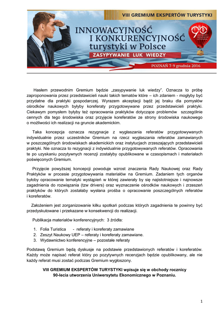 Hasłem przewodnim Gremium będzie „zasypywanie luk wiedzy”. Oznacza to próbę zaproponowania przez przedstawicieli nauki takich tematów które – ich zdaniem - mogłyby być przydatne dla praktyki gospodarczej. Wyrazem akceptacji bądź jej braku dla pomysłów ośrodków naukowych byłyby koreferaty przygotowywane przez przedstawicieli praktyki. Ciekawym pomysłem byłyby też opracowania praktyków dotyczące problemów szczególnie cennych dla tego środowiska oraz przyjęcie koreferatów ze strony środowiska naukowego o możliwości ich realizacji na gruncie akademickim. Taka koncepcja oznacza rezygnacje z wygłaszania referatów przygotowywanych indywidualnie przez uczestników Gremium na rzecz wygłaszania referatów zamawianych w poszczególnych środowiskach akademickich oraz instytucjach zrzeszających przedstawicieli praktyki. Nie oznacza to rezygnacji z indywidualnie przygotowywanych referatów. Opracowania te po uzyskaniu pozytywnych recenzji zostałyby opublikowane w czasopismach i materiałach poświęconych Gremium. Przyjęcie powyższej koncepcji powoduje wzrost znaczenia Rady Naukowej oraz Rady Praktyków w procesie przygotowywania materiałów na Gremium. Zadaniem tych organów byłoby opracowanie tematyki wystąpień w której zawierały by się najistotniejsze i najnowsze zagadnienia do rozwiązania (tzw drivers) oraz wyznaczenie ośrodków naukowych i zrzeszeń praktyków do których zostałaby wysłana prośba o opracowanie poszczególnych referatów i koreferatów. Założeniem jest zorganizowanie kilku spotkań podczas których zagadnienia te powinny być przedyskutowane i przekazane w konsekwencji do realizacji. Publikacja materiałów konferencyjnych: 3 źródła: 1. Folia Turistica - referaty i koreferaty zamawiane 2. Zeszyt Naukowy UEP – referaty i koreferaty zamawiane. 3. Wydawnictwo konferencyjne – pozostałe referaty Podstawą Gremium będą dyskusje na podstawie przedstawionych referatów i koreferatów. Każdy może napisać referat który po pozytywnych recenzjach będzie opublikowany, ale nie każdy referat musi zostać podczas Gremium wygłoszony. VIII GREMIUM EKSPERTÓW TURYSTYKI wpisuje się w obchody rocznicy 90-lecia utworzenia Uniwersytetu Ekonomicznego w Poznaniu. 1 Propozycje tematów wiodących I. Nowe modele biznesowe i podmioty na rynku turystycznym. kreowanie startupów i rewitalizacja istniejących firm w działalności turystycznej (inkubatory przedsiębiorczości, parki naukowe, kampusy startupowe, lean – startup), „turystyka współdzielenia” – wpływ „ekonomii” współdzielenia na kondycje gospodarki turystycznej (Airbnb, BlablaCar, Uber, wolne przewodnictwo, portale oferujące usługi gastronomiczne itp.), e-commerce w turystyce i jej wpływ na tradycyjną gospodarkę turystyczną (działalność OTAs, portali rezerwacyjnych itp.), turystyka w gospodarce kreatywnej (np. design w hotelarstwie, design usług turystycznych, responsible web design w hotelarstwie, aplikacje zarządzające ruchem turystycznym), sieciowe relacje biznesowe w turystyce, nowe formy komunikacji z klientem na rynku turystycznym – społeczności sieciowe (portale społecznościowe, blogi i blogerzy) - współudział konsumentów w tworzeniu produktów. II. Transfer wiedzy w turystyce transfer wiedzy (formy współpracy) między gospodarką turystyczną a innymi branżami, dzielenie się wiedzą w turystyce – podejście sieciowe, generacja X i Y jako pracownicy i pracodawcy turystyczni, uczelnie wyższe jako podmioty transferu wiedzy w gospodarce turystycznej – jaka jest droga dla uniwersyteckiego kształcenia w turystyce, nowe formy kształcenia w obszarze turystyki, finansowanie i realizacja projektów B+R w sektorze turystyki. III. Zarządzanie przestrzenią turystyczną miary rozwoju przestrzeni turystycznej, nowe koncepcje zarządzania regionami turystycznymi (innowacyjność w działaniach DMO), podejście sieciowe w rozwoju obszarów turystycznych, wykorzystywanie nowych technologii i informacji do opisu przestrzeni turystycznej, rewitalizacja terenów poprzemysłowych i turystycznych. IV. Ku nowej polityce turystycznej dyskusje nad potrzebą nowych regulacji w turystyce (czy wprowadzić nową Ustawę o usługach turystycznych?), planowanie rozwoju turystyki (regulacja czy deregulacja działalności turystycznej), wielopoziomowe formy zarządzania w turystyce, idea „governance” w turystyce (w tym ROTy i LOTy), ruchy obywatelskie i ich wpływ na rozwój turystyki. 2 Temat główny VIII GREMIUM EKSPERTÓW TURYSTYKI: INNOWACYJNOŚĆ I KONKURENCYJNOŚĆ TURYSTYKI W POLSCE Hasło przewodnie: ZASYPYWANIE LUK WIEDZY Organizatorzy: Forum Turystyki Regionów Uniwersytet Ekonomiczny w Poznaniu Współpraca: Ministerstwo Sportu i Turystyki Polska Organizacja Turystyczna organizacje branżowe (w trakcie uzgodnień) Gospodarze: Urząd Marszałkowski Województwa Wielkopolskiego Wielkopolska Organizacja Turystyczna Urząd Miasta Poznania Poznańska Lokalna Organizacja Turystyczna Rada Naukowa: 1. prof. dr hab. Gołembski Grzegorz – UE Poznań – Przewodniczący Rady 2. prof. dr hab. Bosiacki Stefan – AWF Poznań 3. prof. dr hab. Dziedzic Ewa – SGH Warszawa 4. prof. dr hab. Kachniewska Magdalena - SGH Warszawa 5. prof. dr hab. Kaczmarek Jacek – UŁ Łódź 6. prof. dr hab. Kurek Włodzimierz – UJ Kraków 7. prof. dr hab. Marciszewska Barbara – AM Gdynia 8. prof. dr hab. Niezgoda Agnieszka - UE Poznań 9. prof. dr hab. Panasiuk Aleksander – US Szczecin 10. prof. dr hab. Skalska Teresa – SGHiT Warszawa (obecnie Vistula) Komitet Naukowo-Branżowy: (w trakcie uzgodnień) 3
