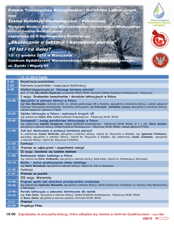 Polskie Towarzystwo Konsultantów i Doradców Laktacyjnych oraz Zakład Dydaktyki Ginekologiczno – Położniczej Wydziału Nauki o Zdrowiu Warszawskiego Uniwersytetu Medycznego Partner: Centrum Nauki o Laktacji zapraszają na II Ogólnopolską Konferencję „Skutecznie o laktacji i karmieniu piersią” 10 lat i co dalej? 12- 13 grudnia 2014 w Warszawie Centrum Dydaktyczne Warszawskiego Uniwersytetu Medycznego, ul. Żwirki i Wigury 81 12.12.2014 Piątek 8:30 Rejestracja uczestników 9:30 9:40 Powitanie uczestników i rozpoczęcie Konferencji Wykład inauguracyjny pt. Dlaczego karmimy piersią? 10:00 I sesja: Środowisko konsultantów i doradców laktacyjnych w Polsce Specjaliści w zakresie laktacji w Polsce 10:20 Opieka laktacyjna w Polsce i wybranych krajach UE 10:40 Dostępność i zasięg poradnictwa laktacyjnego w Polsce 11:00 Jak być skutecznym w promocji karmienia piersią? 11:20 Dyskusja 11: 30 Przerwa na odpoczynek i uzupełnienie energii prof. dr hab. Ewa Dmoch-Gajzlerska, prodziekan WNoZ WUM, kierownik Zakładu Dydaktyki Ginekologiczno - Położniczej mgr Ewa Masełkowska, historyk sztuki, lic. zdrowia publicznego UM w Poznaniu, specjalista w dziedzinie laktacji, członek założyciel Polskiego Towarzystwa Konsultantów i Doradców Laktacyjnych, mgr Katarzyna Asztabska, pedagog, specjalista w dziedzinie laktacji, członek założyciel i sekretarz PTKiDL mgr położnictwa Sylwia Wilk, Zakład Dydaktyki Ginekologiczno - Położniczej WUM, WNoZ mgr położnictwa Angelika Niczyporuk, Zakład Dydaktyki Ginekologiczno - Położniczej WUM, WNoZ, dr n. o zdr., Beata Sztyber, specjalista w zakresie laktacji, Zakład Dydaktyki Ginekologiczno - Położniczej WUM, WNoZ, członek założyciel PTKiDL lic. położnictwa Joanna Winiarska, specjalista w zakresie laktacji, Szpital św. Wojciecha w Gdańsku, mgr Agnieszka Pietkiewicz, psycholog, specjalista w zakresie laktacji, Szpital św. Wojciecha w Gdańsku, mgr położnictwa Joanna Żołnowska, specjalista w zakresie laktacji, Szpital św. Wojciecha w Gdańsku II sesja: Dzielenie się ludzkim mlekiem 11:50 Bankowanie mleka ludzkiego w Polsce 12:10 Matka – matce przekazywanie mleka ludzkiego 12:30 Dyskusja 12:40 Przerwa na posiłek mgr położnictwa Zofia Słodkowska, specjalista w zakresie laktacji, Bank mleka, Szpital im. Orłowskiego w Warszawie mgr Beata Mariańczyk, specjalista w zakresie laktacji, Szpital św. Zofii w Warszawie III sesja: Warsztaty 13:4015:40 Program opieki nad dzieckiem przedwcześnie urodzonym 13:4015:40 Porada laktacyjna a zalecenia dietetyczne dla matek 15:40 Przerwa 16:00 Projekcja Filmu mgr położnictwa Agnieszka Muszyńska, specjalista w zakresie laktacji, Klinika Położnictwa i Ginekologii im. Księżnej Anny Mazowieckiej w Warszawie mgr Anna Durka, specjalista w zakresie laktacji, Zakład Dydaktyki Ginekologiczno - Położniczej WUM, WNoZ dr Beata Sińska, specjalista w zakresie żywienia, Dietetyka WUM, WNoZ 18:00 Zapraszamy na uroczystą kolację, która odbędzie się również w Centrum Dydaktycznym – koszt 50zł VERTE 13.12.2014 Sobota I sesja: Skuteczna w opieka laktacyjna w oparciu o aktualną i wielodyscyplinarną wiedzę 9:00 Co się zmieniło w praktyce konsultanta laktacyjnego? 9:40 Protokół oceny ssania 10:00 Jak prowadzić pacjentkę z ropniem piersi? Z doświadczeń poradni laktacyjnej św. Zofii w Warszawie 10:20 Czy kryzys związany z narodzinami dziecka to problem w laktacji? 10:40 Zespół terapeutyczny w opiece laktacyjnej 11:00 Odpoczynek i uzupełnienie energii 11:40 Raport o stanie karmienia piersią w Polsce 12:00 Skutecznie o karmieniu piersią i laktacji. Czy specjalista w dziedzinie laktacji jest potrzebny? Okrągły stół 13:00 Dyskusja 13:20 13:40 Rozstrzygnięcie konkursu wiedzy o laktacji i sesji plakatowej Zakończenie konferencji dr Katarzyna Pakuła, pediatra, specjalista w zakresie laktacji, poradnia laktacyjna szpitala św. Zofii w Warszawie, członek założyciel PTKiDL, mgr Kinga Osuch, położna, specjalista w zakresie laktacji, członek założyciel PTKiDL, szpital św. Zofii w Warszawie dr n. med Magdalena Nehring-Gugulska, specjalista w zakresie laktacji, członek założyciel PTKiDL, Dyrektor Centrum Nauki o Laktacji dr Monika Żukowska – Rubik, pediatra, specjalista w zakresie laktacji, członek założyciel PTKiDL, poradnia laktacyjna szpitala św. Zofii w Warszawie mgr położnictwa Joanna Strzerzyńska, Zakład Dydaktyki Ginekologiczno - Położniczej WUM, WNoZ;, mgr Tomasz Duda, psycholog, Zakład Dydaktyki Ginekologiczno - Położniczej WUM, WNoZ;, dr n. o zdr Beata Sztyber Zakład Dydaktyki Ginekologiczno - Położniczej WUM, WNoZ prof. dr hab. Katarzyna Borszewska – Kornacka, WUM, Klinika Neonatologii im. Księżnej Anny Mazowieckiej w Warszawie dr n. med. Magdalena Nehring-Gugulska, dr n. o zdr Beata Sztyber Program może ulec modyfikacji Zapraszamy osoby zainteresowane na Wycieczkę do Pałacu Kultury i Nauki! Wycieczka w dniu 13.12.2014 o 14.30, trwa ok. 1,5 godziny, koszt: 30 zł Zgłoszenia i opłata konferencyjna: Zgłoszenia Uczestników do dnia 30 listopada 2014 r. na str. www.laktacja.org.pl w ogłoszeniu o konferencji jest KARTA ZGŁOSZENIA lub mailem na adres: [email protected] Proszę podać nazwisko/a uczestnika/ów, dane do faktury (jeżeli jest potrzebna), chęć udziału w kolacji i zgłoszenie udziału w wycieczce. Opłata konferencyjna obejmuje udział w wykładach, materiały konferencyjne, przerwy kawowe i lunch. Dla członków PTKiDL (mających opłacone składki) wynosi 150 PLN, dla pozostałych osób 200 PLN. Wpłaty przyjmujemy do 5 grudnia 2014 r., na konto BGŻ 27 2030 0045 1110 0000 0261 0180 z dopiskiem – „Konferencja” oraz podaniem nazwiska uczestnika lub uczestników. Prosimy o przysyłanie prac do monografii konferencji i zgłaszanie plakatów związanych z laktacją i karmieniem piersią do dnia 10 listopada 2014 r. na adres: [email protected]