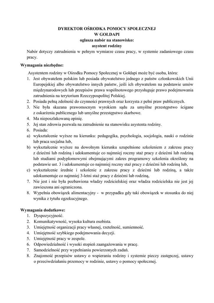 DYREKTOR OŚRODKA POMOCY SPOŁECZNEJ W GOŁDAPI ogłasza nabór na stanowisko: asystent rodziny Nabór dotyczy zatrudnienia w pełnym wymiarze czasu pracy, w systemie zadaniowego czasu pracy. Wymagania niezbędne: Asystentem rodziny w Ośrodku Pomocy Społecznej w Gołdapi może być osoba, która: 1. Jest obywatelem polskim lub posiada obywatelstwo jednego z państw członkowskich Unii Europejskiej albo obywatelstwo innych państw, jeśli ich obywatelom na podstawie umów międzynarodowych lub przepisów prawa wspólnotowego przysługuje prawo podejmowania zatrudnienia na terytorium Rzeczypospolitej Polskiej. 2. Posiada pełną zdolność do czynności prawnych oraz korzysta z pełni praw publicznych. 3. Nie była skazana prawomocnym wyrokiem sądu za umyślne przestępstwo ścigane z oskarżenia publicznego lub umyślne przestępstwo skarbowe. 4. Ma nieposzlakowaną opinię. 5. Jej stan zdrowia pozwala na zatrudnienie na stanowisku asystenta rodziny. 6. Posiada: a) wykształcenie wyższe na kierunku: pedagogika, psychologia, socjologia, nauki o rodzinie lub praca socjalna lub, b) wykształcenie wyższe na dowolnym kierunku uzupełnione szkoleniem z zakresu pracy z dziećmi lub rodziną i udokumentuje co najmniej roczny staż pracy z dziećmi lub rodziną lub studiami podyplomowymi obejmującymi zakres programowy szkolenia określony na podstawie ust. 3 i udokumentuje co najmniej roczny staż pracy z dziećmi lub rodziną lub, c) wykształcenie średnie i szkolenie z zakresu pracy z dziećmi lub rodziną, a także udokumentuje co najmniej 3-letni staż pracy z dziećmi lub rodziną, 7. Nie jest i nie była pozbawiona władzy rodzicielskiej oraz władza rodzicielska nie jest jej zawieszona ani ograniczona. 8. Wypełnia obowiązek alimentacyjny - w przypadku gdy taki obowiązek w stosunku do niej wynika z tytułu egzekucyjnego. Wymagania dodatkowe: 1. Dyspozycyjność. 2. Komunikatywność, wysoka kultura osobista. 3. Umiejętność organizacji pracy własnej, rzetelność, sumienność. 4. Umiejętność szybkiego podejmowania decyzji. 5. Umiejętność pracy w zespole. 6. Odpowiedzialność i wysoki stopień zaangażowania w pracę. 7. Samodzielność przy wypełnianiu powierzonych zadań. 8. Znajomość przepisów ustawy o wspieraniu rodziny i systemie pieczy zastępczej, ustawy o przeciwdziałaniu przemocy w rodzinie, ustawy o pomocy społecznej. Zakres wykonywanych zadań na stanowisku: 1. Prowadzenie pracy z rodziną za jej zgodą i przy jej aktywnym udziale motywując rodzinę do aktywnego współdziałania w realizacji planu pracy z rodziną. 2. Praca z rodzinami z problemami opiekuńczo-wychowawczymi w miejscu ich zamieszkania. 3. Opracowanie dokumentacji niezbędnej do prawidłowego monitorowania przeprowadzanych działań. 4. Przygotowanie wraz z członkami rodziny planu pracy z rodziną określającego cel, spodziewane efekty, zakres działań oraz role wszystkich osób, których dotyczy plan pracy z rodziną, w przezwyciężaniu kryzysu w rodzinie. 5. Prowadzenie pracy z rodziną w miejscu jej zamieszkania lub w miejscu przez rodzinę wskazanym. 6. Prowadzenie pracy z rodziną także w przypadku czasowego umieszczenia dziecka poza rodziną. 7. Udzielanie poradnictwa dotyczącego możliwości rozwiązywania problemów oraz udzielanie informacji na temat pomocy świadczonej przez właściwe instytucje rządowe, samorządowe i organizacje pozarządowe. 8. Udzielanie pomocy rodzinom w poprawie ich sytuacji życiowej, w tym w uzyskaniu zatrudnienia, podnoszeniu kwalifikacji zawodowych oraz zdobywaniu umiejętności prawidłowego prowadzenia gospodarstwa domowego. 9. Współpraca z jednostkami administracji samorządowej, właściwymi organizacjami pozarządowymi oraz innymi podmiotami i osobami specjalizującymi się w działaniach na rzecz dziecka i rodziny. 10. Monitorowanie funkcjonowania rodziny po zakończeniu pracy z rodziną. 11. Prowadzenie dokumentacji dotyczącej planu pracy z rodziną. 12. Współpraca z pracownikami socjalnymi w zakresie rozwiązywania problemów rodziny. 13. Prowadzenie dokumentacji niezbędnej do ewidencji czasu pracy i efektów pracy z rodziną. 14. Uczestniczenie w spotkaniach grup roboczych Gminnego Zespołu Interdyscyplinarnego. 15. Wykonywanie innych zadań zleconych przez Dyrektora Ośrodka Pomocy Społecznej w Gołdapi. Inne informacje: 1. W kwietniu 2015r. wskaźnik zatrudnienia osób niepełnosprawnych w Ośrodku Pomocy Społecznej w Gołdapi, w rozumieniu przepisów o rehabilitacji zawodowej i społecznej oraz zatrudnianiu osób niepełnosprawnych, wynosił mniej niż 6%. Wymagane dokumenty: 1. 2. 3. 4. CV, List motywacyjny, Kwestionariusz osobowy dla osoby ubiegającej się o zatrudnienie, Kserokopie dokumentów potwierdzających: wykształcenie, zatrudnienie, dodatkowe kwalifikacje (kursy, szkolenia), 5. Oświadczenie kandydata o niekaralności za przestępstwa popełnione umyślnie ścigane z oskarżenia publicznego lub umyślne przestępstwo skarbowe, 6. Oświadczenie o pełnej zdolności do czynności prawnych oraz korzystanie z pełni praw publicznych, 7. Oświadczenie o posiadaniu obywatelstwa polskiego, 8. Oświadczenie, że stan zdrowia pozwala na zatrudnienie na wskazanym stanowisku, 9. Oświadczenie, że kandydat nie jest pozbawiony władzy rodzicielskiej oraz władza rodzicielska nie jest zawieszona ani ograniczona. 10. Oświadczenie, że kandydat wypełnia obowiązek alimentacyjny – w przypadku gdy taki obowiązek w stosunku do niej wynika z tytułu egzekucyjnego. 11. Inne dodatkowe dokumenty o posiadanych kwalifikacjach i umiejętnościach. 12. Zaświadczenie o zatrudnieniu, w przypadku trwania stosunku pracy. Brak któregokolwiek ze wskazanych wyżej dokumentów skutkuje odrzuceniem oferty. Termin i miejsce składanych dokumentów: Wymagane dokumenty należy składać w siedzibie Ośrodka Pomocy Społecznej w Gołdapi, ul. Jaćwieska 9, w pok. Nr 13 lub listownie w zamkniętej kopercie z dopiskiem: „Nabór na stanowisko a