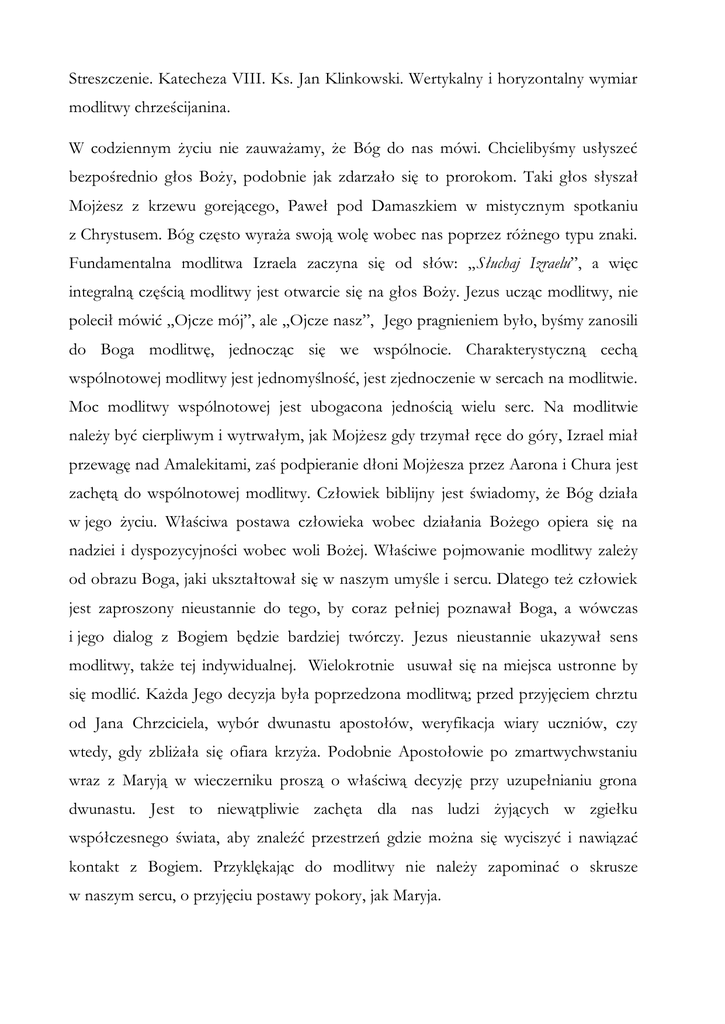 Streszczenie. Katecheza VIII. Ks. Jan Klinkowski. Wertykalny i