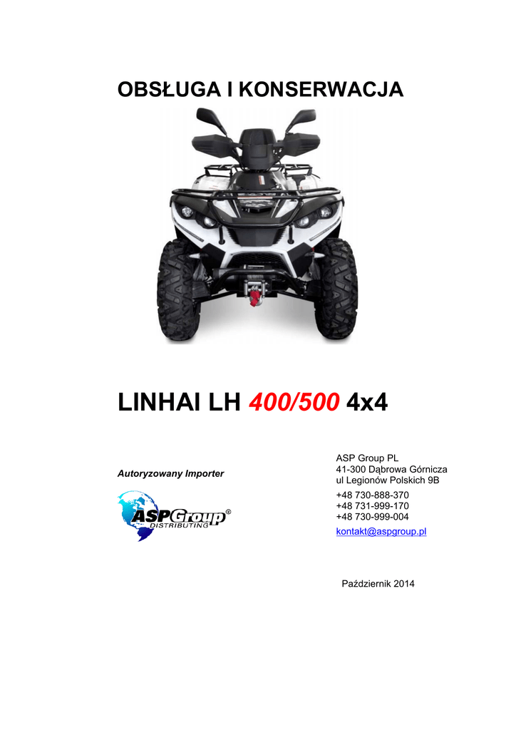 OBSŁUGA I KONSERWACJA LINHAI LH 400/500 4x4 Autoryzowany Importer ASP Group PL 41-300 Dąbrowa Górnicza ul Legionów Polskich 9B +48 730-888-370 +48 731-999-170 +48 730-999-004 [email protected] Październik 2014 Drogi Kliencie Gratulujemy zakupu Quad Linhai 400/500 4x4. W tym podręczniku znajdziesz wszystkie informacje niezbędne do prawidłowego działania, obsługi i konserwacji sprzętu, które zapewnią Ci satysfakcję oraz długoterminowe bezpieczne użytkowanie quada. Instrukcja zawiera ważne wskazówki dotyczące bezpieczeństwa. Oferuje podstawowe informacje techniczne, instrukcje jazdy, obsługi i konserwacji nowego ATV. Dla własnego bezpieczeństwa należy uważnie przeczytać wszystkie informacje, uwagi i ostrzeżenia zawarte w tej instrukcji oraz na etykietach znajdujących się na quadzie. Zawsze postępuj zgodnie ze wskazówkami zawartymi w instrukcji. Instrukcja zawiera informacje aktualne w momencie druku. Firma Linhai stale poprawia jakość i wydajność swoich pojazdów ATV, a zatem ilustracje i dane techniczne mogą różnić się od informacji zawartych w niniejszym dokumencie. W razie jakichkolwiek pytań dotyczących działania ATV, jego funkcji lub konserwacji, prosimy o kontakt z autoryzowanym dealerem marki Linhai. Niniejsza instrukcja zawiera ważne wskazówki dotyczące bezpieczeństwa. Zawiera podstawowe dane techniczne, instrukcje jazdy, obsługi i konserwacji nowego ATV. Dla własnego bezpieczeństwa zapoznaj się ze wszystkimi informacjami, instrukcjami i ostrzeżeniami zawartymi się w tej instrukcji, oraz na etykietach znajdujących się na quadzie. Zawsze stosuj się do zapisów zawartych w instrukcji. OSTRZEŻENIE: AWARIA MOŻE SPOWODOWAĆ POWAŻNE OBRAŻENIA CIAŁA LUB ŚMIERĆ. Należy pamiętać, że nie stosowanie się do wytycznych instrukcji może prowadzić do kumulacji niebezpiecznych sytuacji i powodować zagrożenie, nawet w przypadku wykonywania podstawowych manewrów. Instrukcję należy zachować. Życzymy wielu szczęśliwych km bez wypadków. Szczególnie ważne informacje są zaznaczone w podręczniku w następujący sposób: Ten symbol ostrzegawczy oznacza: UWAGA! Twoje bezpieczeństwo może być zagrożone! A OSTRZEŻENIE Niezastosowanie się do tych instrukcji może prowadzić do poważnych obrażeń ciała lub śmierci operatora, kierowcy, przechodniów lub osób postronnych. UWAGA Ten symbol oznacza ostrzeżenie przed czynnikami, które mogłyby doprowadzić do uszkodzenia ATV. ■ UWAGA Zawiera informacje wyjaśniające i ułatwiające korzystanie z ATV. Brak doświadczenia może stwarzać potencjalnie niebezpieczne sytuacje podczas jazdy! 2 Spis treści Dział Bezpieczeństwo Temat Informacje dotyczące bezpieczeństwa Ostrzeżenia dotyczące bezpieczeństwa Etykiety ostrzegawcze Ostrzeżenia na temat ryzyka Instalacja oryginalnych części zamiennych Bezpieczna jazda Odzież i sprzęt Sprawdź przed jazdą JAZDA NA QUADZIE Uruchamianie silnika Hamowanie / przystanki Docieranie silnika Aktywny sposób jazdy Jazda z obciążeniem Jazda z przyczepą Co należy wziąć ze sobą Bezpieczeństwo Numer VIN Urządzenia sterujące Wyświetlacz LCD Benzyna i olej Zalecane paliwo Olej silnikowy Serwis i konserwacja System chłodzenia Oleje smarownicze Wymiana oleju silnikowego i filtru paliwa Olej w skrzyni biegów Olej w tylnej osi Hamulce Gumowe elementy ochronne/Ogumienie Filtr powietrza Kontrolka filtra powietrza Akumulator Świece Regulacja kabla przepustnicy Opony Demontaż / montaż kół Regulacja zasięgu świateł Wymiana żarówek Reguralne okresy konserwacji Transport quada Przechowywanie quada Przygotowania przed sezonem Zapobieganie problemom Specyfikacje technieczne Numery identyfikacyjne 3 Strona 4 5 6 11 16 17 17 18 19 19 20 20 21 27 28 30 31 31 32 36 36 36 37 38 38 39 41 42 43 44 45 45 46 46 46 46 47 47 48 48 49 51 51 52 53 54 55 1. INFORMACJE DOTYCZĄCE BZEPIECZEŃSTWA Ta maszyna to nie zabawka, jej nieprawidłowe użytkowanie może być niebezpieczne. W nieznanym terenie, jedź powoli i ostrożnie. Krajobraz może szybko się zmienić. Dostosuj prędkość do trudnych warunków, śliskiej nawierzchni, bagnistego terenu. Przestrzegaj procedury prawidłowego pokonywania zakrętów opisanego w niniejszej instrukcji. Ćwicz technikę przy niższych prędkościach. Nie skręcaj z nadmierną prędkością. Po przewróceniu maszyny, upadku lub kolizji opuść jak najszybciej quad. Nie wolno jeździć na stokach, które są zbyt strome dla Ciebie lub Twojego quada. Rozpocznij jazdę pod górę trenując na mniejszych stokach przed przystąpieniem do wjazdów na bardziej strome wzgórza. Przestrzegaj prawidłowej procedury wjazdu na wzgórze opisane w niniejszej instrukcji. Przed rozpoczęciem jakiegokolwiek podjazdu na wzgórze, zawsze dokładnie zbadaj teren z góry. Nie wolno wspinać się na wzgórza o sypkich lub zbyt śliskich powierzchniach. Podczas jazdy pod górę nigdy gwałtownie nie przyśpieszaj, nie rób gwałtownych zmian w zakresie prowadzenia pojazdu. Nigdy nie używaj nadmiernej prędkości. Unikaj wzniesień, na których quad mogłyby się przewrócić. Jeśli to możliwe staraj się wjeżdżać na wzgórze w linii prostej. Zwracaj uwagę na prawidłowe procedury zjazdów opisane w niniejszej instrukcji. Przed rozpoczęciem jazdy zawsze dokładnie zbadaj teren. Nie należy zjerzdźać po zboczach o zbyt śliskim lub luźnym podłożu. Podczas jazdy w dół, nigdy nie rób przystanków i nie przyśpieszaj. Nigdy nie używaj nadmiernej prędkości. Jeśli to możliwe, staraj się zjeżdżać w lini prostej. Przy jeździe po wzgórzach zachowaj właściwą procedurę. Przed rozpoczęciem jakiegokolwiek przejazdu, zawsze dokładnie zbadaj teren. Nie wolno jeździć na stokach o zbyt śliskim lub zbyt luźnym podłożu. Podczas podjazdów przenieś ciężar masy ciała w stronę wzgórza. Podczas jazdy nie przyśpieszaj nagle. Nie wchodź w zakręty z nadmierną prędkością. Unikaj wzgórz, na których quad
