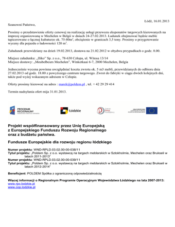 Łódź, 16.01.2013 Szanowni Państwo, Prosimy o przedstawienie oferty cenowej na realizację usługi przewozu eksponatów targowych kierowanych na imprezę organizowaną w Mechelen w Belgii w dniach 24-27.02.2013. Ładunek obejmować będzie meble tapicerowane o łącznej kubaturze ok. 75-80m3, obciążenie w granicach 3,5 tony. Prosimy o przygotowanie wyceny dla pojazdu o ładowności 120 m3. Załadunek przewidziany na dzień 19.02.2013, dostawa na 21.02.2012 w obydwu przypadkach o godz. 8.00. Miejsce załadunku: „Iliko” Sp. z o.o., 78-630 Człopa, ul. Witosa 13/14 Miejsce dostawy: „Meubelbeurs Mechelen”, Winketkaai 6-7, 2800 Mechelen, Belgia Jednocześnie wycena powinna uwzględniać koszta zwrotu ok. 5 m3 mebli, przewidzianych do odbioru dnia 27.02.2013 od godz. 18.00 z powyższego centrum targowego. Zwrot do fabryki w ciągu dwóch kolejnych dni, także pod wyżej wskazanym adresem w Człopie. Oferty prosimy kierować na adres : [email protected] , tel. + 42 29 29 414 Termin nadsyłania ofert mija 31.01.2013. Projekt współfinansowany przez Unię Europejską z Europejskiego Funduszu Rozwoju Regionalnego oraz z budżetu państwa. Fundusze Europejskie dla rozwoju regionu łódzkiego Numer projektu: WND-RPLD.03.02.00-00-038/11 Tytuł projektu: „Poldem Sp. z o.o. wystawcą na targach meblarskich w Sztokholmie, Mechelen oraz Brukseli w latach 2011-2013” Numer projektu: WND-RPLD.03.02.00-00-039/11 Tytuł projektu: „Poldem Sp. z o.o. wystawcą na targach meblarskich w Sztokholmie, Mechelen oraz Brukseli w latach 2012-2014” Beneficjent: POLDEM Spółka z ograniczoną odpowiedzialnością Więcej informacji o Regionalnym Programie Operacyjnym Województwa Łódzkiego na lata 2007-2013: www.rpo.lodzkie.pl www.cop.lodzkie.pl
