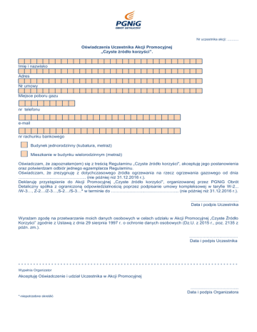 Nr uczestnika akcji: ………. Oświadczenia Uczestnika Akcji Promocyjnej „Czyste źródło korzyści”. Imię i nazwisko Adres Nr umowy Miejsce poboru gazu nr telefonu e-mail nr rachunku bankowego Budynek jednorodzinny (kubatura, metraż) Mieszkanie w budynku wielorodzinnym (metraż) Oświadczam, że zapoznałam(em) się z treścią Regulaminu „Czyste źródło korzyści", akceptuję jego postanowienia oraz potwierdzam odbiór jednego egzemplarza Regulaminu. Oświadczam, że zrezygnuję z dotychczasowego źródła ogrzewania na rzecz ogrzewania gazowego od dnia …………………...…………………... (nie później niż 31.12.2016 r.). Deklaruję przystąpienie do Akcji Promocyjnej „Czyste źródło korzyści", organizowanej przez PGNiG Obrót Detaliczny spółka z ograniczoną odpowiedzialnością poprzez podpisanie umowy kompleksowej w taryfie W-2... /W-3…, Z-2…/Z-3…,S-2…/S-3…* w terminie do …………………...…………………... (nie później niż 31.12.2016 r.). ………………………….... Data i podpis Uczestnika Wyrażam zgodę na przetwarzanie moich danych osobowych w celach udziału w Akcji Promocyjnej „Czyste Źródło Korzyści” zgodnie z Ustawą z dnia 29 sierpnia 1997 r. o ochronie danych osobowych (Dz.U. z 2015 r., poz. 2135 z późn. zm.). ………………….………… Data i podpis Uczestnika ------------------------------------------------------------------------Wypełnia Organizator Akceptuję Oświadczenie i udział Uczestnika w Akcji Promocyjnej ………………………….... Data i podpis Organizatora *-niepotrzebne skreślić REGULAMIN AKCJI PROMOCYJNEJ „Czyste źródło korzyści" organizowanej przez PGNiG Obrót Detaliczny Spółka z Ograniczoną Odpowiedzialnością, na obszarze Polski, dla Klientów którzy zmienią system ogrzewania, na gaz ziemny. § 1 POSTANOWIENIA OGÓLNE 1) Regulamin („Regulamin”) określa zasady udziału w Akcji Promocyjnej Organizatora pod nazwą „Czyste źródło korzyści” („Akcja Promocyjna”). 2) Organizatorem Akcji Promocyjnej jest PGNiG Obrót Detaliczny spółka z ograniczoną odpowiedzialnością, ul. Kasprzaka 25C, 01224 Warszawa, zarejestrowana w rejestrze przedsiębiorców Krajowego Rejestru Sądowego prowadzonym przez Sąd Rejonowy dla m. st. Warszawy, XII Wydział Gospodarczy Krajowego Rejestru Sądowego, pod nr KRS 0000488778, NIP: 527-27060-82, Regon: 147003421, posiadająca kapitał zakładowy w wysokości 600 050 000 zł („Organizator”). 3) Akcja Promocyjna jest prowadzona w granicach administracyjnych Rzeczpospolitej Polskiej, dla Klientów zmieniających system ogrzewania na gaz ziemny. 4) Uczestnikiem Akcji Promocyjnej może zostać każda osoba fizyczna posiadająca pełną zdolność do czynności prawnych, która spełni wskazane w Regulaminie warunki udziału w Akcji Promocyjnej („Uczestnik”). 5) Z tytułu udziału w Akcji Promocyjnej Uczestnik jest uprawniony do uzyskania nagrody na zasadach i w formie określonej w Regulaminie. 6) Akcja Promocyjna trwać będzie od 01.05.2016 roku do 31.12.2016 roku. § 2 WARUNKI UDZIAŁU 1) Warunkiem udziału w Akcji Promocyjnej jest łączne spełnienie następujących warunków: a) podpisanie i złożenie w okresie wskazanym w § 1 ust. 6 w placówce Organizatora Oświadczenia o przystąpieniu do Akcji Promocyjnej, b) zaakceptowanie warunków Regulaminu potwierdzone podpisem, c) brak zaległości w płatnościach wobec Organizatora w dniu złożenia Oświadczenia, d) złożenie oświadczenia (według wzoru w załączeniu) o rezygnacji z dotychczasowego źródła ogrzewania na rzecz ogrzewania gazowego 2) Uczestnik zobowiązuje się do: a) w przypadku nowych Klientów - zawarcia z Organizatorem kompleksowej umowy dostawy paliwa gazowego na cele grzewcze według grup taryfowych W-2x lub W-3x, Z-2x lub Z-3x, S-2x lub S-3x (według jednego z wzorów w załączeniu) przy wykorzystaniu przyłącza gazowego znajdującego się na obszarze objętym Akcją Promocyjną, w terminie od dnia 01.05.2016 r. do dnia 31.12.2016 r. b) w przypadku obecnych Klientów rozszerzenie dotychczasowej umowy o cele grzewcze, tj. zmiany grupy taryfowej z niższej na grupę W-2x lub W-3x, Z-2x lub Z-3x, S-2x lub S-3x („Umowa”), przy wykorzystaniu przyłącza gazowego znajdującego się na obszarze objętym Akcją Promocyjną, w terminie od dnia 01.05.2016 r. do dnia 31.12.2016 r. c) rezygnacji z dotychczasowego źródła ogrzewania na rzecz ogrzewania gazowego, d) nieprzerwanego odbierania paliwa gazowego z tytułu Umowy Organizatorem , przez okres 3 (trzech) lat od daty jej podpisania (przerwy techniczne w dostawie paliwa gazowego nie stanowią przerw w odbieraniu paliwa gazowego), e) zakupu paliwa gazowego z tytułu Umowy w okresie 3 (trzech) lat od jej zawarcia w łącznej ilości nie mniejszej niż: - 900 (dziewięćset) m3 dla taryf W-2 lub 3.600 (trzy tysiące sześćset) m³ dla W-3, - 1200 (tysiąc dwieście) m3 dla taryf Z-2 lub 4.800 (cztery tysiące osiemset) m³ dla Z-3, - 1200 (tysiąc dwieście) m3 dla taryf S-2 lub 4.800 (cztery tysiące osiemset) m³ dla S-3. f) braku zaległości w płatnościach wobec Organizatora powodujących konieczność rozwiązania Umowy w okresie 3 lat od daty jej podpisania; wypowiedzenie Umowy jest możliwe, gdy odbiorca zwleka z zapłatą za pobrane paliwo gazowe co najmniej miesiąc po upływie terminu płatności, pomimo uprzedniego powiadomienia na piśmie o zamiarze wypowiedzenia Umowy i wyznaczenia dodatkowego, 2-tygodniowego terminu do zapłaty zaległych i bieżących należności, g) rozpoczęcia użytkowania bezpłatnej aplikacji samoobsługi e-BOK. § 3 NAGRODY 1) Organizator z tytułu udziału w Akcji Promocyjnej przyznał 2.300 (dwa tysiące trzysta) jednorazowych nagród pieniężnych, dla 2.300 (dwóch tysięcy trzystu) pierwszych Uczestników, każda o wartości 500,00 (pięćset) zł, dla wybierających grupy taryfowe W-3/Z-3/S-3 lub 300,00 (trzysta) zł, dla wybier