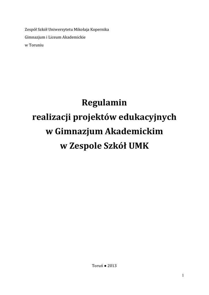 Zespół Szkół Uniwersytetu Mikołaja Kopernika Gimnazjum i Liceum Akademickie w Toruniu Regulamin realizacji projektów edukacyjnych w Gimnazjum Akademickim w Zespole Szkół UMK Toruń ● 2013 1 Rozdział I Ustalenia ogólne §1 1. Uczniowie mają obowiązek realizowania projektów edukacyjnych na podstawie §21a Rozporządzenia Ministra Edukacji Narodowej z dnia 30 kwietnia 2007 r. w sprawie warunków i sposobu oceniania, klasyfikowania i promowania uczniów i słuchaczy oraz przeprowadzania sprawdzianów i egzaminów w szkołach publicznych (Dz.U. Nr 83, poz. 562 z późn. zm.). 2. Szkoła stwarza warunki do realizacji uczniowskich projektów edukacyjnych, które mogą mieć charakter: przedmiotowy, międzyprzedmiotowy lub społecznoobywatelski, a czas ich trwania powinien wynosić od 2 tygodni do 7 miesięcy w zależności od problematyki i złożoności projektu. 3. Informację o udziale ucznia w realizacji projektu edukacyjnego oraz jego temat wpisuje się na świadectwie ukończenia gimnazjum, a do arkusza ocen dołącza się pisemną informację o udziale ucznia w realizacji projektu. Rozdział II Warunki realizacji projektu §2 1. Projekt edukacyjny jest zespołowym, planowym działaniem uczniów, mającym na celu rozwiązanie konkretnego problemu z zastosowaniem różnorodnych metod i form. 2. Zakres tematyczny projektu edukacyjnego może dotyczyć wybranych treści nauczania określonych w podstawie programowej dla gimnazjum lub wykraczać poza te treści. 3. Projekty realizowane są przez uczniów w klasie drugiej, a w szczególnych wypadkach ich realizacja może zostać dokończona lub przesunięta nie później niż do zakończenia pierwszego semestru nauki w klasie trzeciej. 4. Dyrektor Szkoły podejmuje decyzję o umożliwieniu uczniowi realizowania projektu edukacyjnego w klasie trzeciej gimnazjum na pisemną prośbę rodziców (prawnych opiekunów) ucznia.. 5. Uczeń może brać udział w realizacji więcej niż jednego projektu. 6. Uczeń biorący udział w realizacji więcej niż jednego projektu do 30 września roku szkolnego, w którym realizuje projekt wskazuje temat projektu, który zostanie wpisany na świadectwie ukończenia szkoły. 2 7. W roku szkolnym poprzedzającym rok szkolny, w którym realizowane są projekty edukacyjne wychowawcy klas pierwszych informują uczniów i ich rodziców o warunkach i zasadach realizacji projektów obowiązujących w Szkole. §3 1. Projekt edukacyjny jest realizowany przez zespół uczniów pod opieką nauczycielaopiekuna i obejmuje następujące działania: 1) wybór tematu projektu; 2) określenie celów projektu i zaplanowanie etapów jego realizacji; 3) wykonanie zaplanowanych działań; 4) publiczne przedstawienie rezultatów projektu; 5) ocenę i ewaluację projektu. 2. Uczniowie mogą realizować projekty w zespołach klasowych lub międzyklasowych liczących co najmniej 4 uczniów. 3. Sposób podziału na poszczególne zespoły projektowe odbywa się w sposób uwzględniający preferencje uczniów oraz możliwości nauczycieli i Szkoły. 4. Wyboru projektów należy dokonać do 15 czerwca roku szkolnego poprzedzającego rok szkolny, w którym projekt jest realizowany. 5. Przy wyborze tematyki projektu obowiązuje zasada dobrowolności, a jeden projekt może być realizowany niezależnie przez kilka zespołów uczniowskich. 6. Jeśli wystąpiły przyczyny, które uniemożliwiły realizację podjętego zadania w ramach realizacji projektu, dopuszcza się, w wyjątkowych sytuacjach: 1) modyfikację listy projektów realizowanych w trakcie danego roku szkolnego; 2) zmianę tematyki, terminów zakończenia i sposobu prezentacji projektu; 3) zmianę opiekuna (opiekunów) projektu. 7. Decyzję o zmianach w pracy nad projektami podejmuje koordynator projektów po konsultacji z opiekunem danego projektu i Dyrektorem Szkoły. §4 1. Końcowa ocena projektu i prezentacji projektu może być wyrażona stopniem szkolnym z jednego lub kilku przedmiotów, jeżeli projekt lub jego część związana jest z programem nauczania danego przedmiotu. Forma i kryteria oceny są znane uczniowi od samego początku pracy nad projektem. 2. Udział ucznia w projekcie ma wpływ na ocenę zachowania, zgodnie z zasadami ustalonymi w Wewnątrzszkolnym Systemie Oceniania. 3 3. Udział ucznia w projekcie jest potwierdzany na świadectwie ukończenia gimnazjum oraz w arkuszu ocen przez wpisanie tematu projektu oraz słów „uczestniczył” lub „uczestniczyła”. 4. W przypadku ucznia zwolnionego z realizacji projektu na świadectwie oraz w arkuszu ocen w odpowiednim miejscu wpisuje się „zwolniony” lub „zwolniona”. Rozdział III Zadania Dyrektora Szkoły §5 1. Dyrektor Szkoły w porozumieniu z Radą Pedagogiczną: 1) określa szczegółowe warunki realizacji projektu edukacyjnego zapisane w Regulaminie realizacji projektów edukacyjnych w Gimnazjum Akademickim w Zespole Szkół UMK, zwanym dalej Regulaminem; 2) powołuje szkolnego koordynatora projektów; 3) może zmienić zapisy niniejszego Regulaminu, dostosowując je do realiów i możliwości organizacyjnych Szkoły. 2. Dyrektor Szkoły może zwolnić ucznia z realizacji projektu edukacyjnego na udokumentowany pisemny wniosek rodziców (prawnych opiekunów) w szczególnie uzasadnionych przypadkach: 1) uczeń realizuje obowiązek szkolny poza szkołą; 2) uczeń jest nieobecny w szkole z powodów zdrowotnych lub losowych. 3. Dyrektor Szkoły rozstrzyga sytuacje problemowe mogące się pojawić podczas realizacji projektów edukacyjnych. Rozdział IV Zadania nauczycieli §6 1. Szkolny koordynator projektów: 1) zbiera propozycje tematów projektów, przedstawia je Dyrektorowi Szkoły i Radzie Pedagogicznej; 4 2) upowszechnia informacje na temat realizowanych projektów w sposób przyjęty w Szkole; 3) organizuje sposób wyboru projektu edukacyjnego przez uczniów; 4) wspiera merytorycznie i organizacyjnie opiekunów projektów; 5) monitoruje stan realizacji projektów; 6) kieruje org