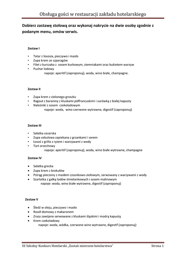 Obsługa gości w restauracji zakładu hotelarskiego Dobierz zastawę stołową oraz wykonaj nakrycie na dwie osoby zgodnie z podanym menu, omów serwis. Zestaw I • • • • Tatar z łososia, pieczywo i masło Zupa krem ze szparagów Filet z kurczaka z sosem kurkowym, ziemniakami oraz bukietem warzyw Puchar lodowy napoje: aperitif (zaproponuj), woda, wino białe, champagne. Zestaw II • • • Zupa krem z zielonego groszku Ragout z baraniny z kluskami półfrancuskimi i surówką z białej kapusty Naleśniki z sosem czekoladowym napoje: woda, wino czerwone wytrawne, digestif (zaproponuj) Zestaw III • • • • Sałatka cezarska Zupa cebulowa zapiekana z grzankami i serem Łosoś z grilla z ryżem i warzywami z wody Tort orzechowy napoje: aperitif (zaproponuj), woda, wino białe wytrawne, champagne Zestaw IV Sałatka grecka Zupa krem z brokułów Pstrąg pieczony z masłem czosnkowo-ziołowym, serwowany z warzywami z wody Szarlotka z gałką lodów śmietankowych i sosem malinowym napoje: woda, wino białe wytrawne, digestif (zaproponuj) Zestaw V Śledź w oleju, pieczywo i masło Rosół domowy z makaronem Zrazy zawijane serwowane z kluskami śląskimi i modrą kapustą Krem czekoladowy napoje: woda, wódka, czerwone wino wytrawne, digestif (zaproponuj) III Szkolny Konkurs Hotelarski „Zostań mistrzem hotelarstwa” Strona 1 Obsługa gości w restauracji zakładu hotelarskiego Zestaw VI Sałatka wiosenna z grzankami Halibut z sosem holenderskim i warzywami julienne Tiramisu napoje: woda, wino białe wytrawne, digestif (zaproponuj) Zestaw VII Zupa borowikowa z łazankami Filet z kaczki z sosem cydrowym serwowany z kluskami śląskimi i modrą kapustą Tort Sachera napoje: woda, wino czerwone wytrawne, digestif (zaproponuj) Zestaw VIII • • • Zupa krem z pomidorów z groszkiem ptysiowym Polędwiczki wieprzowe z prawdziwkami, serwowane z kopytkami i bukietem sałat Puchar lodowy napoje: aperifif (zaproponuj) , woda, wino czerwone wytrawne, wino musujące. Zestaw IX • • • consomme z paskami kurczaka polędwiczki z grilla serwowane z pieczonymi ziemniakami i szpinakiem krem waniliowy napoje: aperitif (zaproponuj), woda, wino czerwone wytrawne Zestaw X • • • bulion z kołdunami karczek z grilla serwowany z pieczonym ziemniakiem z dipem serowo-czosnkowym krem waniliowy napoje: aperitif (zaproponuj), woda, wino czerwone wytrawne. III Szkolny Konkurs Hotelarski „Zostań mistrzem hotelarstwa” Strona 2