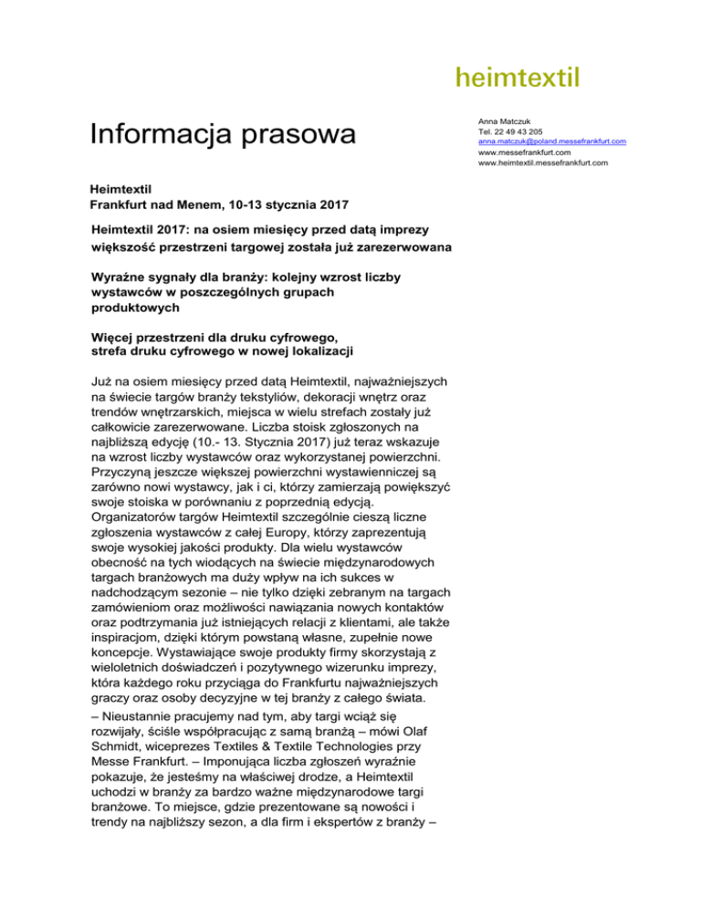 Informacja prasowa Anna Matczuk Tel. 22 49 43 205 [email protected] www.messefrankfurt.com www.heimtextil.messefrankfurt.com Heimtextil Frankfurt nad Menem, 10-13 stycznia 2017 Heimtextil 2017: na osiem miesięcy przed datą imprezy większość przestrzeni targowej została już zarezerwowana Wyraźne sygnały dla branży: kolejny wzrost liczby wystawców w poszczególnych grupach produktowych Więcej przestrzeni dla druku cyfrowego, strefa druku cyfrowego w nowej lokalizacji Już na osiem miesięcy przed datą Heimtextil, najważniejszych na świecie targów branży tekstyliów, dekoracji wnętrz oraz trendów wnętrzarskich, miejsca w wielu strefach zostały już całkowicie zarezerwowane. Liczba stoisk zgłoszonych na najbliższą edycję (10.- 13. Stycznia 2017) już teraz wskazuje na wzrost liczby wystawców oraz wykorzystanej powierzchni. Przyczyną jeszcze większej powierzchni wystawienniczej są zarówno nowi wystawcy, jak i ci, którzy zamierzają powiększyć swoje stoiska w porównaniu z poprzednią edycją. Organizatorów targów Heimtextil szczególnie cieszą liczne zgłoszenia wystawców z całej Europy, którzy zaprezentują swoje wysokiej jakości produkty. Dla wielu wystawców obecność na tych wiodących na świecie międzynarodowych targach branżowych ma duży wpływ na ich sukces w nadchodzącym sezonie – nie tylko dzięki zebranym na targach zamówieniom oraz możliwości nawiązania nowych kontaktów oraz podtrzymania już istniejących relacji z klientami, ale także inspiracjom, dzięki którym powstaną własne, zupełnie nowe koncepcje. Wystawiające swoje produkty firmy skorzystają z wieloletnich doświadczeń i pozytywnego wizerunku imprezy, która każdego roku przyciąga do Frankfurtu najważniejszych graczy oraz osoby decyzyjne w tej branży z całego świata. – Nieustannie pracujemy nad tym, aby targi wciąż się rozwijały, ściśle współpracując z samą branżą – mówi Olaf Schmidt, wiceprezes Textiles & Textile Technologies przy Messe Frankfurt. – Imponująca liczba zgłoszeń wyraźnie pokazuje, że jesteśmy na właściwej drodze, a Heimtextil uchodzi w branży za bardzo ważne międzynarodowe targi branżowe. To miejsce, gdzie prezentowane są nowości i trendy na najbliższy sezon, a dla firm i ekspertów z branży – od kupców przez projektantów i dekoratorów wnętrz aż po hotelarzy i architektów – impreza, na której po prostu trzeba być. Znane marki z całego świata oraz jeszcze więcej kategorii produktów Wśród wystawców, którzy już zarezerwowali dla siebie stoiska, znajdą się między innymi znani producenci materacy, tacy jak Frankenstolz czy Technogel Italia, a także renomowani producenci pościeli, tacy jak Lefebvre Textile czy Manterol. Wśród coraz liczniejszych firm z działu tkanin dekoracyjnych zgłosiło się już wielu nowych wystawców z Belgii i Stanów Zjednoczonych, w tym Bru Textiles, B&T Textilia, Burlington Technologies, P. Kaufmann, Van Moele Weavers oraz Weverij van Neder. Kolejnym działem Heimtextil, który przeżywa wyraźny wzrost, jest bielizna stołowa w hali 9.0, gdzie pojawią się nowi wystawcy, w tym Danto di Popolla Daniele z Włoch, Sav. Chatziargiriou & SIA EE oraz Yioi Theof Mavropoulou OE z Grecji, jak również Multitablecloth & Bed z Portugalii. Duży potencjał wzrostu dla druku cyfrowego, w tym roku w nowej lokalizacji – hali 6.0 Dzięki nowej lokalizacji w hali 6.0, druk cyfrowy zyskał nową przestrzeń do rozwoju. Światowi liderzy wśród producentów drukarek zaprezentują tu swoje innowacje i technologie dla branży tekstylnej. Oprócz znanych już wystawców, takich jak Epson, Hewlett Packard, Kiian, Mimaki czy MS Printing w roku 2017 pojawią się firmy nowe, w tym Matsui czy Schoeller Technocell. W strefie „Digital Print” w hali 6.0 na nowo zaprezentuje się również firma SPG Print. W roku 2017 koncepcja „Theme Park”, która w zeszłym roku zakończyła się dużym sukcesem, zostanie zrealizowana przez najstarszą na świecie agencję specjalizującą się w trendach, czyli Carlin International Na targach Heimtextil po raz trzeci z rzędu pojawi się strefa trendów pod nazwą „Theme Park”. Eksperci z francuskiej agencji do spraw trendów Carlin International pod kierownictwem firmy Exalis zaprezentuje w trakcie targów trendy na sezon 2017/2018, zebrane w różne światy trendów. Pierwsze wzmianki na temat najnowszych trendów są już dostępne dla zainteresowanych na stronie www.heimtextiltheme-park.com. Koncepcję „Theme Park”, prezentującą kierunki w wykorzystaniu trendów we wzornictwie, cenią sobie przybywający na tę imprezę eksperci, którzy odwiedzają ten punkt jako pierwszy na mapie frankfurckich targów. Strefa inspiracji znajduje się w położonej centralnie hali 6.0, którą na czas targów wypełniają tekstylia wystawców, których produkty można zamówić od razu na miejscu. Tegoroczne motto „Explorations” zabierze odwiedzających w fascynującą i zmysłową podróż, budząc w nich na nowo ducha odkrywcy, zwiedzającego strefę „Theme Park”, w której czekać będzie na nich bogactwo innowacyjnych materiałów, faktur i wzorów, zachęcających do spojrzenia na Heimtextil świeżym okiem. Wizyta na Heimtextil jako nieustanna podróż Organizatorzy Heimtextil za punkt orientacyjny oraz impuls do działania przyjęli niezwykle przyszłościowy temat, jakim jest zrównoważony rozwój: W hali 8.0 ponownie pojawi się zielona wioska „Green Village”. Ze względu na duże zapotrzebowanie ponownie pojawi się możliwość odbycia wycieczki po targach pod hasłem „Green Tour”. Uczestnicy zostaną oprowadzeni po stoiskach tych firm, które wyróżnia oferta produktów czy koncepcji kładących szczególny nacisk na dbałość o środowisko naturalne i sprawy społeczne. Jedź z nami na targi Heimtextil 2017 do Frankfurtu nad Menem! Kompleksowa oferta wyjazdu: wycieczka samolotowa lub autokarowa dostępna na