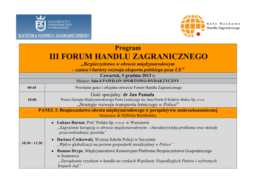 Program III FORUM HANDLU ZAGRANICZNEGO „Bezpieczeństwo w obrocie międzynarodowym – szanse i bariery rozwoju eksportu polskiego poza UE” Czwartek, 5 grudnia 2013 r. Miejsce: Sala 8 PAWILON SPORTOWO-DYDAKTYCZNY Powitanie gości i oficjalne otwarcie Forum Handlu Zagranicznego 09:45 Gość specjalny: dr Jan Pamuła Prezes Zarządu Międzynarodowego Portu Lotniczego im. Jana Pawła II Kraków-Balice Sp. z o.o. 10:00 „Strategie rozwoju transportu lotniczego w Polsce” PANEL I: Bezpieczeństwo obrotu międzynarodowego w perspektywie makroekonomicznej Moderator: dr Elżbieta Bombińska Łukasz Burnat, PwC Polska Sp. z o.o. w Warszawie „Zagrożenie korupcją w obrocie międzynarodowym - charakterystyka problemu oraz metody przeciwdziałania zjawisku” 10:30 - 11:30 Dariusz Ćwikowski, Wyższa Szkoła Policji w Szczytnie „Wpływ globalizacji na poziom gospodarki nieoficjalnej w Polsce” Roman Dryps, Międzynarodowe Konsorcjum Platforma Bezpieczeństwa Gospodarczego w Sosnowcu „Zarządzanie ryzykiem w handlu na rynkach Wspólnoty Niepodległych Państw i wybranych krajach Azji” PANEL II: Bezpieczeństwo obrotu międzynarodowego w perspektywie mikroekonomicznej Moderator: dr Agnieszka Głodowska Kamil Dziduszko, BRE Bank „Bezpieczne formy rozliczania transakcji w handlu zagranicznym z wykorzystaniem akredytywy dokumentowej” 11:30 – 12:30 Ewa Kwiecień, KUKE S.A. „Nowe zasady zabezpieczeń polskich eksporterów na rynkach podwyższonego ryzyka z wykorzystaniem polis KUKE S.A. Wojciech Trzeniec, Raiffeisen Polbank „Możliwości zabezpieczeń walutowych dla eksporterów” 12:30 – 12:45 Przerwa kawowa PANEL III: Szanse i bariery rozwoju eksportu polskiego poza UE w kontekście bezpieczeństwa obrotu międzynarodowego Moderator: dr Agnieszka Hajdukiewicz Adrian Synoradzki, Ceramika PARADYŻ „Szanse na rozwój polskiego eksportu w Katarze i Arabii Saudyjskiej” 12:45 – 13:45 Grzegorz Gołojuch, Siniu „O certyfikacji produktów w Chinach na przykładzie branży kosmetycznej” Filip Jarmakowski, COIE w Małopolsce „Formy wsparcia polskich eksporterów na rynkach poza UE przez COIE” DEBATA „O szansach i barierach rozwoju eksportu polskiego w UE i poza UE” Moderator: prof. dr hab. Stanisław Wydymus Studenci Koła Naukowego Handlu Zagranicznego, których wesprą: 13:45 – 14:45 14:45 15:00 dr Wojciech Zysk „opcja UE” Aneta Bucher Aleksander Dziurhaliuk Artur Janoszek Ewa Kasicka Monika Koczar Piotr Krauzowicz Elżbieta Malata Agnieszka Marchlewska Natalia Ostachowska Artur Stodolski dr Adam Michalik „opcja poza UE” Łukasz Andrych Mariola Bochenek Krystian Bigos Adrianna Chmura Sylwia Cisak Ilona Jasionek Adrian Legutko Katarzyna Lorenz Agnieszka Mielczarek Beata Wylaź Oficjalne zakończenie Forum Handlu Zagranicznego Obiad dla zaproszonych gości (Stołówka, Paw. USTRONIE)