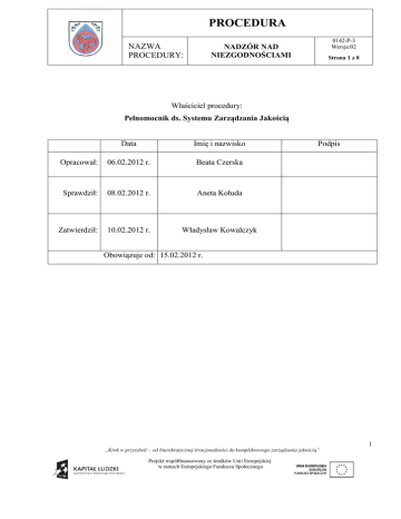 PROCEDURA 0142-P-3 Wersja:02 NADZÓR NAD NIEZGODNOŚCIAMI NAZWA PROCEDURY: Strona 1 z 8 Właściciel procedury: Pełnomocnik ds. Systemu Zarządzania Jakością Data Imię i nazwisko Opracował: 06.02.2012 r. Beata Czerska Sprawdził: 08.02.2012 r. Aneta Kołuda Zatwierdził: 10.02.2012 r. Władysław Kowalczyk Podpis Obowiązuje od: 15.02.2012 r. „Krok w przyszłość – od biurokratycznej irracjonalności do kompleksowego zarządzania jakością” Projekt współfinansowany ze środków Unii Europejskiej w ramach Europejskiego Funduszu Społecznego 1 PROCEDURA NAZWA PROCEDURY: NADZÓR NAD NIEZGODNOŚCIAMI 0142-P-3 Wersja:02 Strona 2 z 8 1. Cel. Celem Procedury jest dostarczenie wytycznych, a także ustalenie odpowiedzialności w zakresie realizacji działań korekcyjnych zapewniających odpowiedni nadzór nad niezgodnościami. 2. Zakres stosowania. Procedura ma zastosowanie w całym Urzędzie Gminy Bierzwnik. 3. Definicje i skróty. Działanie korekcyjne (naprawcze) - działanie podejmowane w celu wyeliminowania niezgodności Odpowiedzialny za obszar – osoba odpowiedzialna za dany zakres tematyczny. Odpowiedzialnym za obszar będą m.in.: członkowie Kierownictwa i właściciele procesów. Urząd – Urząd Gminy Bierzwnik KKO – Kierownik komórki organizacyjnej/Samodzielne stanowisko pracy „Krok w przyszłość – od biurokratycznej irracjonalności do kompleksowego zarządzania jakością” Projekt współfinansowany ze środków Unii Europejskiej w ramach Europejskiego Funduszu Społecznego 2 PROCEDURA NAZWA PROCEDURY: 0142-P-3 Wersja:02 NADZÓR NAD NIEZGODNOŚCIAMI 4. Postępowanie. Strona 3 z 8 Odpowiedzialność 4.1. Nadzór nad niezgodnościami. 4.1.1. Niezgodności dzielone są na dwie kategorie: a. Niezgodności dotyczące procesów, b. Niegodności dotyczące produktów/usług publicznych. 4.2. każdy Pracownik/ KKO Zasady ogólne. „Krok w przyszłość – od biurokratycznej irracjonalności do kompleksowego zarządzania jakością” Projekt współfinansowany ze środków Unii Europejskiej w ramach Europejskiego Funduszu Społecznego 3 PROCEDURA NAZWA PROCEDURY: NADZÓR NAD NIEZGODNOŚCIAMI 0142-P-3 Wersja:02 Strona 4 z 8 4.2.1. Postępowania zgodnego z niniejszą Procedurą nie wymagają produkty, które nie zostały przedstawione do formalnej weryfikacji (aprobaty, zatwierdzenia). Zatem np. wersje robocze, przedstawione do konsultacji, wymieniane uwagi i opinie (z wyłączeniem opinii prawnych) należy traktować jako element procesu przygotowania produktu. Stosując niniejszą Procedurę należy zachować racjonalność, która oznacza, że nie należy podejmować działań nadmiarowych, nie dających zakładanych efektów. W związku z powyższym, jak również biorąc pod uwagę specyfikę działalności administracji publicznej nie wszystkie poprawy/korekty będą związane z wystąpieniem niezgodności. Jeżeli wystąpi potrzeba wprowadzenia poprawek do dokumentów po etapie ich weryfikacji lub na tym etapie, które to poprawki wprowadzane są w celu udoskonalenia produktu i nie są kwalifikowane jako niezgodności niniejsza Procedura nie ma zastosowania. Przykładami takich poprawek mogą być zmiany stylistyczne (np. przygotowany dokument jest zgodny z obowiązującymi w danym zakresie wymaganiami, ale propozycje zmian zapewnią większą jego czytelność). W przypadku, gdy zakwalifikowanie poprawy jako niezgodności oraz potrzeba zastosowania niniejszej Procedury może budzić wątpliwości decyzję o kwalifikacji działania podejmuje osoba mająca odpowiednie uprawnienie (w praktyce będą to najczęściej KKO). W takim przypadku osoba mająca uprawnienia, aby polecić poprawki określa ich status. W przypadku ich zaklasyfikowania jako niezgodności wskazuje to przez naniesienie adnotacji „niezgodne”. Każdy Pracownik ma obowiązek zgłosić do osoby odpowiedzialnej za obszar zidentyfikowane niezgodności. „Krok w przyszłość – od biurokratycznej irracjonalności do kompleksowego zarządzania jakością” Projekt współfinansowany ze środków Unii Europejskiej w ramach Europejskiego Funduszu Społecznego 4 PROCEDURA NAZWA PROCEDURY: 4.3. Strona 5 z 8 Występowanie niezgodności. 4.3.1. Niezgodności mogą wystąpić: - w trakcie realizacji procesów (np. wykonywanie działań w sposób niezgodny z ustaleniami zawartymi w dokumentach wewnętrznych, zewnętrznych, Procedurach) lub - po zakończeniu realizacji procesów (np. uzyskanie wartości miernika określającego realizację celu poniżej oczekiwanej wartości, wydana nieprawidłowa decyzja administracyjna, przesłanie wadliwego projektu uchwały do Rady Gminy). 4.3.2. Niezgodności, które mogą wystąpić w trakcie realizacji procesu są wykrywane i eliminowane bezpośrednio po ich wystąpieniu zgodnie z ogólnymi zasadami wynikającymi z praktyki administracyjnej i regulaminu organizacyjnego (powrót do referenta, korekta i ponowne sprawdzenie oraz zatwierdzenie przez osoby uprawnione). 4.4. 0142-P-3 Wersja:02 NADZÓR NAD NIEZGODNOŚCIAMI każdy Pracownik Postępowanie z niezgodnościami. 4.4.1. Znaczna część produktów/usług niezgodnych, które potencjalnie mogą wystąpić w Urzędzie posiada stosowne uregulowania dotyczące sposobu postępowania z nimi zawarte w przepisach prawa, w szczególności takich jak: - ustawa - Kodeks postępowania administracyjnego; - ustawa - Ordynacja podatkowa; - ustawa o rachunkowości; - ustawa - Prawo zamówień publicznych; - ustawa - Kodeks postępowania cywilnego. każdy Pracownik „Krok w przyszłość – od biurokratycznej irracjonalności do kompleksowego zarządzania jakością” Projekt współfinansowany ze środków Unii Europejskiej w ramach Europejskiego Funduszu Społecznego 5 PROCEDURA NAZWA PROCEDURY: NADZÓR NAD NIEZGODNOŚCIAMI 0142-P-3 Wersja:02 Strona 6 z 8 4.4.2. Niezależnie od rodzaju niezgodności działania korekcyjne powinny przebiegać według następującego modelu: a) identyfikacja niezgodności, w tym produk