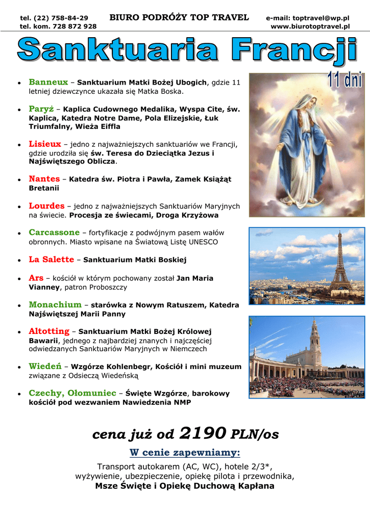 tel. (22) 758-84-29 tel. kom. 728 872 928 BIURO PODRÓŻY TOP TRAVEL e-mail: [email protected] www.biurotoptravel.pl Banneux – Sanktuarium Matki Bożej Ubogich, gdzie 11 letniej dziewczynce ukazała się Matka Boska. Paryż – Kaplica Cudownego Medalika, Wyspa Cite, św. Kaplica, Katedra Notre Dame, Pola Elizejskie, Łuk Triumfalny, Wieża Eiffla Lisieux – jedno z najważniejszych sanktuariów we Francji, gdzie urodziła się św. Teresa do Dzieciątka Jezus i Najświętszego Oblicza. Nantes – Katedra św. Piotra i Pawła, Zamek Książąt Bretanii Lourdes – jedno z najważniejszych Sanktuariów Maryjnych na świecie. Procesja ze świecami, Droga Krzyżowa Carcassone – fortyfikacje z podwójnym pasem wałów obronnych. Miasto wpisane na Światową Listę UNESCO La Salette – Sanktuarium Matki Boskiej Ars – kościół w którym pochowany został Jan Maria Vianney, patron Proboszczy Monachium – starówka z Nowym Ratuszem, Katedra Najświętszej Marii Panny Altotting – Sanktuarium Matki Bożej Królowej Bawarii, jednego z najbardziej znanych i najczęściej odwiedzanych Sanktuariów Maryjnych w Niemczech Wiedeń – Wzgórze Kohlenbegr, Kościół i mini muzeum związane z Odsieczą Wiedeńską Czechy, Ołomuniec – Święte Wzgórze, barokowy kościół pod wezwaniem Nawiedzenia NMP cena już od 2190 PLN/os W cenie zapewniamy: Transport autokarem (AC, WC), hotele 2/3*, wyżywienie, ubezpieczenie, opiekę pilota i przewodnika, Msze Święte i Opiekę Duchową Kapłana