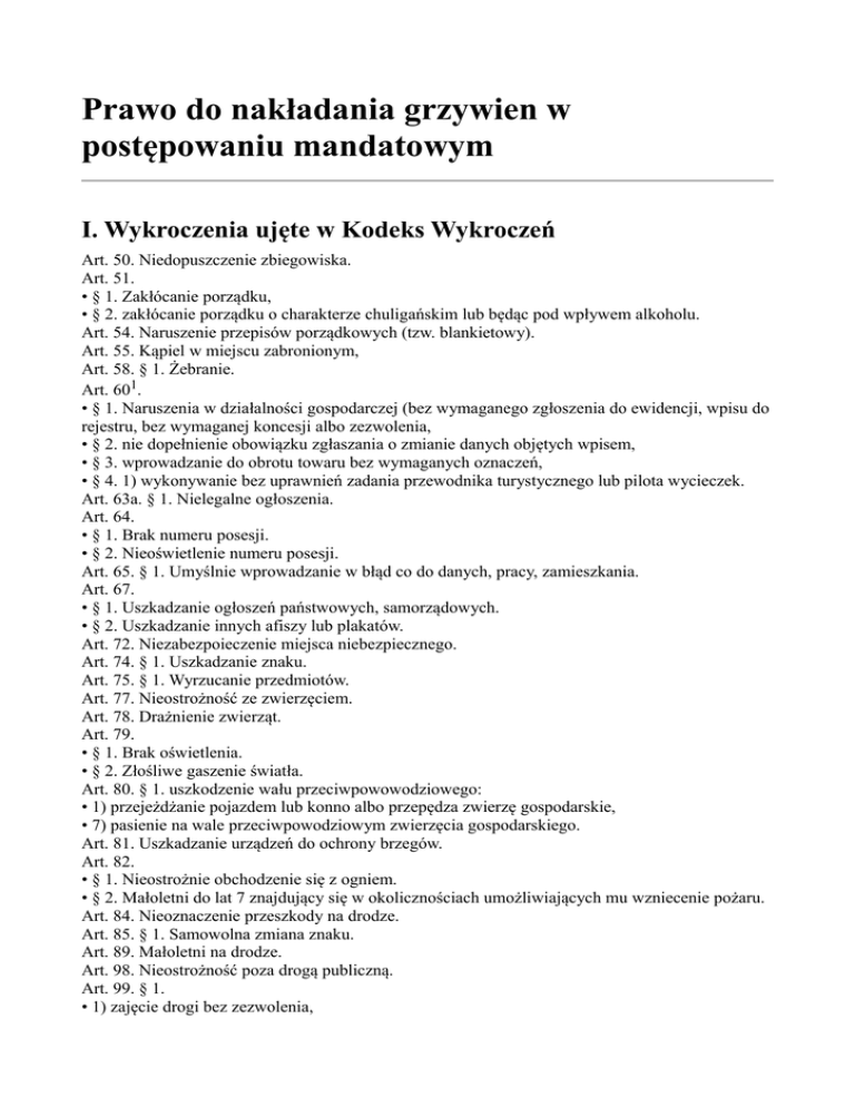 Prawo do nakładania grzywien w postępowaniu mandatowym I. Wykroczenia ujęte w Kodeks Wykroczeń Art. 50. Niedopuszczenie zbiegowiska. Art. 51. • § 1. Zakłócanie porządku, • § 2. zakłócanie porządku o charakterze chuligańskim lub będąc pod wpływem alkoholu. Art. 54. Naruszenie przepisów porządkowych (tzw. blankietowy). Art. 55. Kąpiel w miejscu zabronionym, Art. 58. § 1. Żebranie. Art. 601. • § 1. Naruszenia w działalności gospodarczej (bez wymaganego zgłoszenia do ewidencji, wpisu do rejestru, bez wymaganej koncesji albo zezwolenia, • § 2. nie dopełnienie obowiązku zgłaszania o zmianie danych objętych wpisem, • § 3. wprowadzanie do obrotu towaru bez wymaganych oznaczeń, • § 4. 1) wykonywanie bez uprawnień zadania przewodnika turystycznego lub pilota wycieczek. Art. 63a. § 1. Nielegalne ogłoszenia. Art. 64. • § 1. Brak numeru posesji. • § 2. Nieoświetlenie numeru posesji. Art. 65. § 1. Umyślnie wprowadzanie w błąd co do danych, pracy, zamieszkania. Art. 67. • § 1. Uszkadzanie ogłoszeń państwowych, samorządowych. • § 2. Uszkadzanie innych afiszy lub plakatów. Art. 72. Niezabezpoieczenie miejsca niebezpiecznego. Art. 74. § 1. Uszkadzanie znaku. Art. 75. § 1. Wyrzucanie przedmiotów. Art. 77. Nieostrożność ze zwierzęciem. Art. 78. Drażnienie zwierząt. Art. 79. • § 1. Brak oświetlenia. • § 2. Złośliwe gaszenie światła. Art. 80. § 1. uszkodzenie wału przeciwpowowodziowego: • 1) przejeżdżanie pojazdem lub konno albo przepędza zwierzę gospodarskie, • 7) pasienie na wale przeciwpowodziowym zwierzęcia gospodarskiego. Art. 81. Uszkadzanie urządzeń do ochrony brzegów. Art. 82. • § 1. Nieostrożnie obchodzenie się z ogniem. • § 2. Małoletni do lat 7 znajdujący się w okolicznościach umożliwiających mu wzniecenie pożaru. Art. 84. Nieoznaczenie przeszkody na drodze. Art. 85. § 1. Samowolna zmiana znaku. Art. 89. Małoletni na drodze. Art. 98. Nieostrożność poza drogą publiczną. Art. 99. § 1. • 1) zajęcie drogi bez zezwolenia, • 2) niszczenie lub uszkadzanie drogi publicznej, • 3) usuwanie lub niszczenie zasłon odśnieżnych, • 4) prowadzenie robót w pasie drogowym bez zezwolenia. Art. 100. 1) Uszkodzenie drogi, rowy przydrożne. Art. 101. Nieoczyszczenie drogi. Art. 102. Zaniedbanie stanu zjazdu z dróg publicznych do przyległych nieruchomości. Art. 104. Skłania do żebrania małoletniego. Art. 108. Szczucie psem człowieka. Art. 112. Nieprzestrzegania wymagań sanitarnych w handlu okrężnym. Art. 117. Niezachowanie czystości na nieruchomości. Art. 137. § 1. Nieuwidocznienie ceny. Art. 140. Nieobyczajny wybryk. Art. 141. Nieprzyzwoite napisy. Art. 143. § 1. Utrudnianie z korzystania z urządzeń. Art. 144. • § 1. Niszczenie roślinności. • § 2. Niszczenie lub uszkadzanie drzew lub krzewów. Art. 145. Zaśmiecanie. Art. 153. § 1. Drobne szkody leśne. Art. 161. Wjazd pojazdem do lasu. Art. 162. § 1. zanieczyszczanie lasu. Art. 166. Puszczanie luzem psa w lesie. II. Wykroczenia ujęte w innych aktach prawnych Ustawa o ewidencji ludności i dowodach osobistych Art. 55. 1. • 1) uchylanie się od obowiązku posiadania lub wymiany dowodu osobistego, • 2) zatrzymywanie cudzego dowodu osobistego, • 3) nie zwrócenie dowodu osobistego w razie utraty obywatelstwa polskiego. Ustawa Przepisy wprowadzające Kodeks Pracy Art.XII § 2. brak informacji o godzinach handlu. Ustawa o wychowaniu w trzeźwości i przeciwdziałaniu alkoholizmowi Art. 431. • 1. Spożywanie alkoholu w miejscach publicznych, • 2. Usiłowanie spożywania alkoholu. Art. 45. Brak informacji o szkodliwości spożywania alkoholu. Ustawa o ochronie zdrowia przed następstwami używania tytoniu i wyrobów tytoniowych Art. 13. 1. Sprzedaż wyrobów tytoniowych wbrew zakazom. Ustawa o utrzymaniu czystości i porządku w gminach. Art. 10. • 2. Nie wykonywanie obowiązków wymienionych w art. 5 ust. 1 • 2a. nie wykonywanie obowiązków określonych w regulaminie. Ustawa Ordynacja wyborcza do Sejmu Rzeczypospolitej Polskiej i do Senatu RP Art. 220. • 1) naruszanie ciszy wyborczej, • 2) umieszczanie plakatów i haseł w miejscach niedozwolonych. Ustawa Ordynacja wyborcza do rad gmin, rad powiatów i sejmików województw Art. 199a. • 1. umieszczanie plakatów w sposób zabronionym, • 2. nieusunięcie plakatów po wyborach. Ustawa o odpadach Art. 70. Magazynowanie lub składowanie odpadów w miejscu niedozwolonym. Art. 71. Spalanie odpadów poza instalacjami. Art. 75a. Skup metali bez zarejestrowania w książce. Ustawa Prawo o miarach Art. 26. 1. 3) brak legalizacji. Ustawa o ochronie zdrowia zwierząt oraz zwalczaniu chorób zakaźnych zwierząt Art. 85 1a. brak szczepienia przeciwko wściekliźnie. Ustawa o ochronie przyrody Art. 131. • 6) uszkadzanie korzeni przy wykonywaniu prac ziemnych, • 12) wypalanie łąki, pastwiska itp. Ustawa o recyklingu pojazdów wycofanych z eksploatacji Art. 48. Nie przekazanie pojazdu wycofanego z eksploatacji do stacji demontażu. Art. 50. Demontaż pojazdu poza stacją. Ustawa o zużytym sprzęcie elektrycznym i elektronicznym Art. 73. Nie oddanie zużytego sprzętu. Art. 74. Umieszczanie zużytego sprzętu z innymi odpadami. Akty prawa miejscowego - Uchwały Rady Miasta, Rozporządzenie Wojewody Ustawa Kodeks Wykroczeń w zakresie uprawnienia do kontroli ruchu drogowego Art. 88. Jazda bez oświetlenia. Art. 90. Tamowanie ruchu. Art. 91. Zanieczyszczanie drogi. Art. 92. § 1. Niestosowanie się do znaków drogowych. Art. 94. • § 1. Prowadzenie bez uprawnień. • § 2. Prowadzenie pojazdu niedopuszczonego do ruchu. Art. 95. Kierowanie pojazdem bez posiadanie przy sobie wymaganych dokumentów. Art. 96. § 1. 2) dopuszczenie do kierowania pojazdem osoby mniemającej wymaganych uprawnień. Art. 97. Inne naruszenie drogowe (blankietowy)