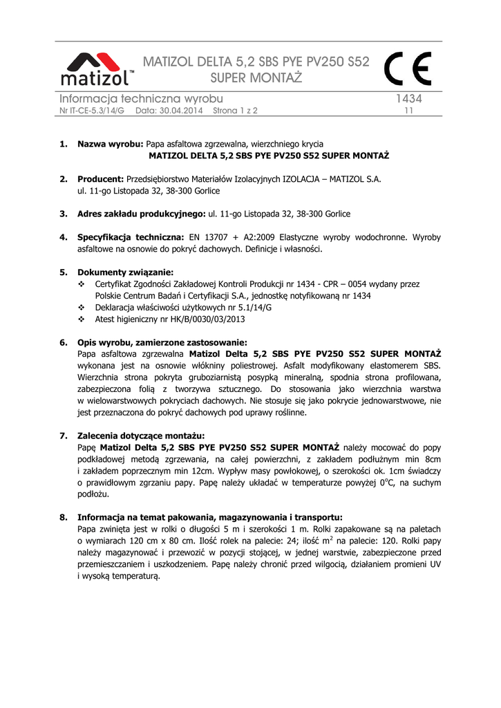 MATIZOL DELTA 5,2 SBS PYE PV250 S52 SUPER MONTAŻ Informacja techniczna wyrobu Nr IT-CE-5.3/14/G Data: 30.04.2014 Strona 1 z 2 1434 11 1. Nazwa wyrobu: Papa asfaltowa zgrzewalna, wierzchniego krycia MATIZOL DELTA 5,2 SBS PYE PV250 S52 SUPER MONTAŻ 2. Producent: Przedsiębiorstwo Materiałów Izolacyjnych IZOLACJA – MATIZOL S.A. ul. 11-go Listopada 32, 38-300 Gorlice 3. Adres zakładu produkcyjnego: ul. 11-go Listopada 32, 38-300 Gorlice 4. Specyfikacja techniczna: EN 13707 + A2:2009 Elastyczne wyroby wodochronne. Wyroby asfaltowe na osnowie do pokryć dachowych. Definicje i własności. 5. Dokumenty związanie: Certyfikat Zgodności Zakładowej Kontroli Produkcji nr 1434 - CPR – 0054 wydany przez Polskie Centrum Badań i Certyfikacji S.A., jednostkę notyfikowaną nr 1434 Deklaracja właściwości użytkowych nr 5.1/14/G Atest higieniczny nr HK/B/0030/03/2013 6. Opis wyrobu, zamierzone zastosowanie: Papa asfaltowa zgrzewalna Matizol Delta 5,2 SBS PYE PV250 S52 SUPER MONTAŻ wykonana jest na osnowie włókniny poliestrowej. Asfalt modyfikowany elastomerem SBS. Wierzchnia strona pokryta gruboziarnistą posypką mineralną, spodnia strona profilowana, zabezpieczona folią z tworzywa sztucznego. Do stosowania jako wierzchnia warstwa w wielowarstwowych pokryciach dachowych. Nie stosuje się jako pokrycie jednowarstwowe, nie jest przeznaczona do pokryć dachowych pod uprawy roślinne. 7. Zalecenia dotyczące montażu: Papę Matizol Delta 5,2 SBS PYE PV250 S52 SUPER MONTAŻ należy mocować do popy podkładowej metodą zgrzewania, na całej powierzchni, z zakładem podłużnym min 8cm i zakładem poprzecznym min 12cm. Wypływ masy powłokowej, o szerokości ok. 1cm świadczy o prawidłowym zgrzaniu papy. Papę należy układać w temperaturze powyżej 0 oC, na suchym podłożu. 8. Informacja na temat pakowania, magazynowania i transportu: Papa zwinięta jest w rolki o długości 5 m i szerokości 1 m. Rolki zapakowane są na paletach o wymiarach 120 cm x 80 cm. Ilość rolek na palecie: 24; ilość m 2 na palecie: 120. Rolki papy należy magazynować i przewozić w pozycji stojącej, w jednej warstwie, zabezpieczone przed przemieszczaniem i uszkodzeniem. Papę należy chronić przed wilgocią, działaniem promieni UV i wysoką temperaturą. MATIZOL DELTA 5,2 SBS PYE PV250 S52 SUPER MONTAŻ Informacja techniczna wyrobu Nr IT-CE-5.3/14/G 9. Data: 30.04.2014 1434 Strona 2 z 2 11 Deklarowane właściwości użytkowe Lp. Zasadnicze charakterystyki 1. Oddziaływanie ognia zewnętrznego 2. Reakcja na ogień 3. Wodoszczelność w 10 kPa Maksymalna siłą rozciągająca 4. - kierunek wzdłuż - kierunek w poprzek Wydłużenie przy maksymalnej sile rozciągającej 5. - kierunek wzdłuż - kierunek w poprzek 6. Odporność na przerastanie korzeni 7. Odporność na obciążenie statyczne Właściwości użytkowe NPD Klasa E Wynik pozytywny (900 ± 200) N/50mm (700 ± 200) N/50mm (65 ± 15) % (65 ± 15) % NPD NPD 8. Odporność na uderzenie NPD 9. Wytrzymałość na rozdzieranie gwoździem NPD 10. Wytrzymałość złącza 11. Trwałość 12. Giętkość w niskiej temperaturze 13. Substancje niebezpieczne Zharmonizowana specyfikacja techniczna EN 13707:2004+A2:2009 NPD (90 ± 10) oC ≤ - 15 oC spełnia normę 10. Inne właściwości Lp. Właściwości Wymiary - długość 1. - szerokość - prostoliniowość 2. Grubość w pasie z posypką Odporność na spływanie w podwyższonej 3. temperaturze Wymagania ≥ 5,0 m ≥0,99 m (1,00 ± 0,01) ≤ 10mm/5m (5,2 ± 0,2) mm o ≥ 90 C 4. Stabilność wymiarów ≤ 0,5 % 5. Przyczepność posypki (15 ± 10) % Metody badań PN-EN 1848-1:2002 PN-EN 1849-1:2002 PN-EN 1110:2011 PN-EN 1107-1:2001 metoda B PN-EN 12039:2001